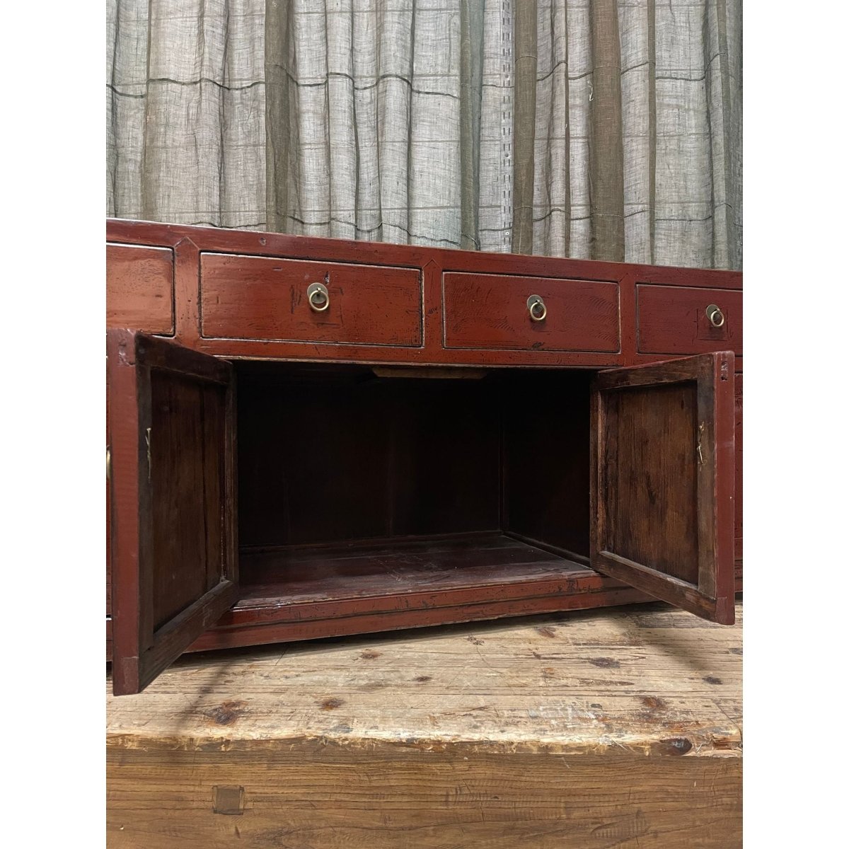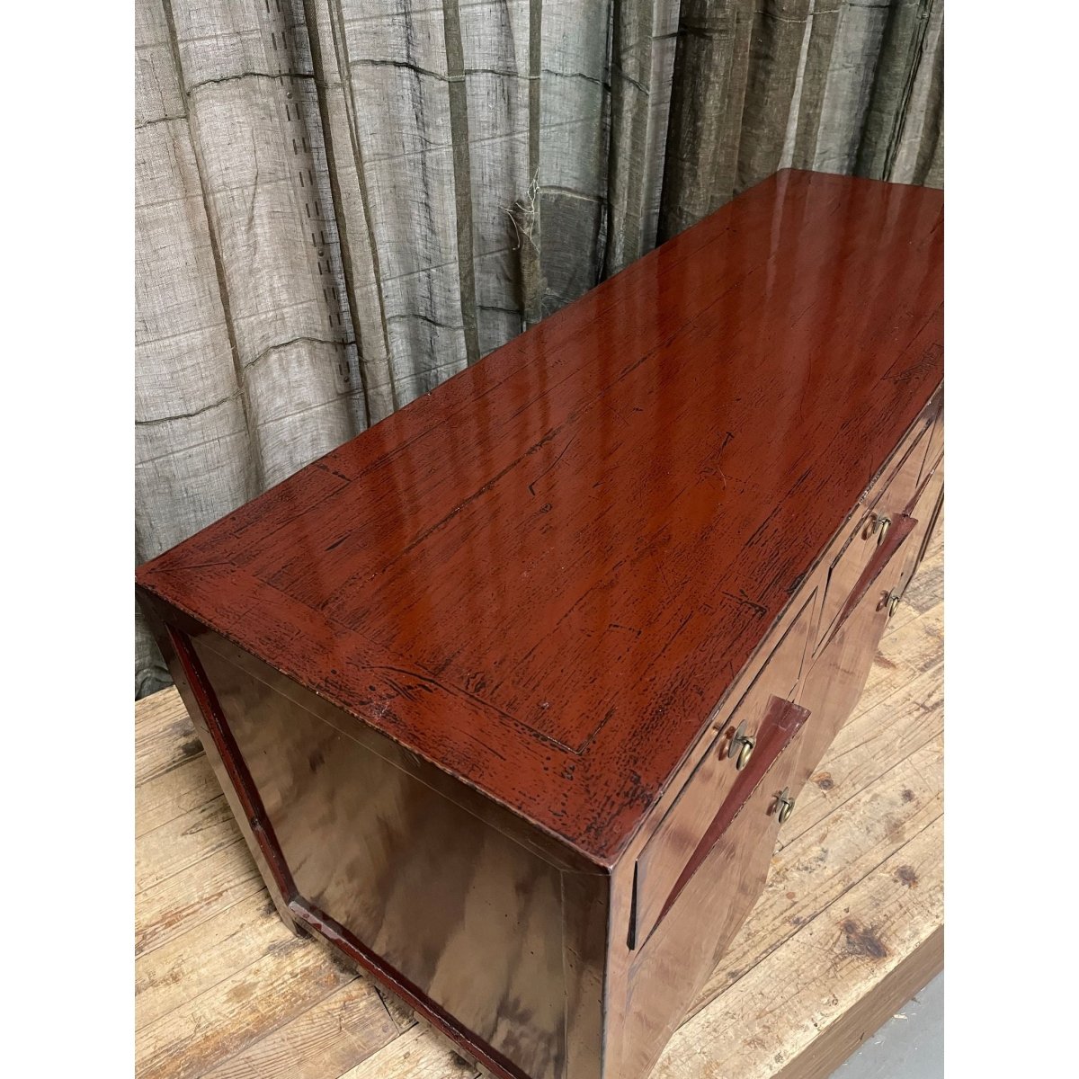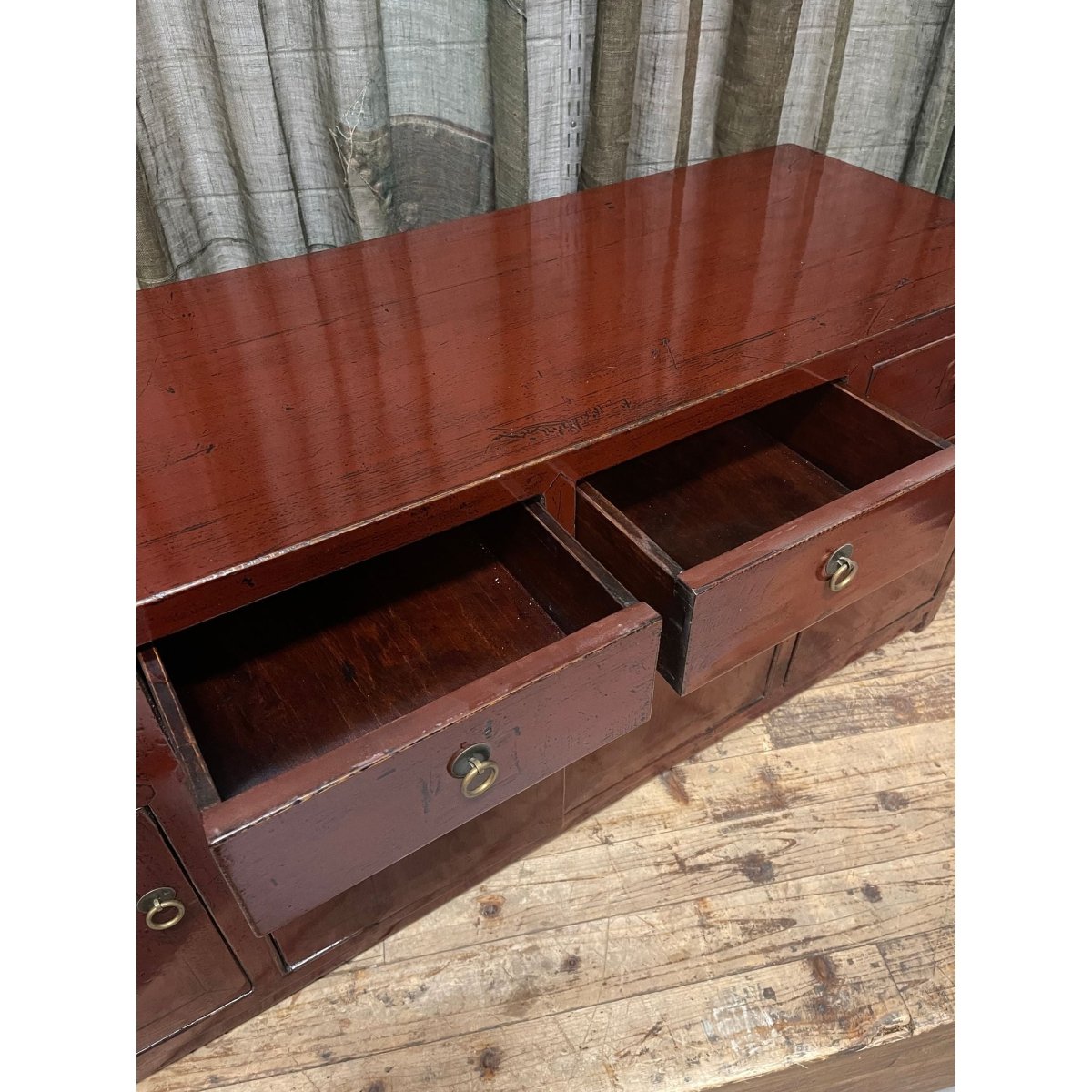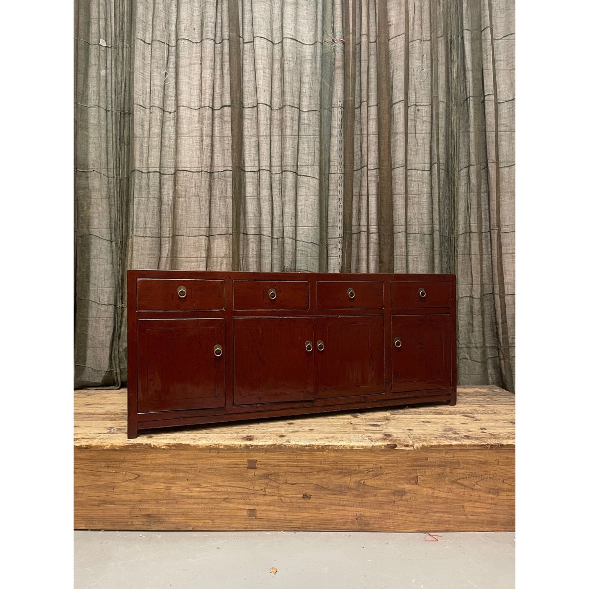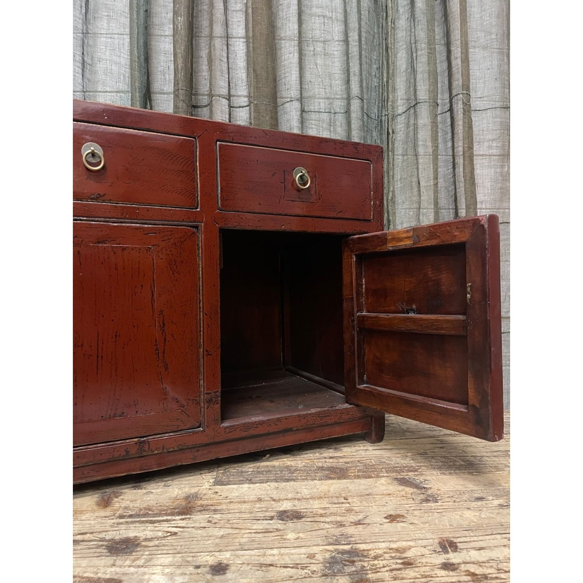 A red lacquered Chinese low cabinet. Made from recycled timber.