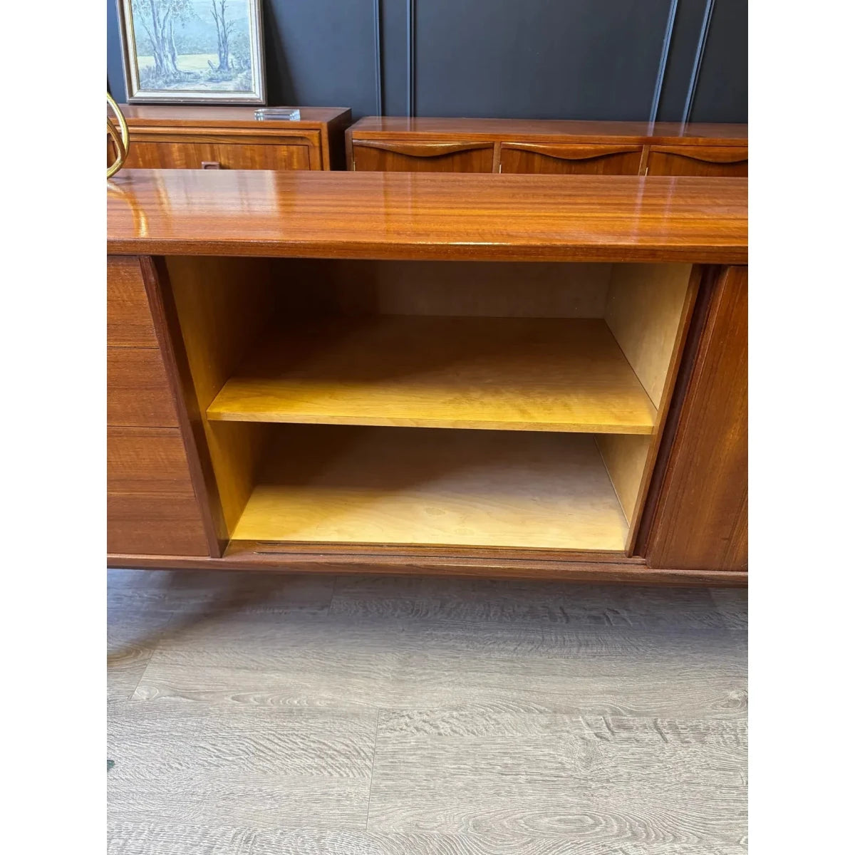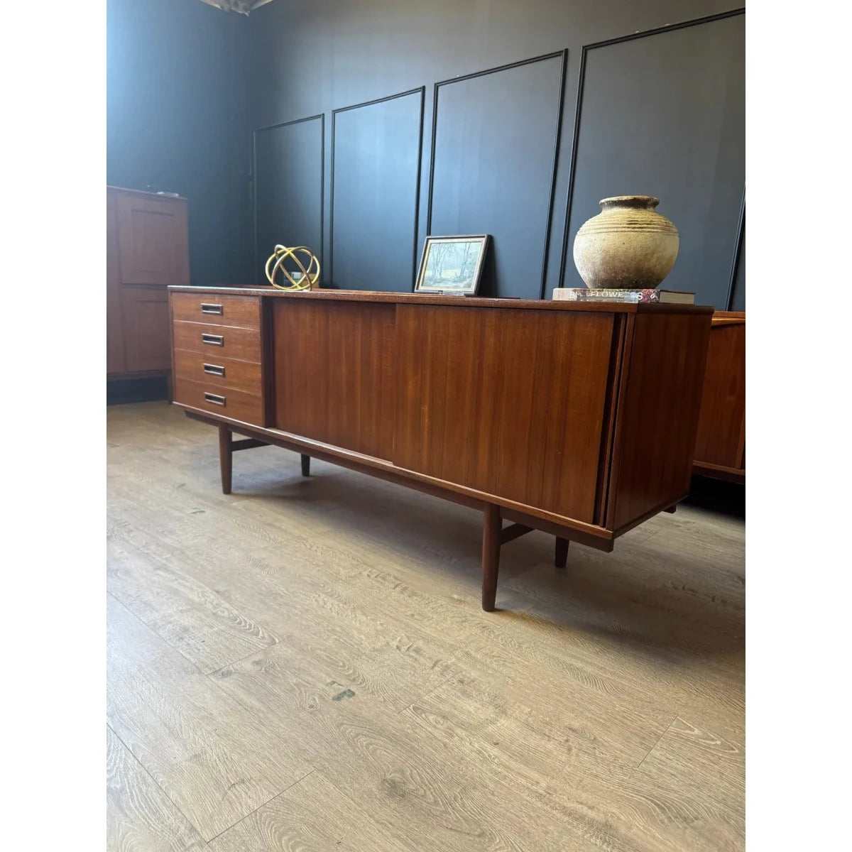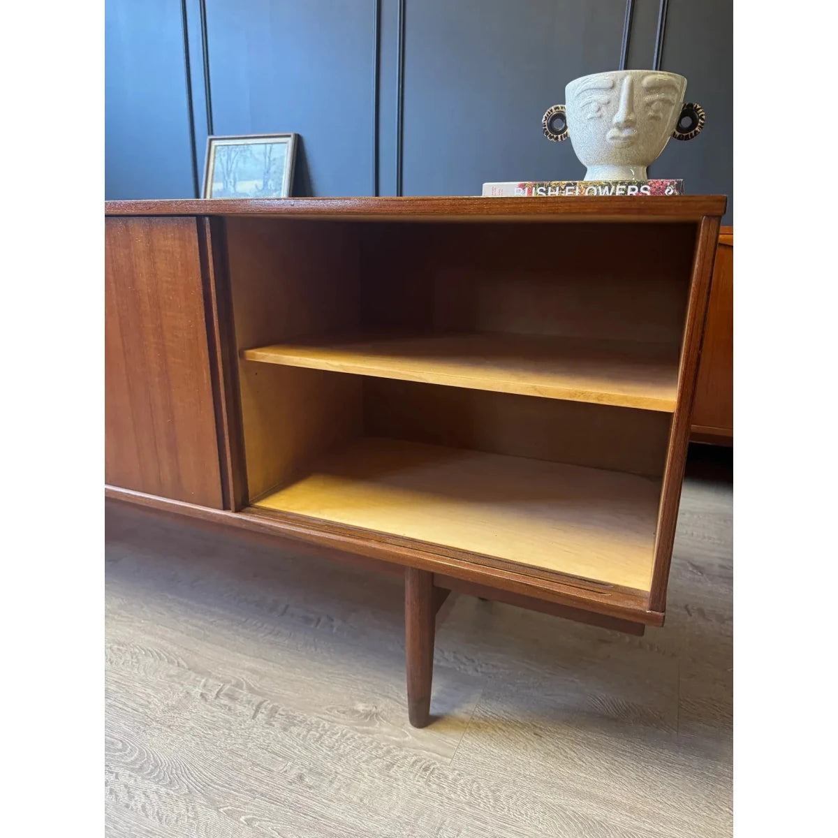 This refined 'Clausen & Son' Danish mid century sideboard / buffet is defined by clean lines, warm timber tones, and beautifully balanced proportions. Crafted with the understated precision of mid-century Danish design, it offers generous storage without visual weight—an elegant, timeless piece that sits effortlessly in both modern and classic interiors. This piece could also make a stunning tv / entertainment unit.