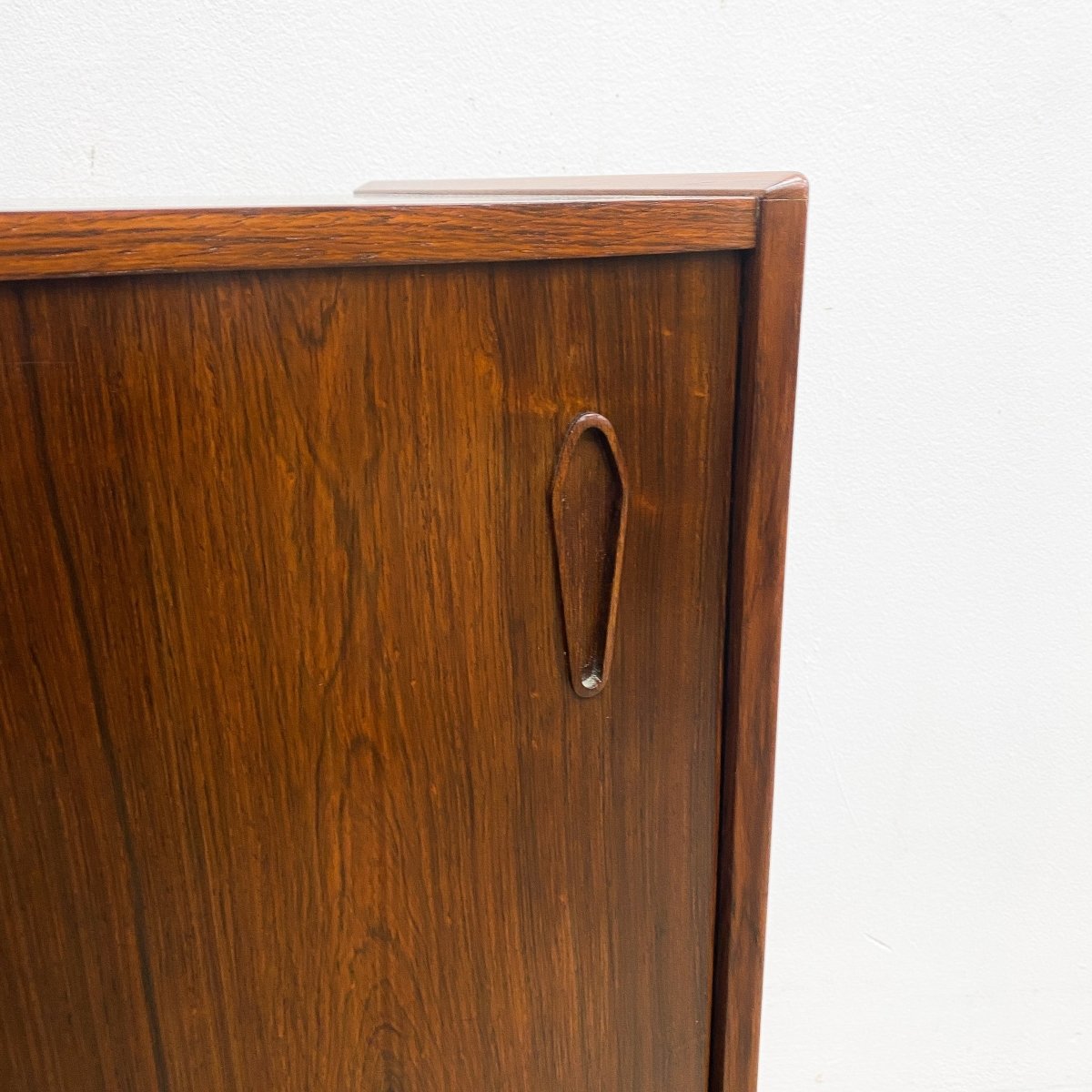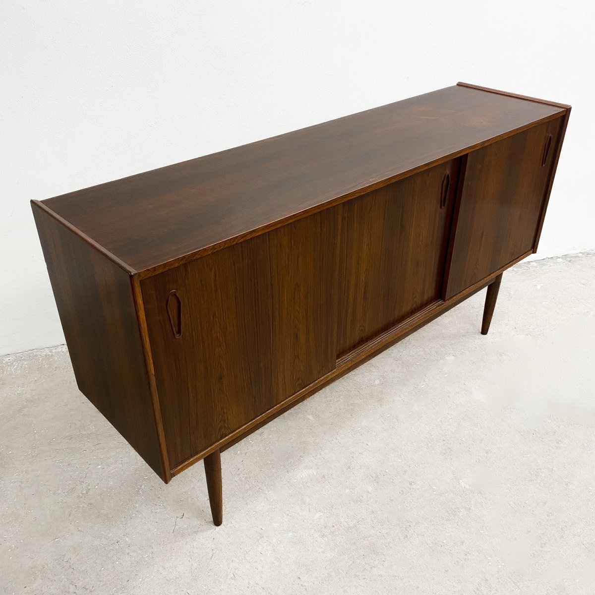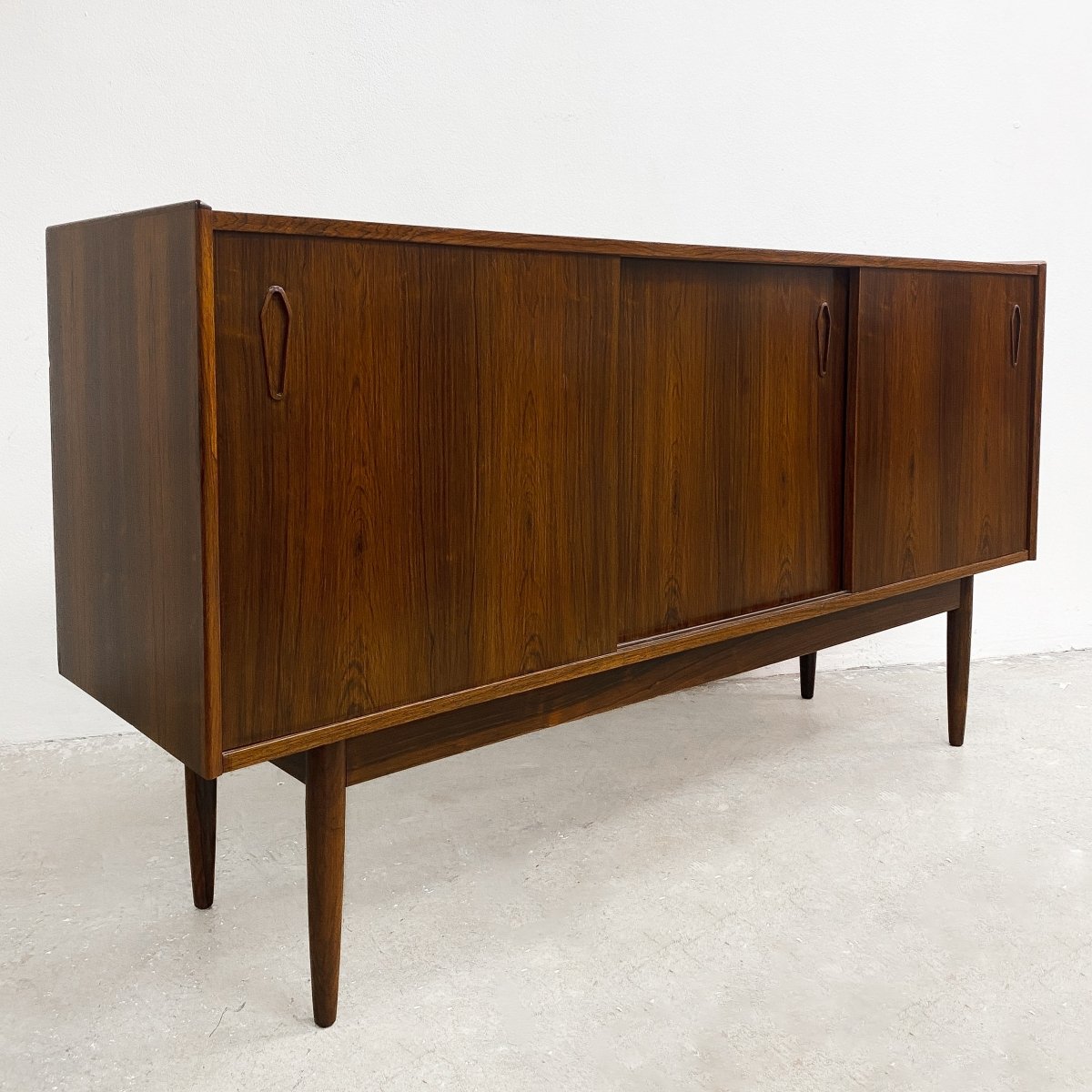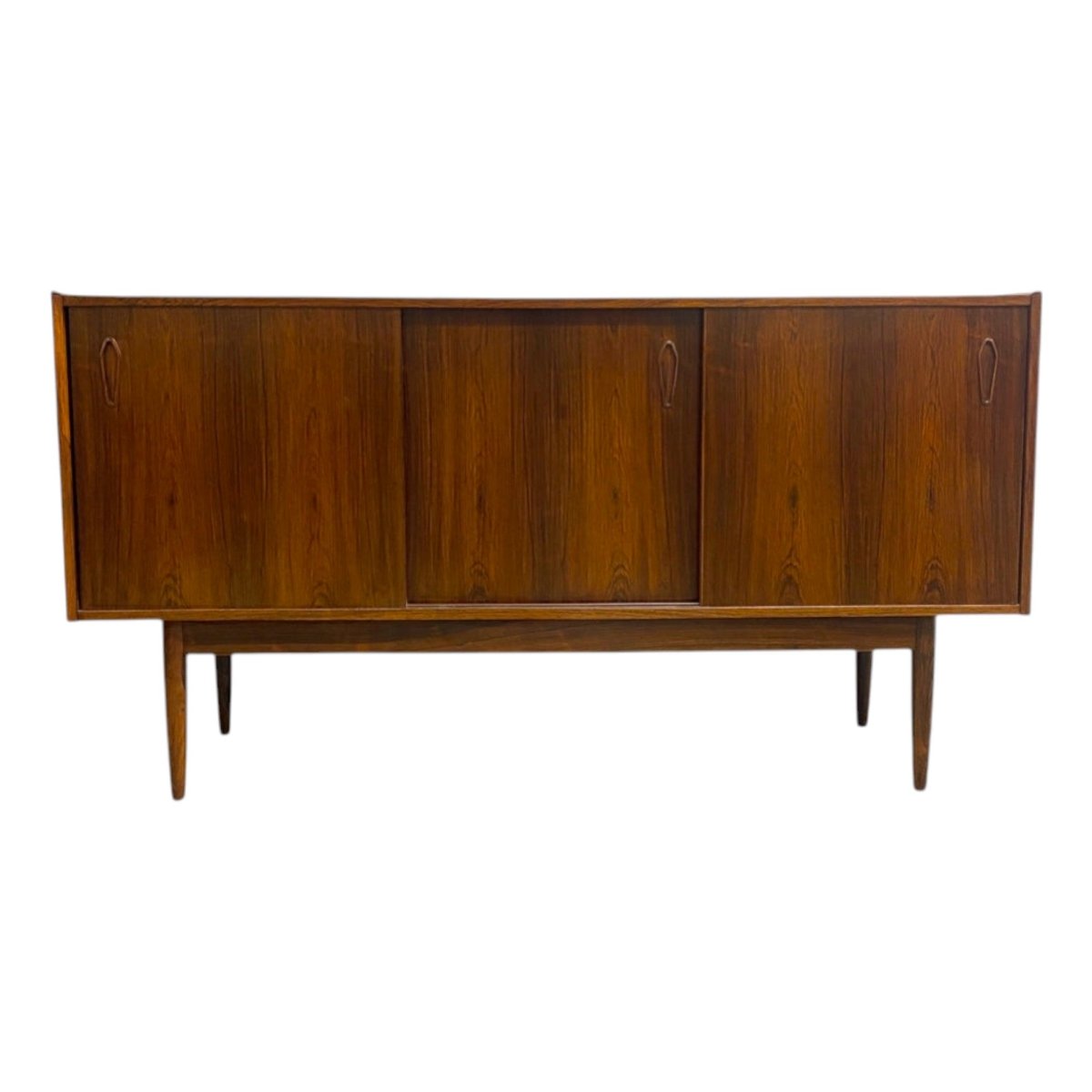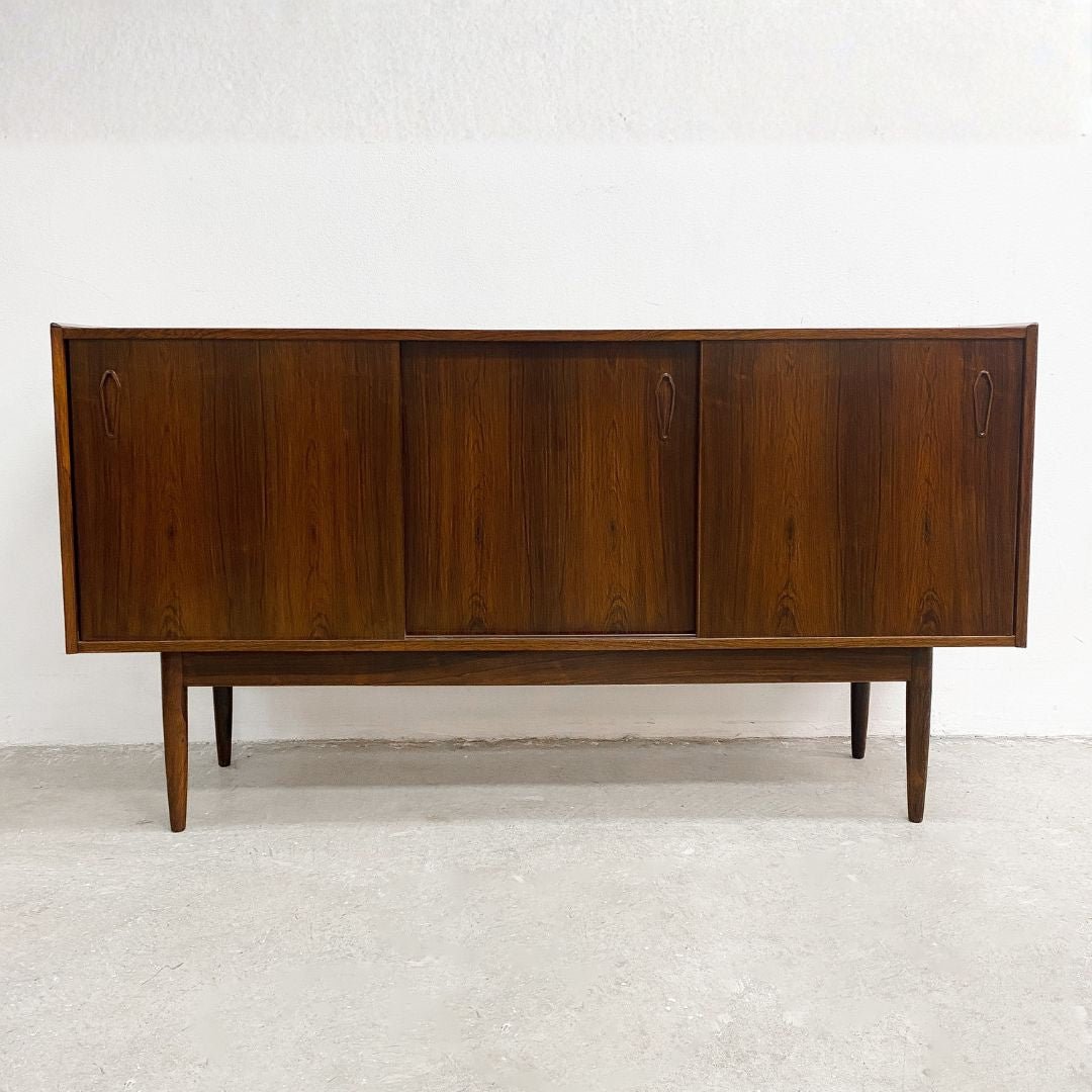Stunning Danish mid century sideboard, crafted from Brazilian rosewood and featuring 3 sliding doors, internal shelves and cutlery drawer. There is a rough hole punched in the back for cables to go through. In great original condition with minor signs of previous use commensurate with age.