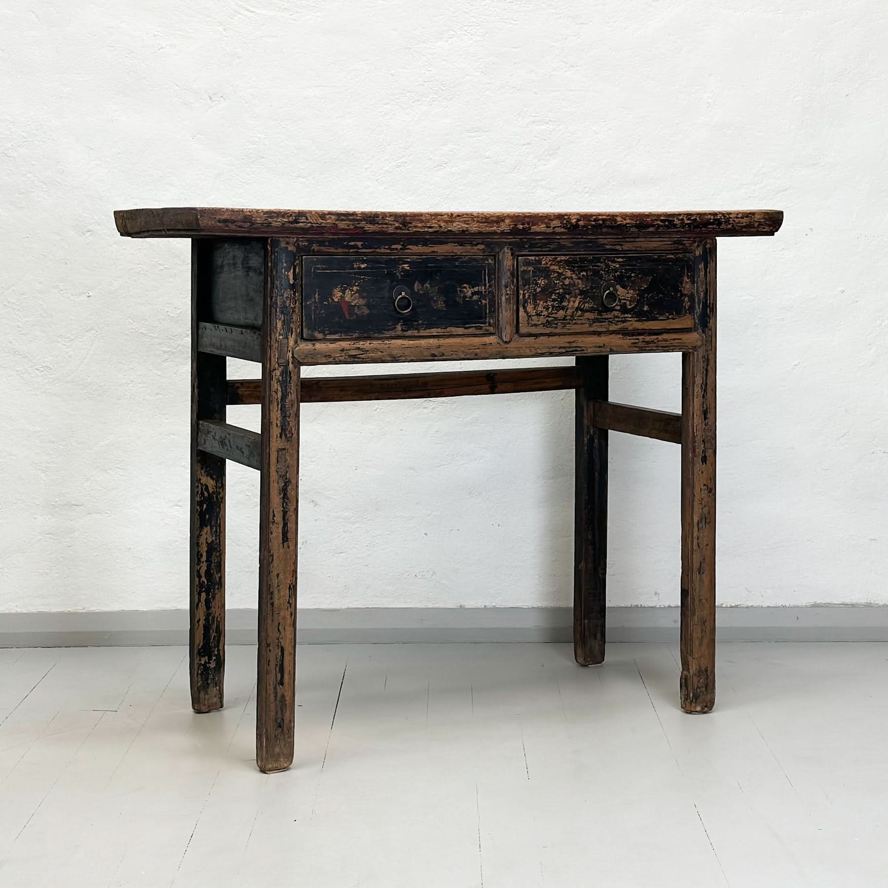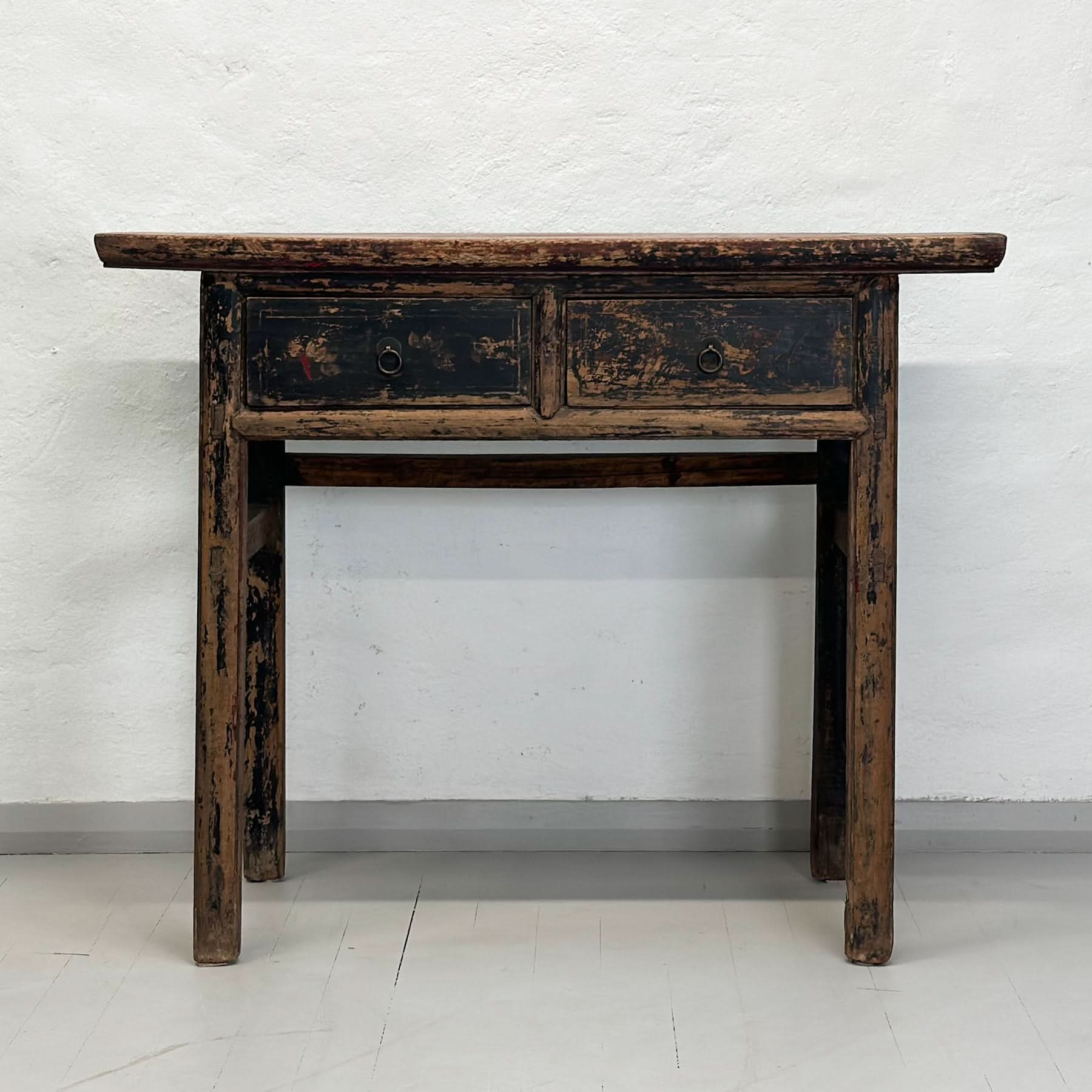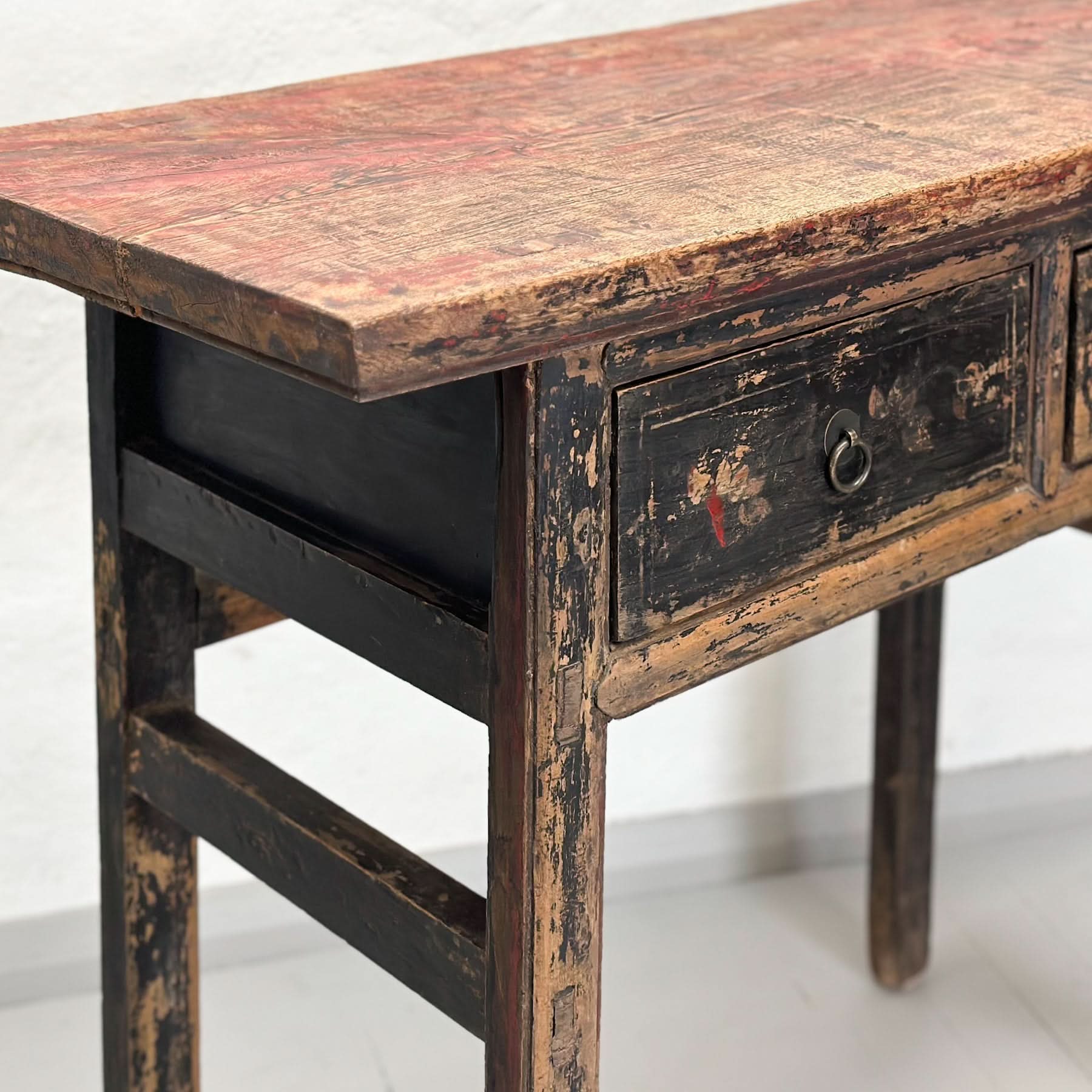 This console has seen a lifetime of use and is showing signs thereof. Used as is for a quirky offbeat piece or paint it in a Chinese red or ochre to give it a contemporary feel.