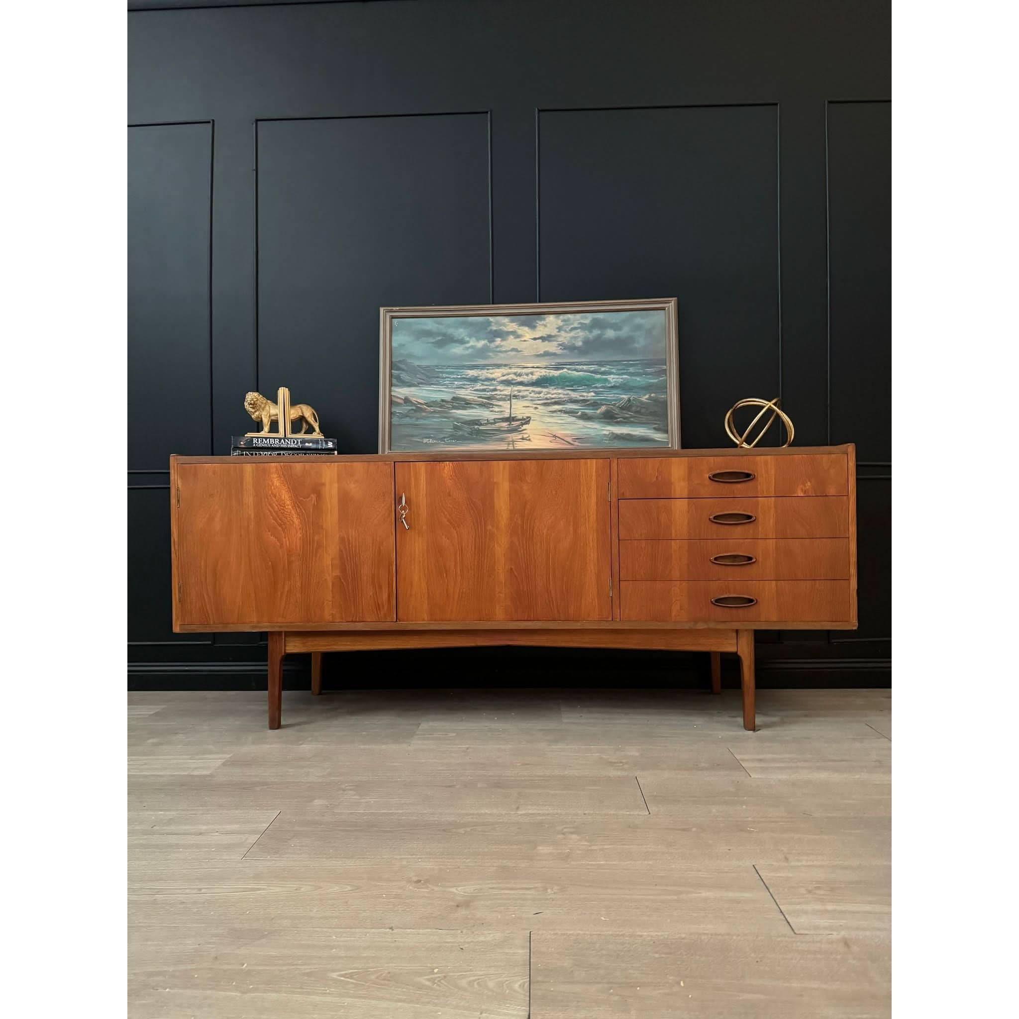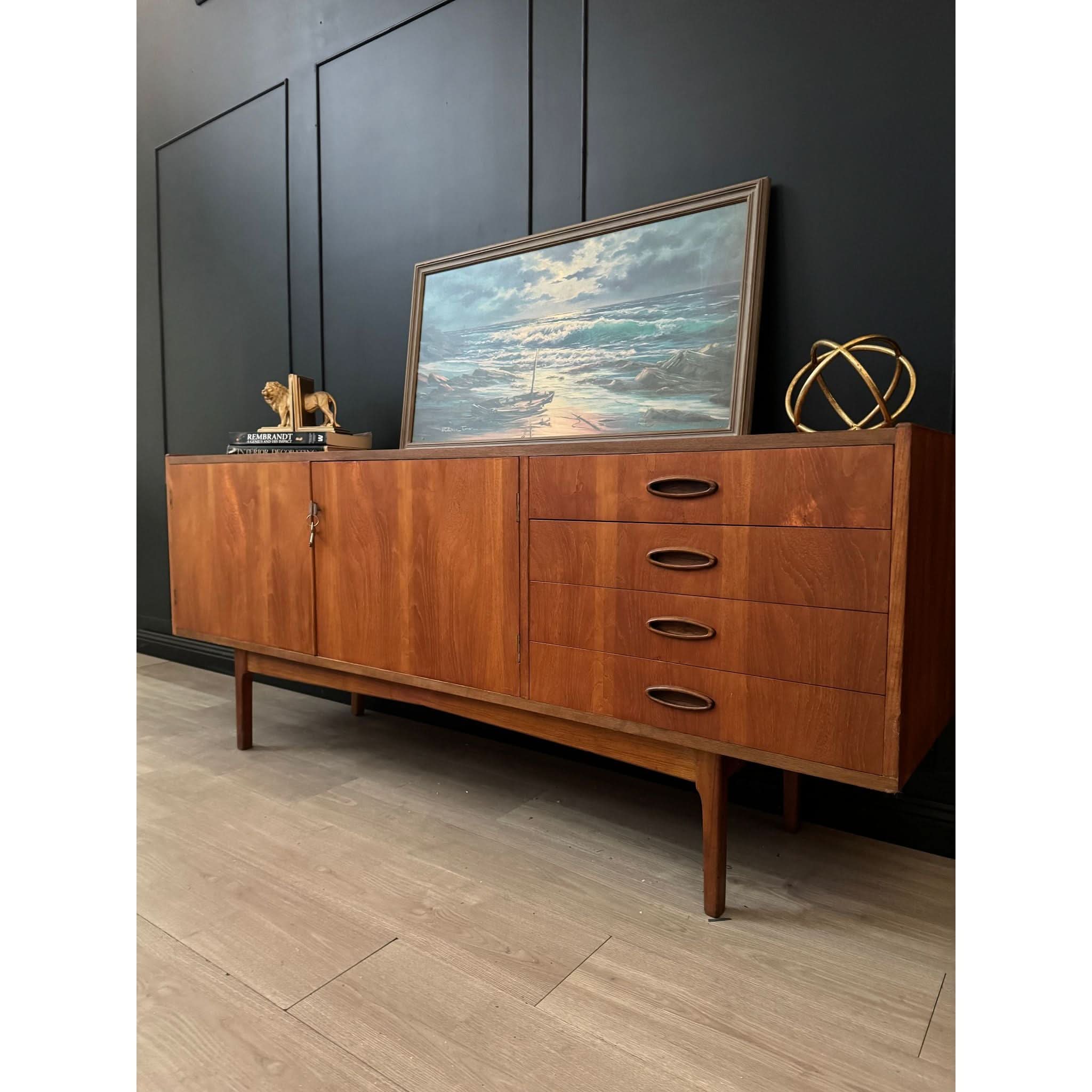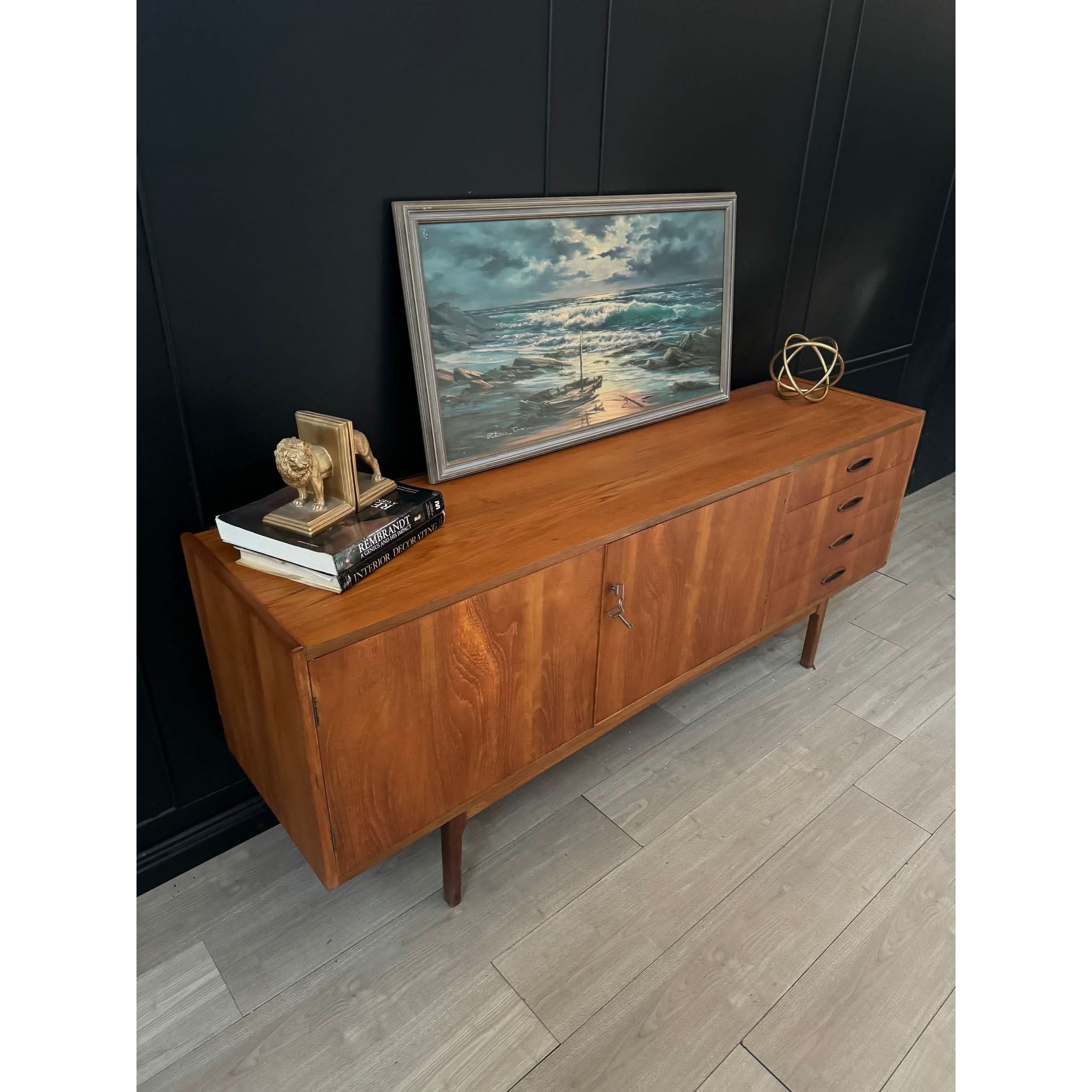 Established in 1946 by Fred Lowen and Ernest Rodek, Fler quickly became synonymous with quality craftsmanship and innovative design, pioneering the mid-century modern movement in Australia. The Fler 64 is an embodiment of the brand's ethos, showcasing clean lines, exquisite detailing, and unparalleled functionality. This long style piece boasts two doors and four drawers, providing ample storage space for your essentials, all complemented by the original keys for added authenticity.