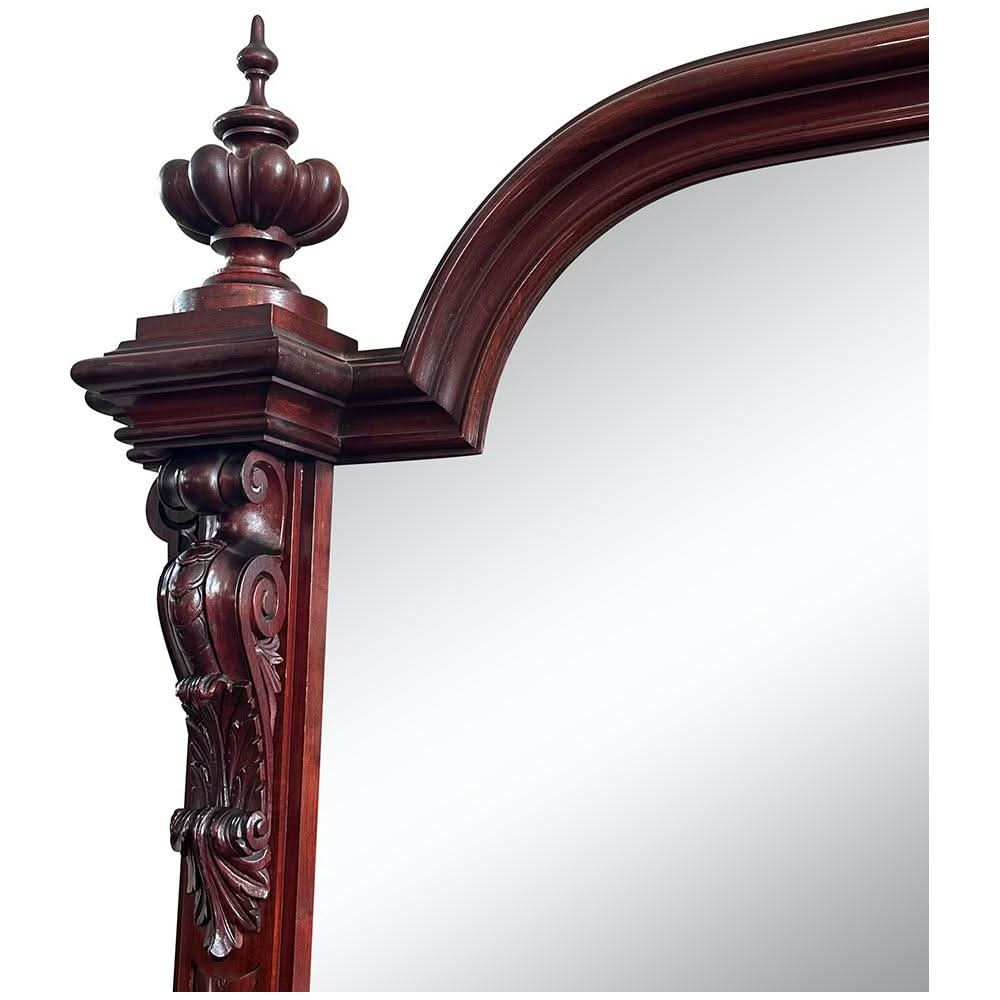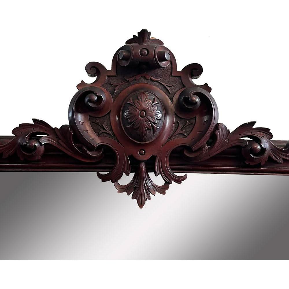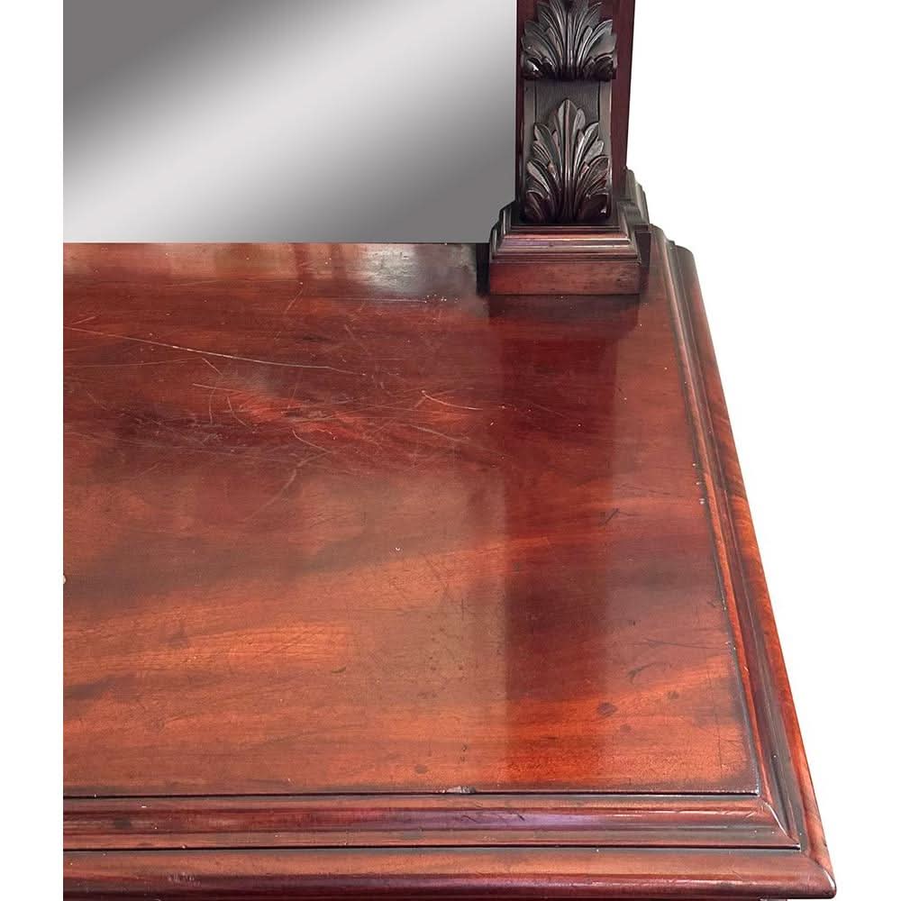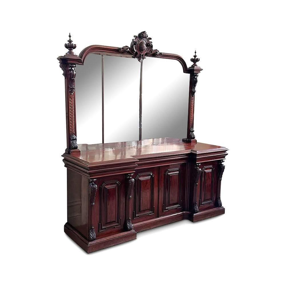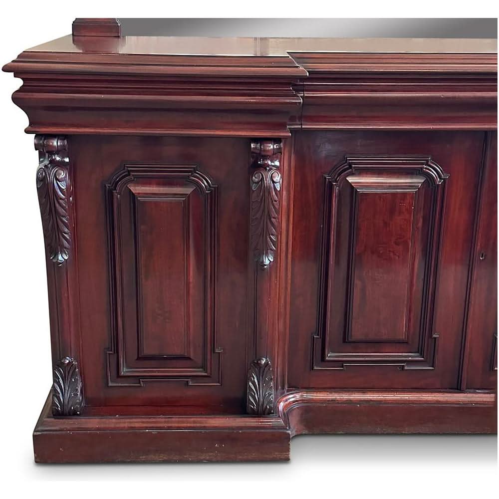 This GRAND scale sideboard is befitting of a large room, business, or restaurant that can do this beauty justice. Crafted from rich mahogany, this sideboard is in a breakfront style, and features 3 central drawers, 4 raised panel doors, finely carved corbels, stunning finials, and a crest.It is flanked by full length columns.