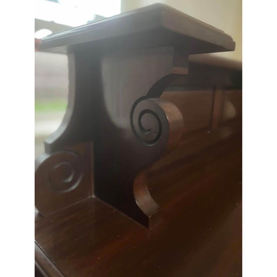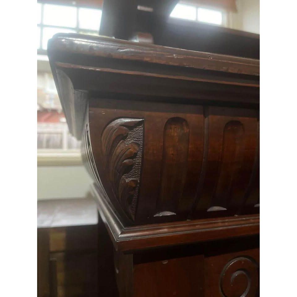 The bottom portion of the Server constructed out of walnut with a nice top, one pull out drawers. Each of the shelves (2) is supported on each side by heavy turned architectural style columns. The pull out drawer is with original holder. The server’s top rear panel has lovely carving.
