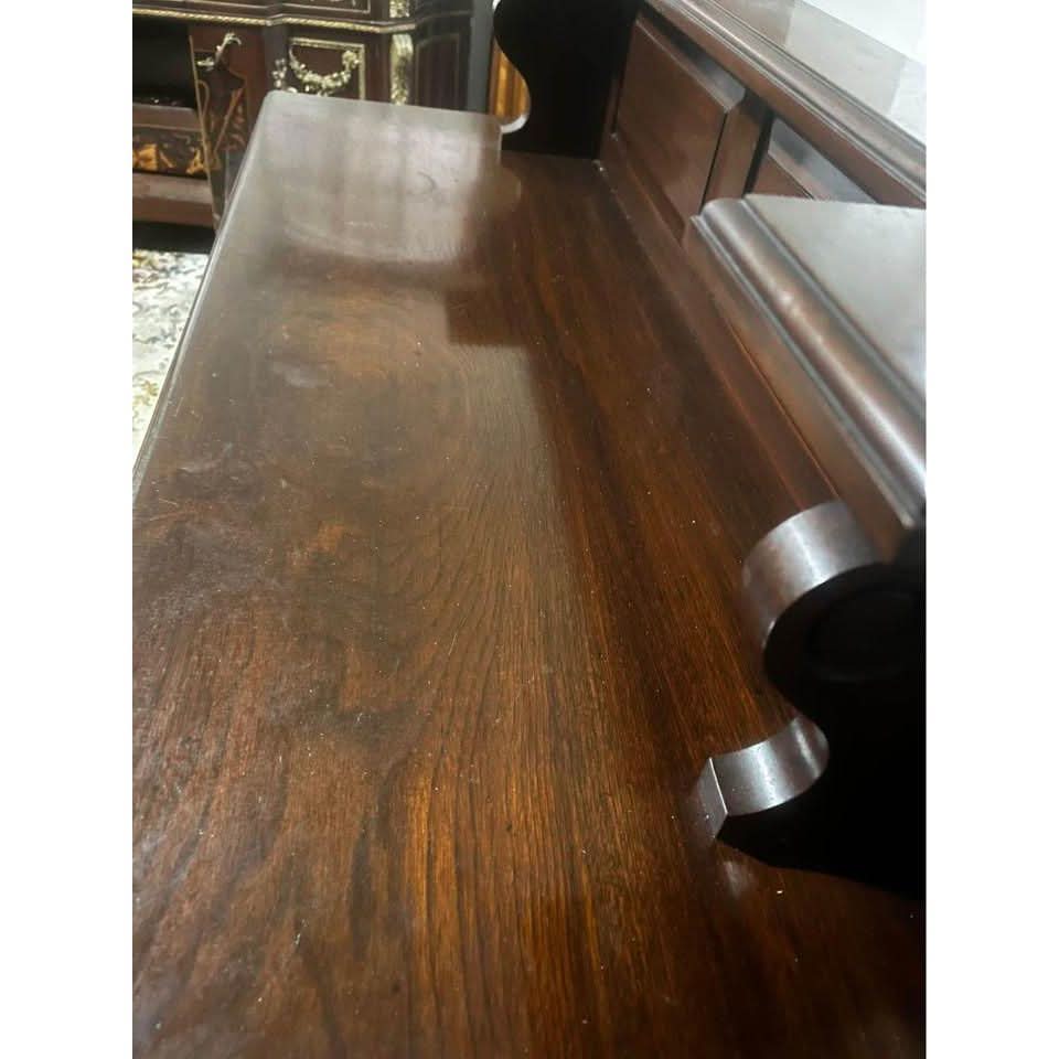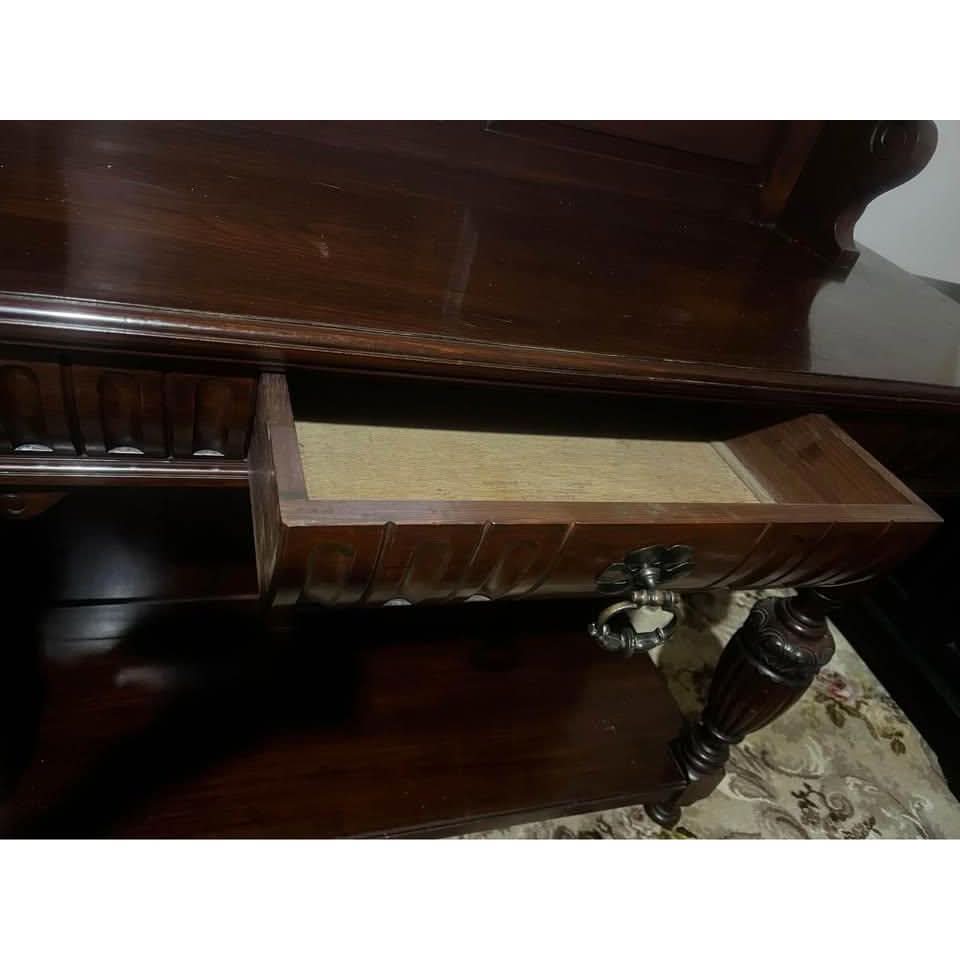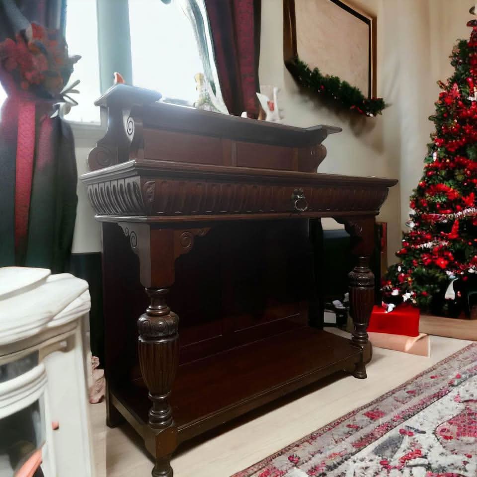 Antique 19th Century Henry II Style French Walnut Server. The bottom portion of the Server constructed out of walnut with a nice top, one pull out drawers. Each of the shelves (2) is supported on each side by heavy turned architectural style columns. The pull out drawer is with original holder. The server’s top rear panel has lovely carving. Condition – Very good, no missing or replaced parts. 121L x 40W x117H cm