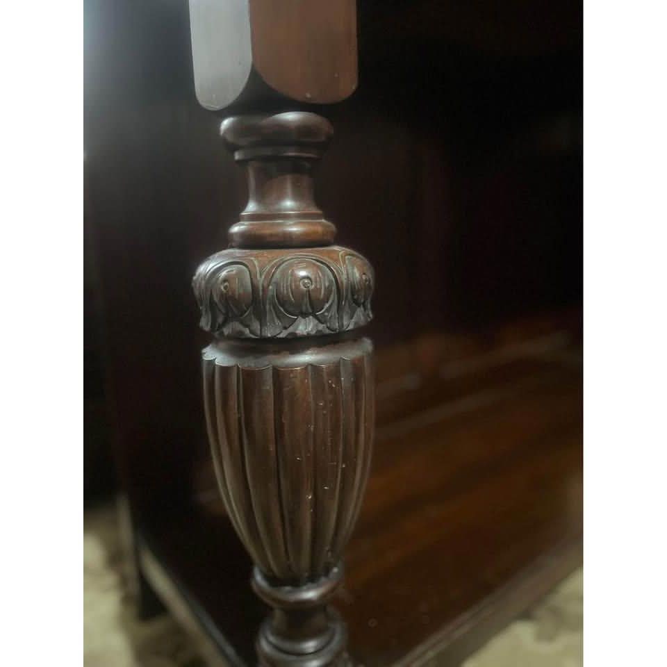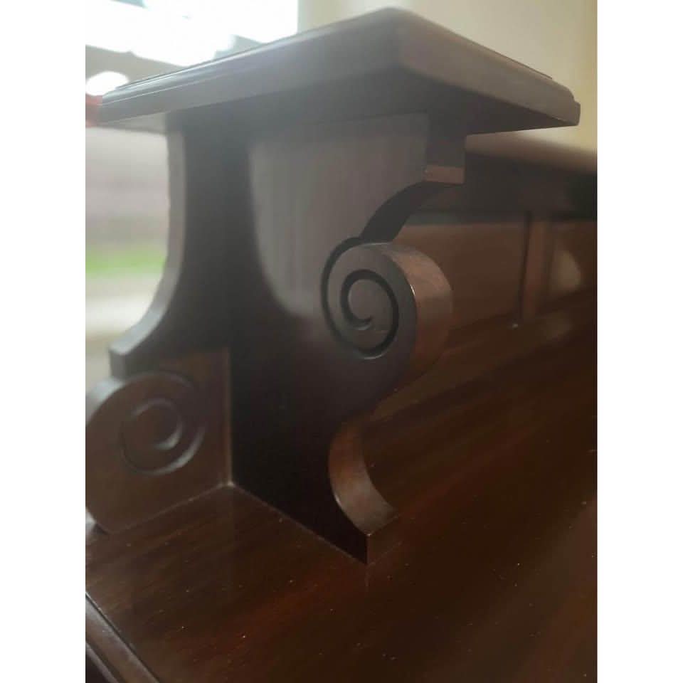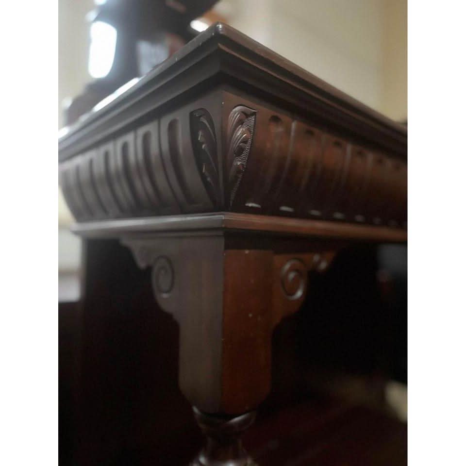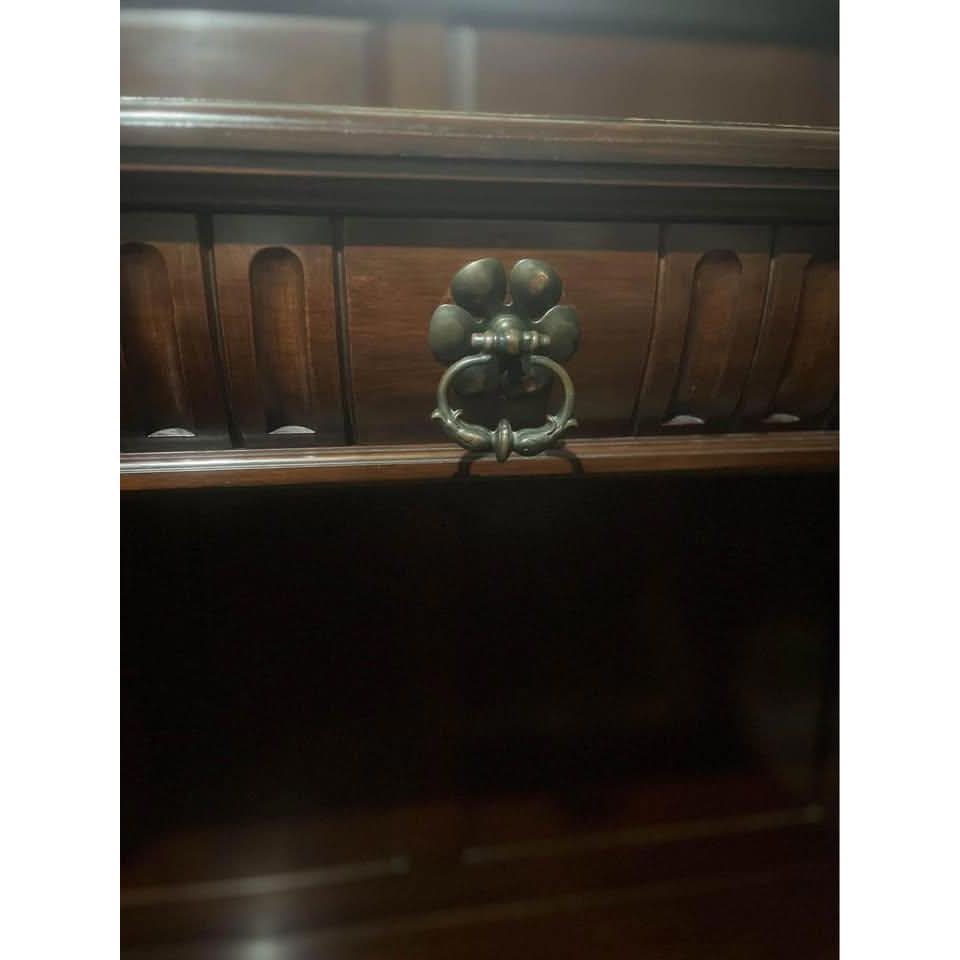 Antique 19th Century Henry II Style French Walnut Server. The bottom portion of the Server constructed out of walnut with a nice top, one pull out drawers. Each of the shelves (2) is supported on each side by heavy turned architectural style columns. The pull out drawer is with original holder. The server’s top rear panel has lovely carving. Condition – Very good, no missing or replaced parts. 121L x 40W x117H cm