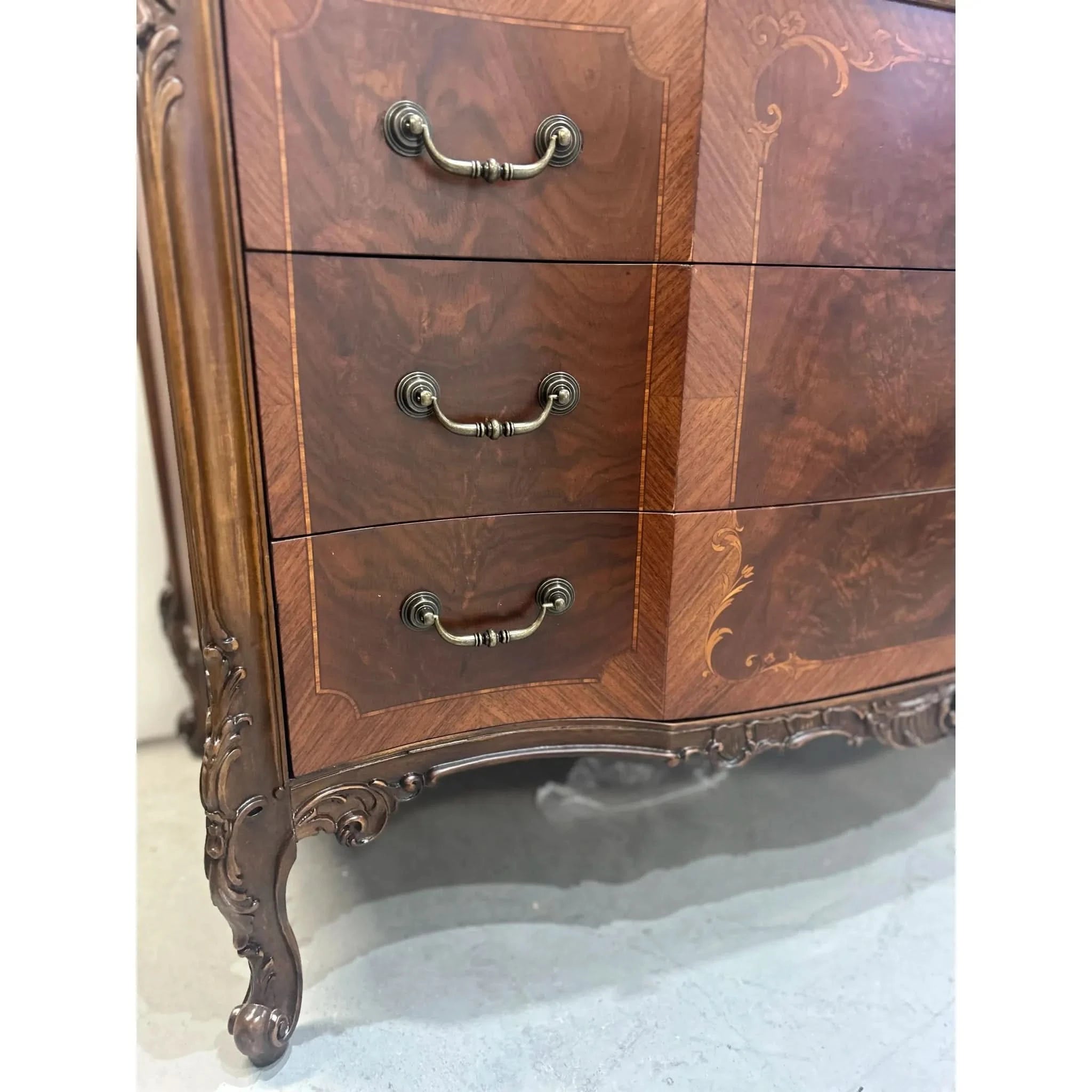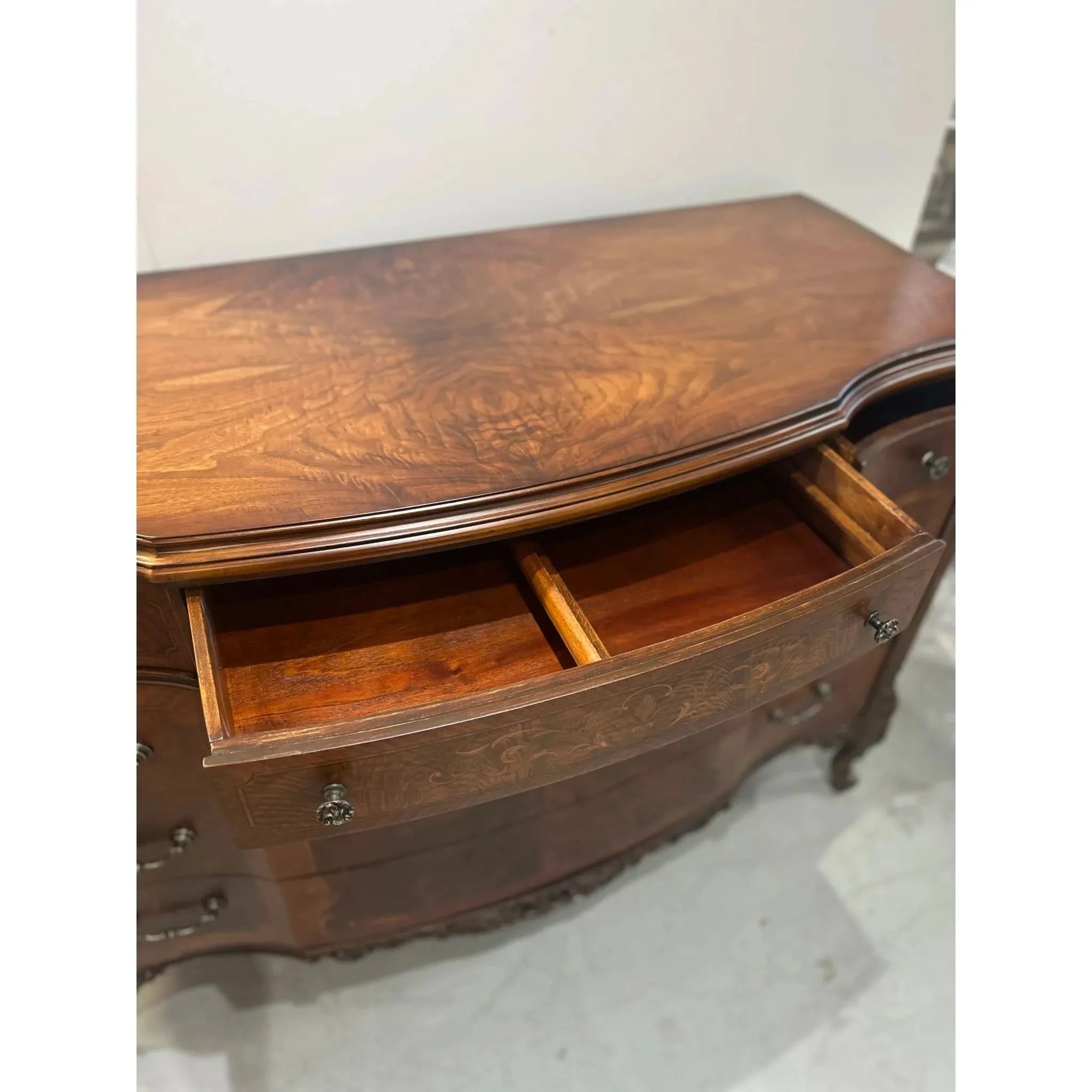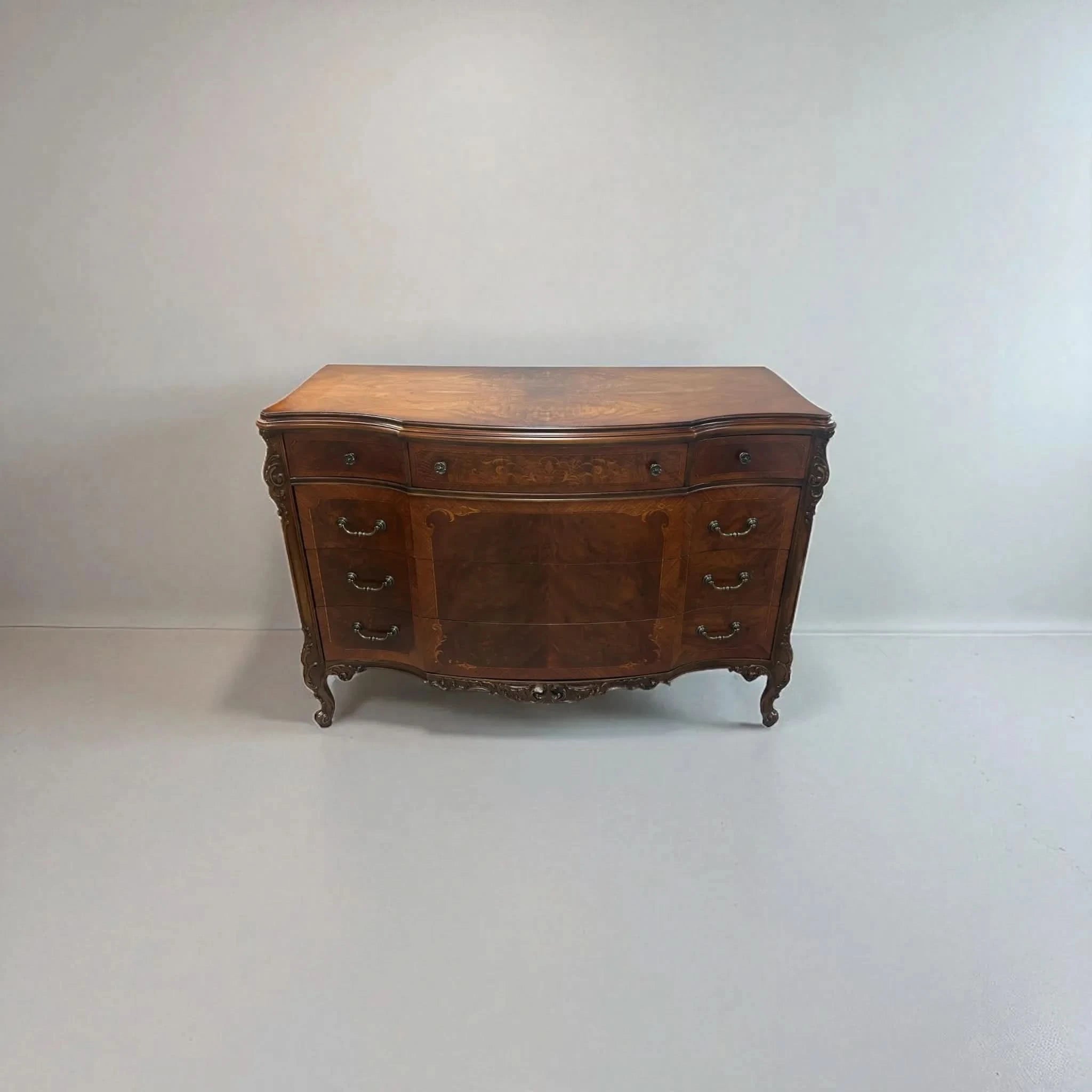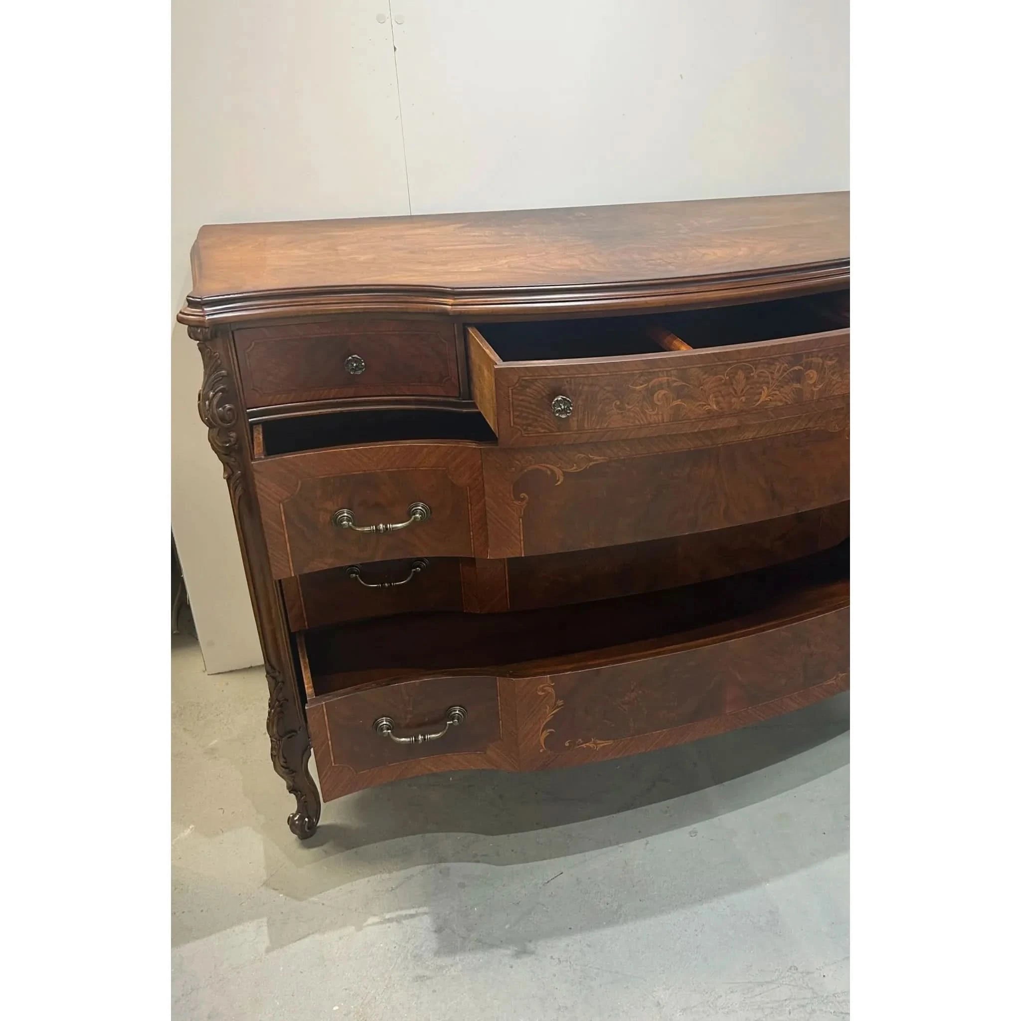 This exquisite European walnut sideboard is a fine example of craftsmanship and elegance. Featuring beautifully carved cabriole legs, intricate inlay detailing and a slight serpentine curved front, it offers both functionality and timeless appeal. With threes central drawers and flanking sets of curved drawers (5 drawers in total), there’s ample storage for your dining or living space needs. The rich walnut veneer showcased a striking grain pattern, enhanced by decorative motifs and ornate hardware. The sideboard is in very good vintage condition with some signs of ware and the hardware has been replaced to make this piece functional once again.