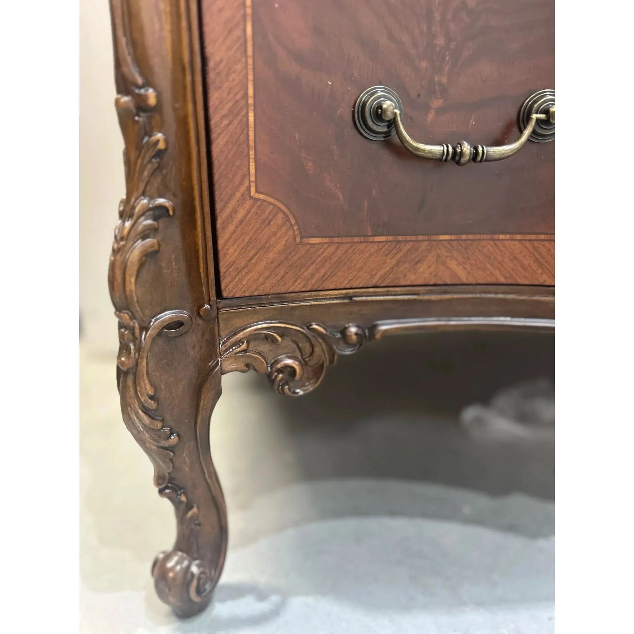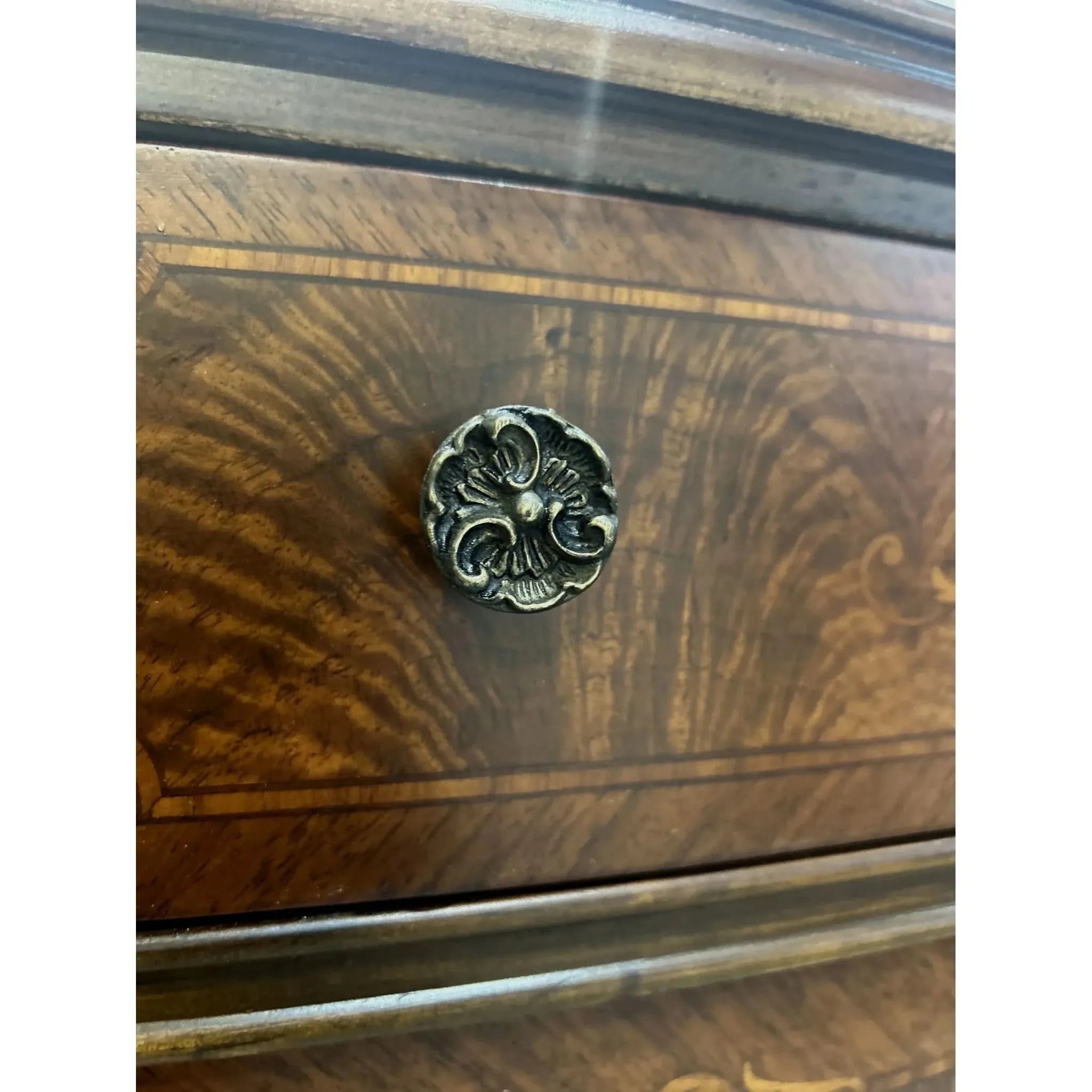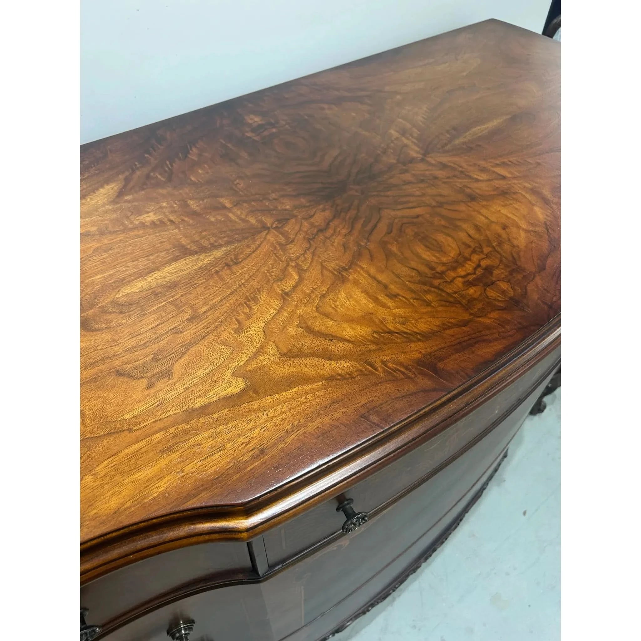 This exquisite European walnut sideboard is a fine example of craftsmanship and elegance. Featuring beautifully carved cabriole legs, intricate inlay detailing and a slight serpentine curved front, it offers both functionality and timeless appeal. With threes central drawers and flanking sets of curved drawers (5 drawers in total), there’s ample storage for your dining or living space needs. The rich walnut veneer showcased a striking grain pattern, enhanced by decorative motifs and ornate hardware. The sideboard is in very good vintage condition with some signs of ware and the hardware has been replaced to make this piece functional once again.