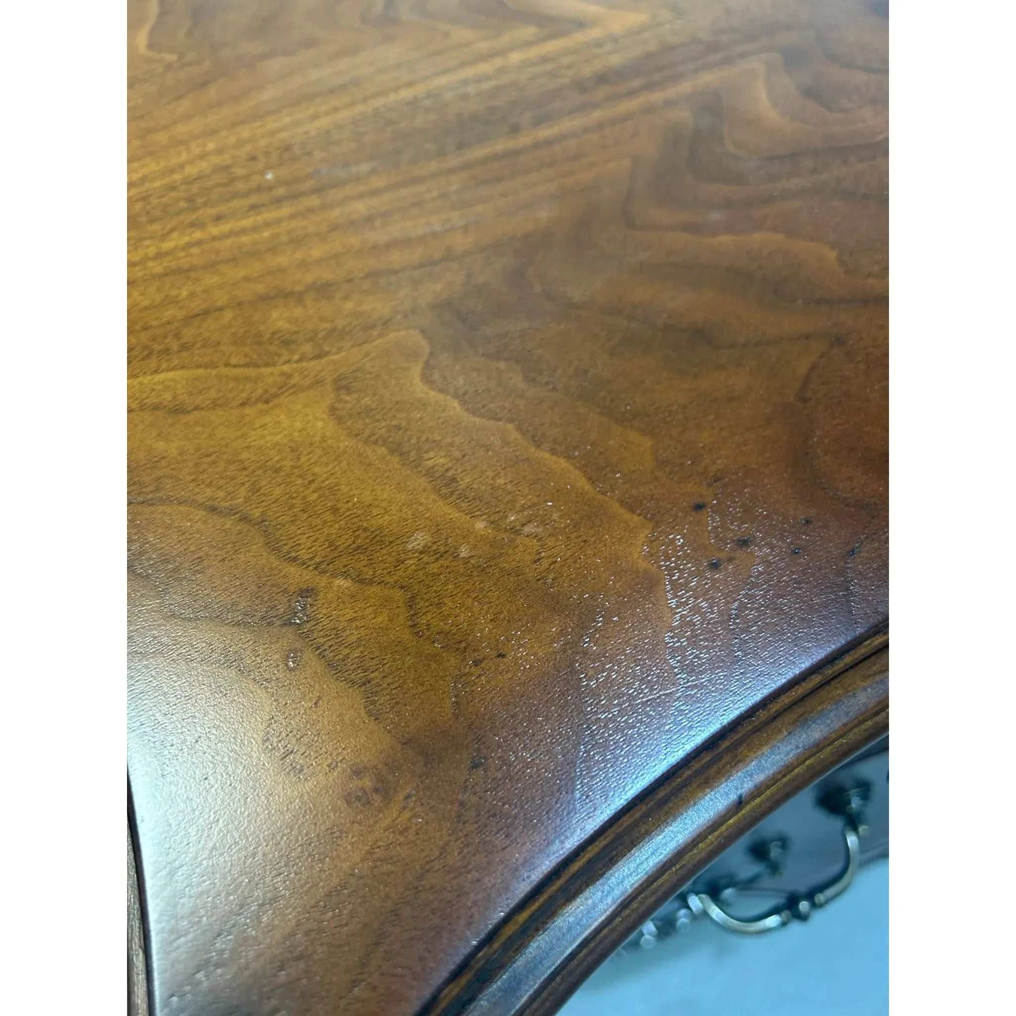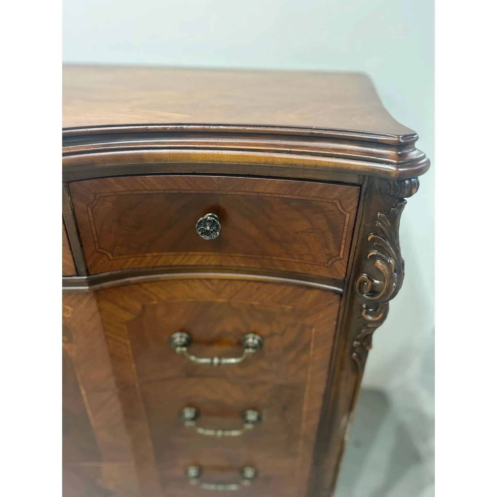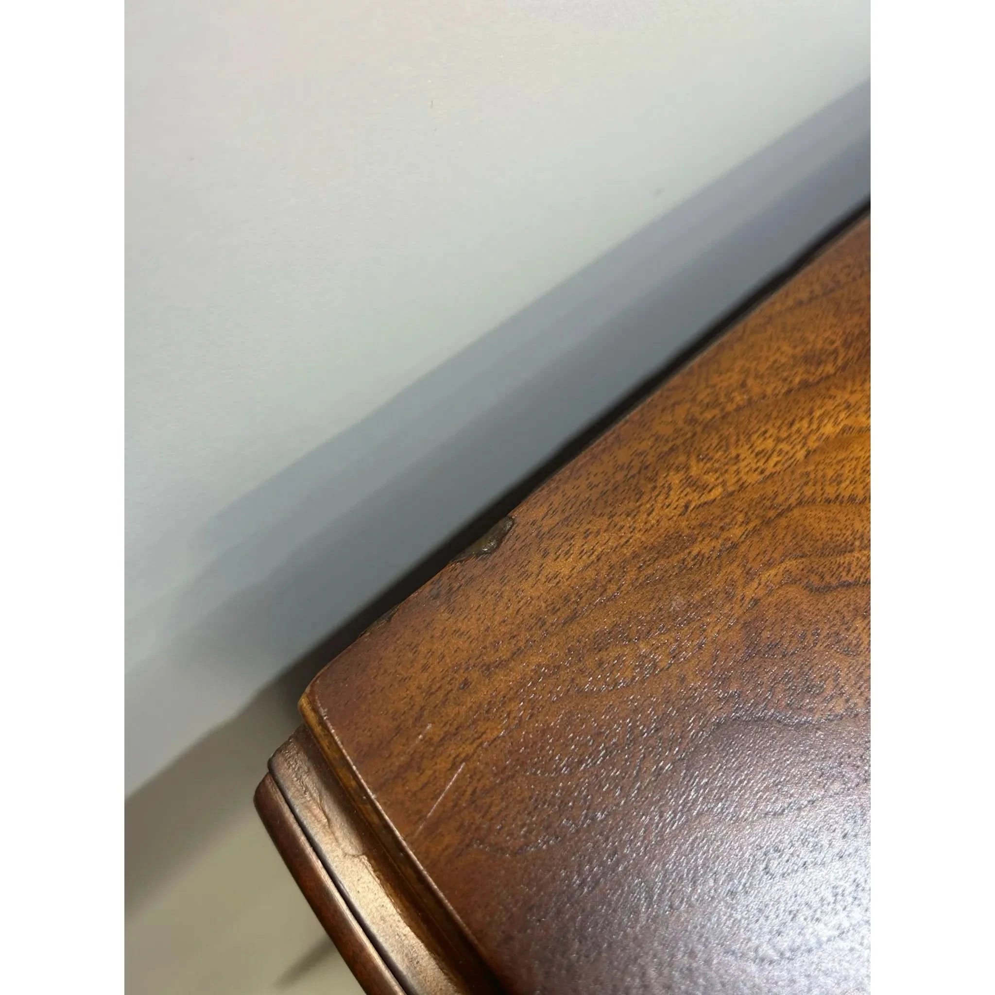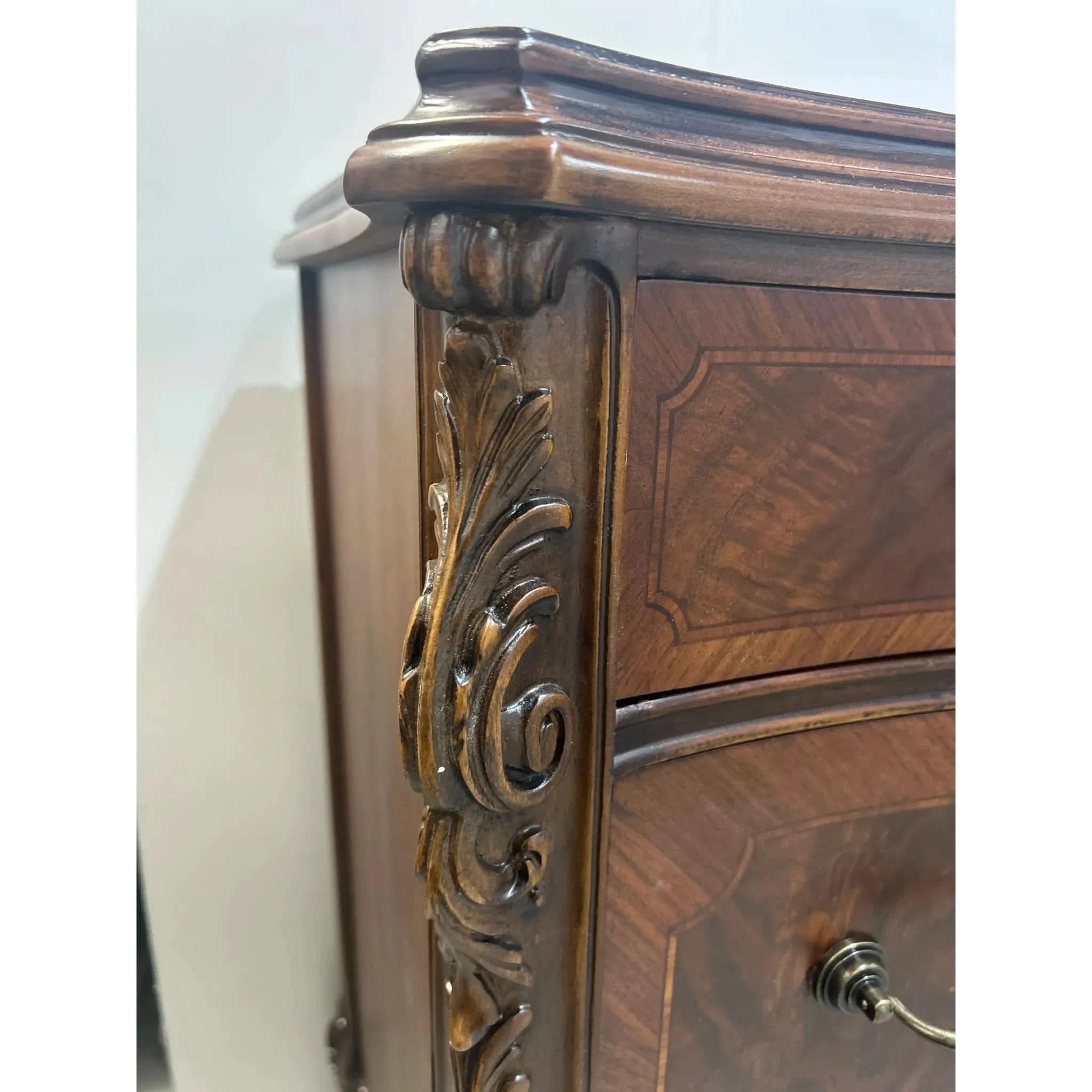 This exquisite European walnut sideboard is a fine example of craftsmanship and elegance. Featuring beautifully carved cabriole legs, intricate inlay detailing and a slight serpentine curved front, it offers both functionality and timeless appeal. With threes central drawers and flanking sets of curved drawers (5 drawers in total), there’s ample storage for your dining or living space needs. The rich walnut veneer showcased a striking grain pattern, enhanced by decorative motifs and ornate hardware. The sideboard is in very good vintage condition with some signs of ware and the hardware has been replaced to make this piece functional once again.