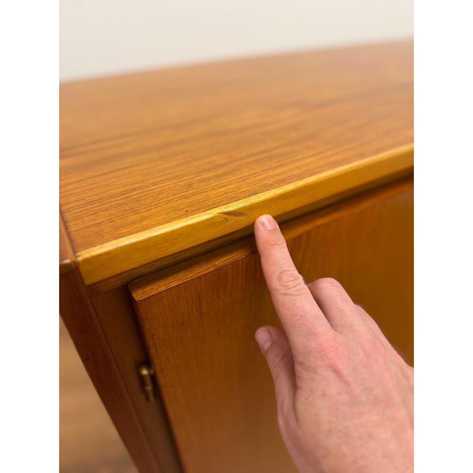 Below are four beautifully crafted drawers, one lined in original purple felt, providing additional concealed storage. The piece is finished in warm, well-matched teak with excellent grain throughout and retains its original Parker maker’s mark to the rear.