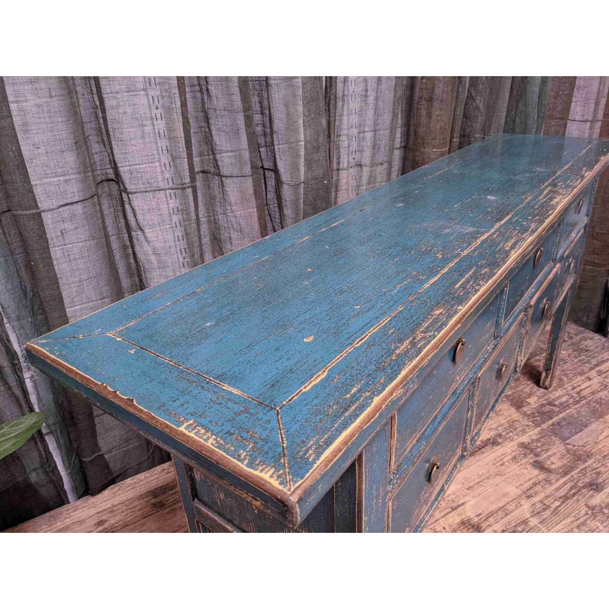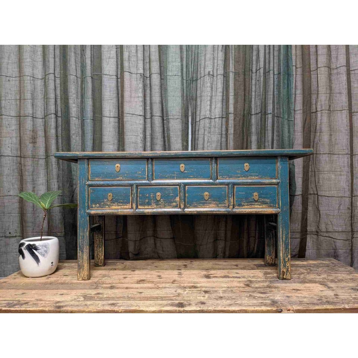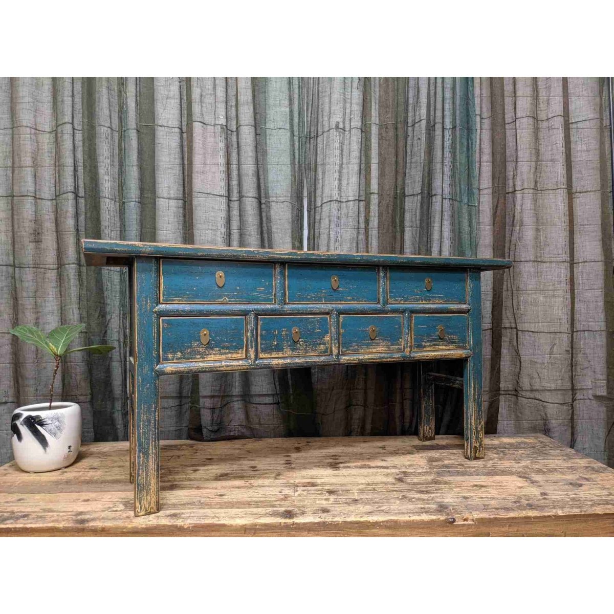 A provincial style Chinese blue lacquered seven-drawer hall table. Made from recycled timber