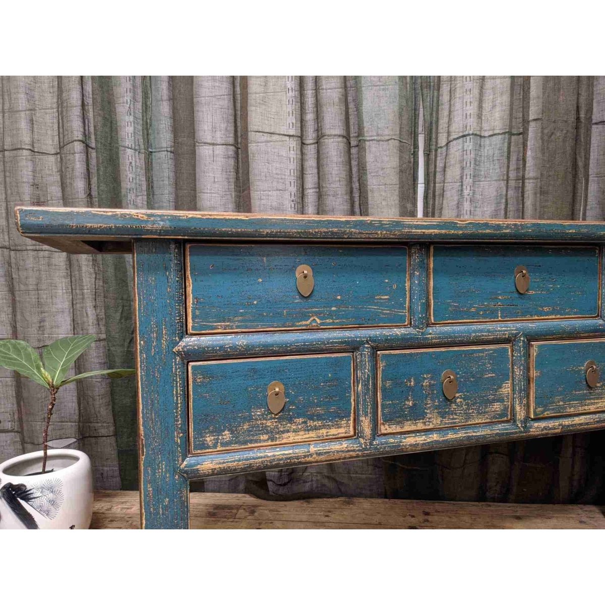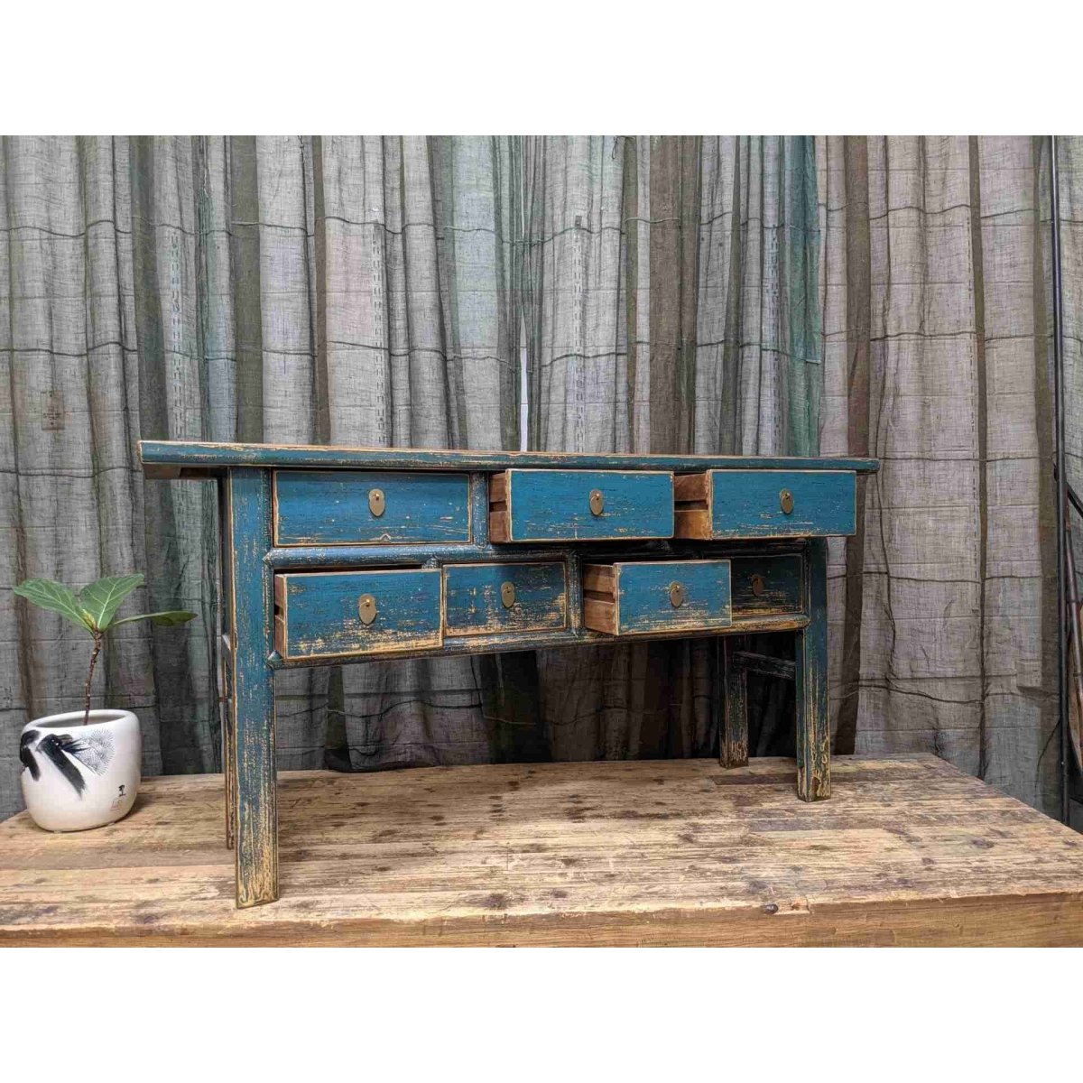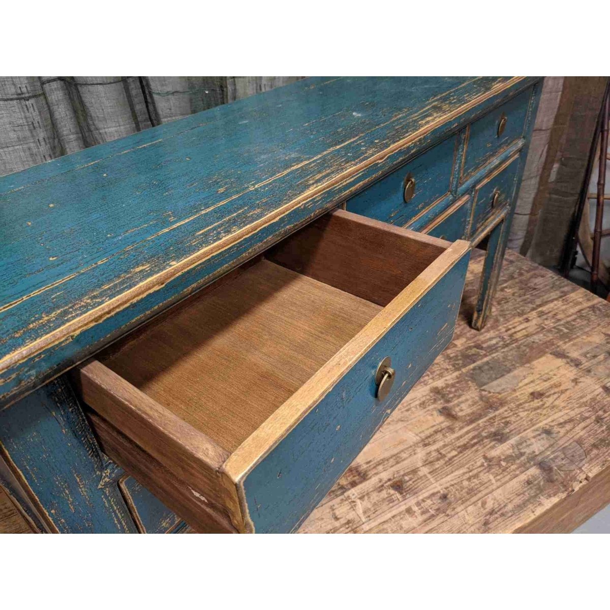 A provincial style Chinese blue lacquered seven-drawer hall table. Made from recycled timber