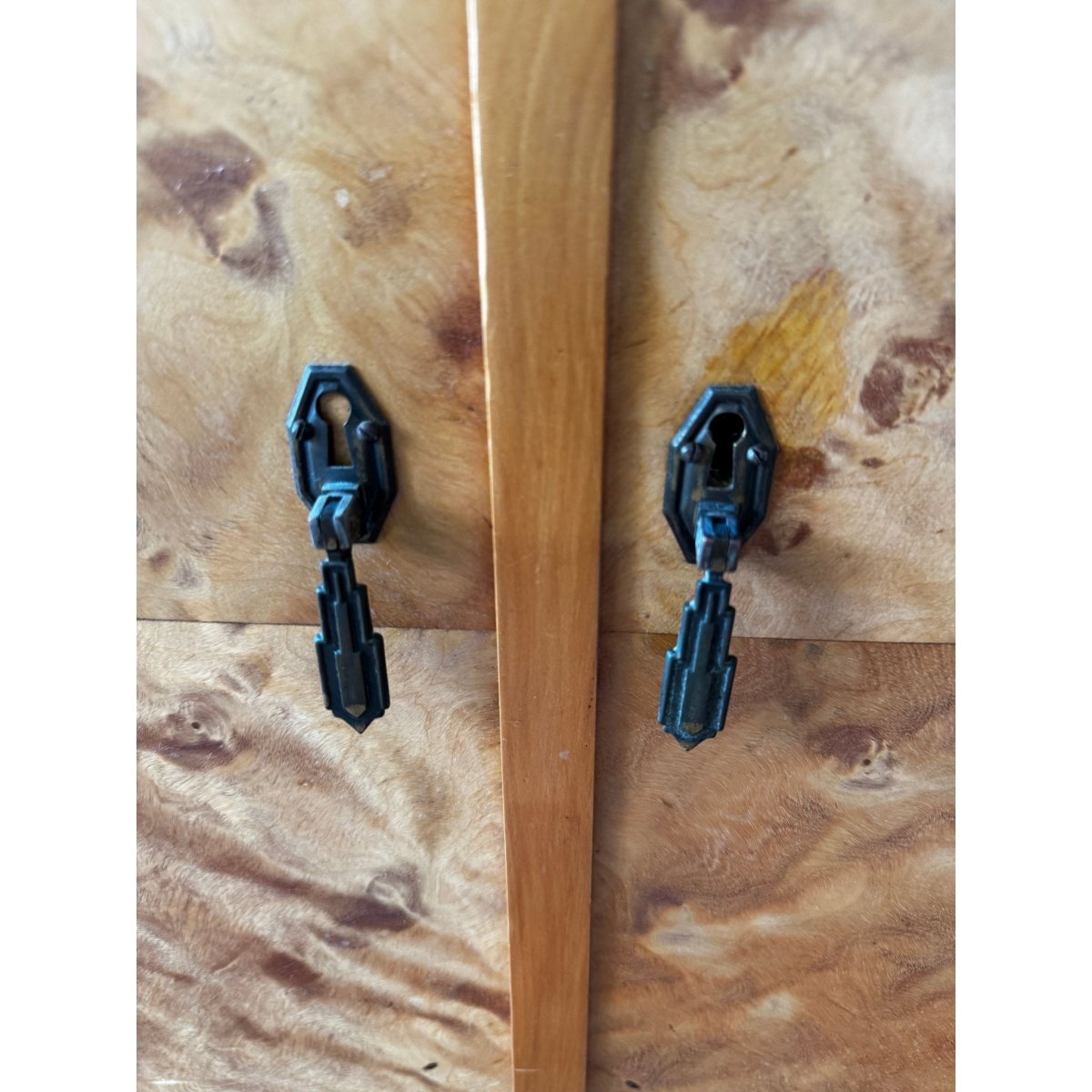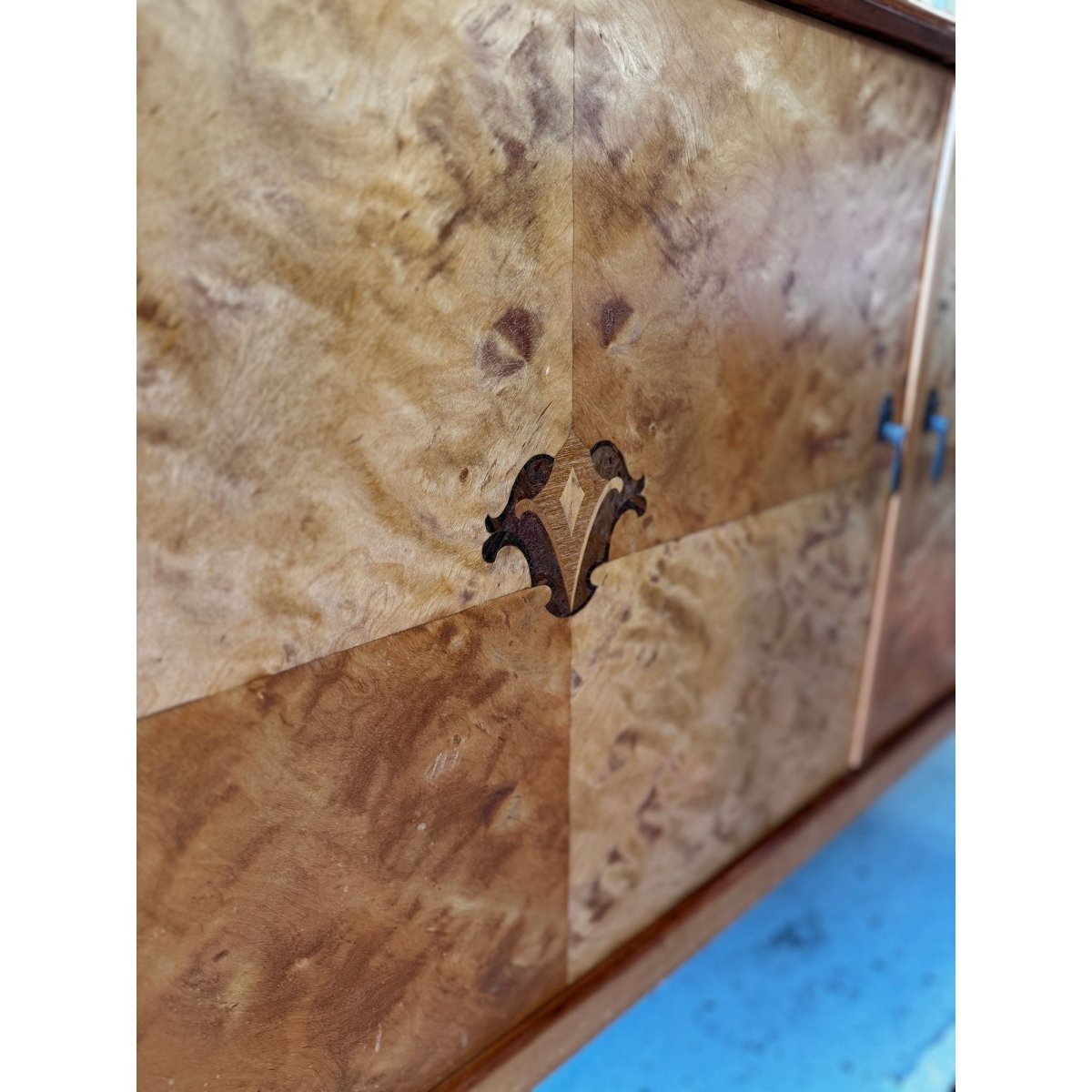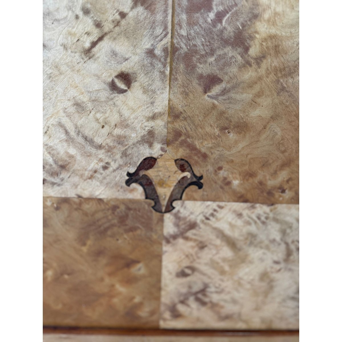 The cabinet’s book-matched veneers shimmer with natural chatoyance, their honeyed depth offset by delicate marquetry motifs and poised cabriole legs. Inside, fine compartments provide generous storage, while the overall composition speaks of balance, precision, and craftsmanship at its highest level.