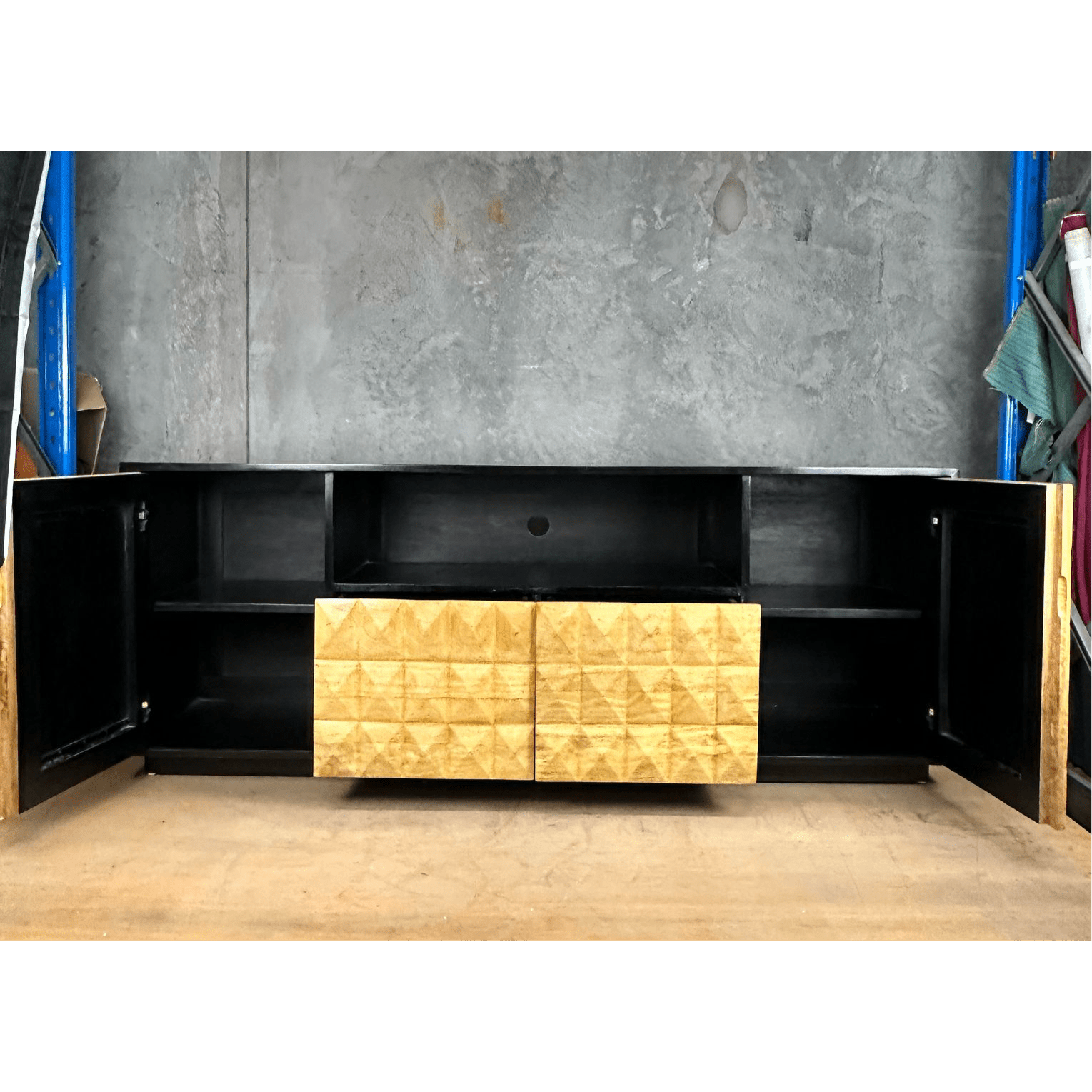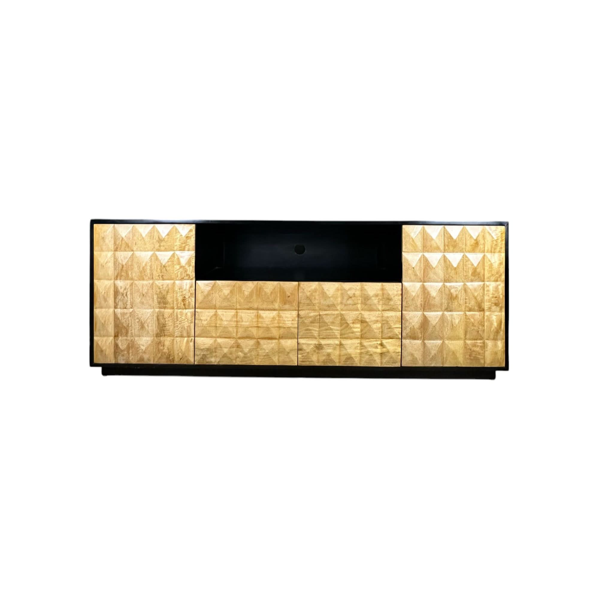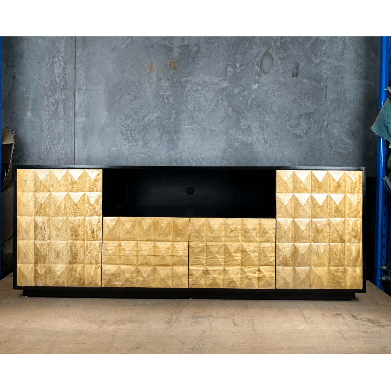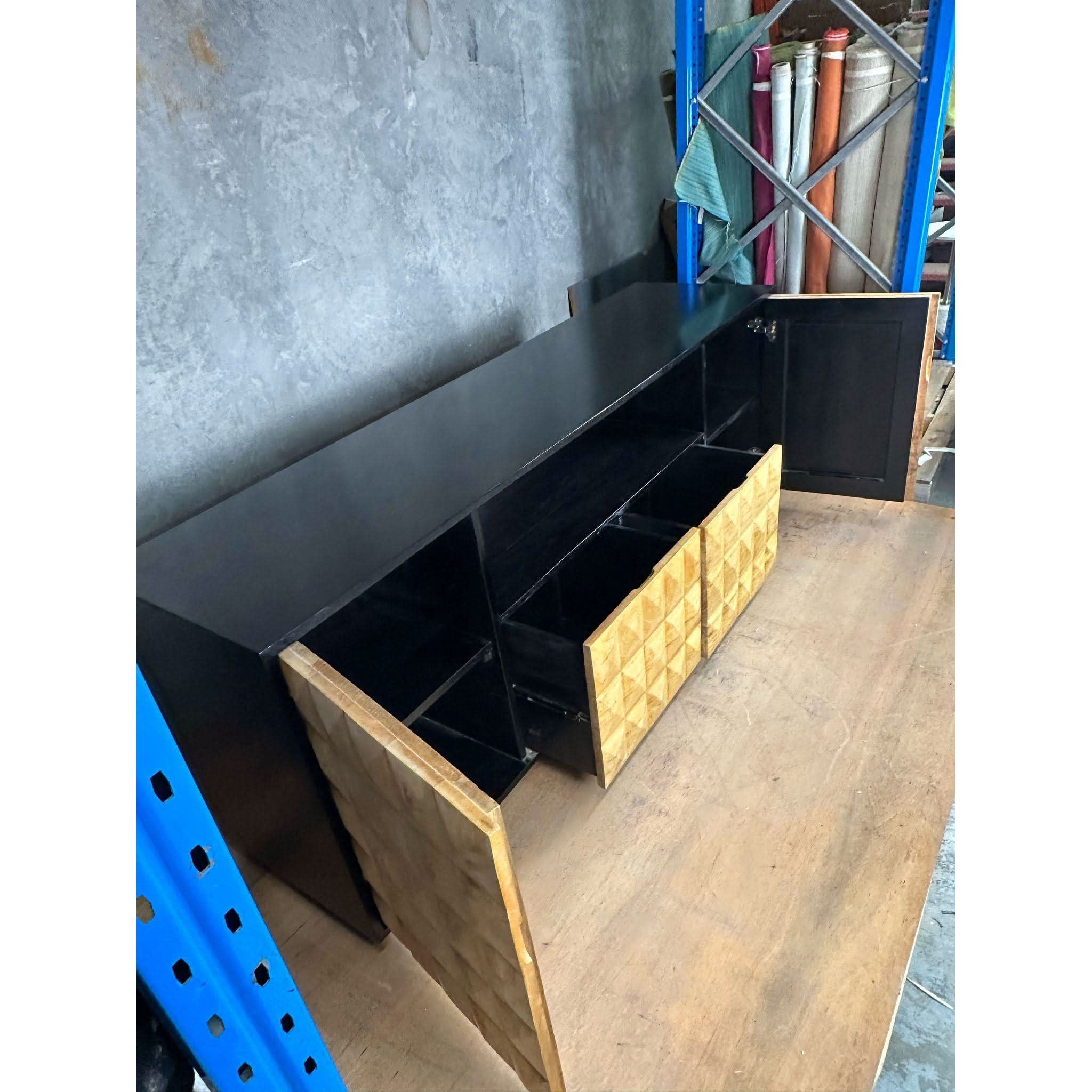 DIAMOND buffet Solid mango wood buffet. This gorgeous statement piece will be a focal point of your lounge room. Two shelved cupboards and two deep drawers. Great for storage. Gently used, we have re-oiled it and it is looking glam. Some minor scratches on the top. Includes hole for electrical cords. Dimensions: 2000mm x 500mm x 760mm high.