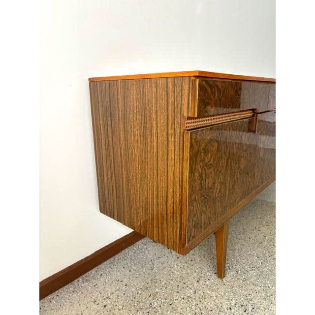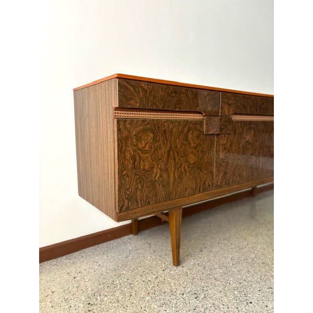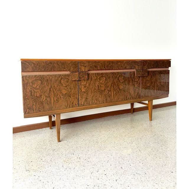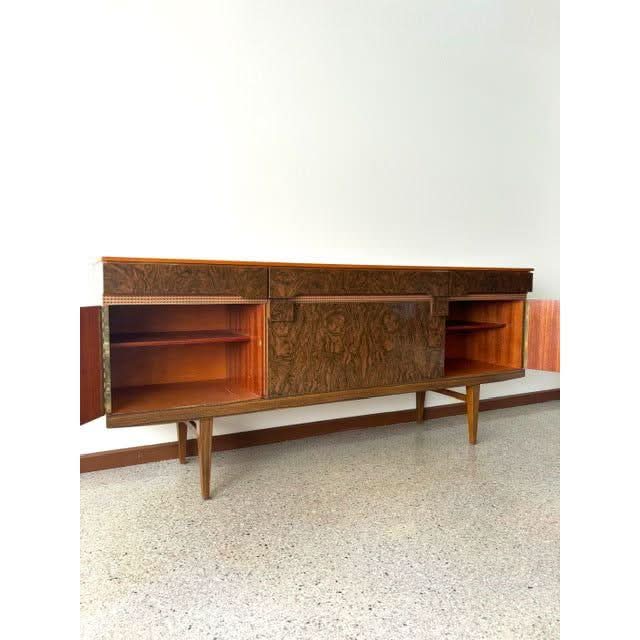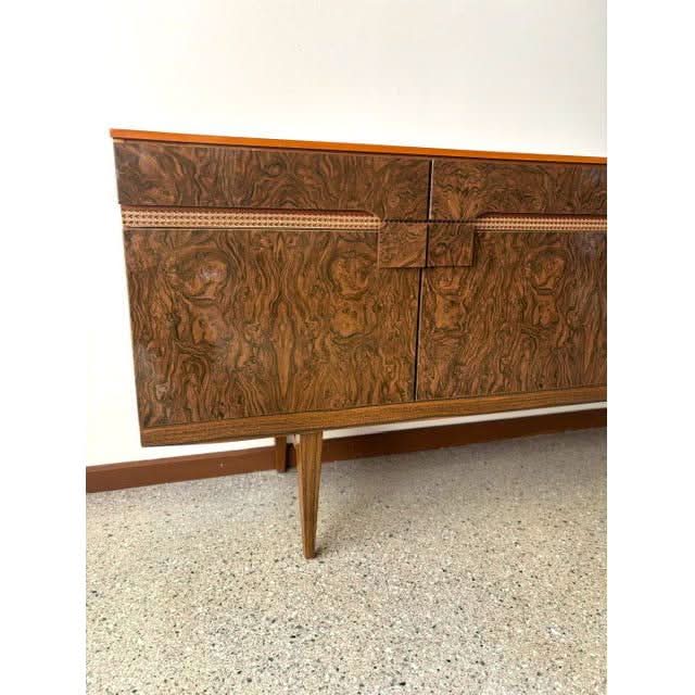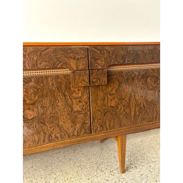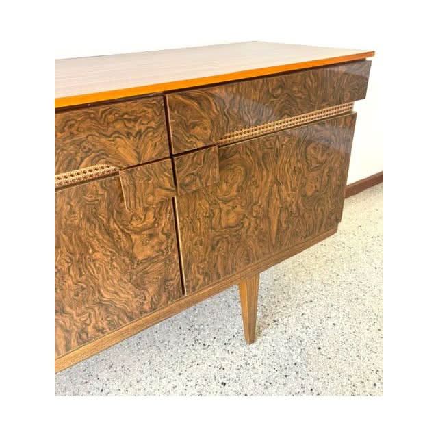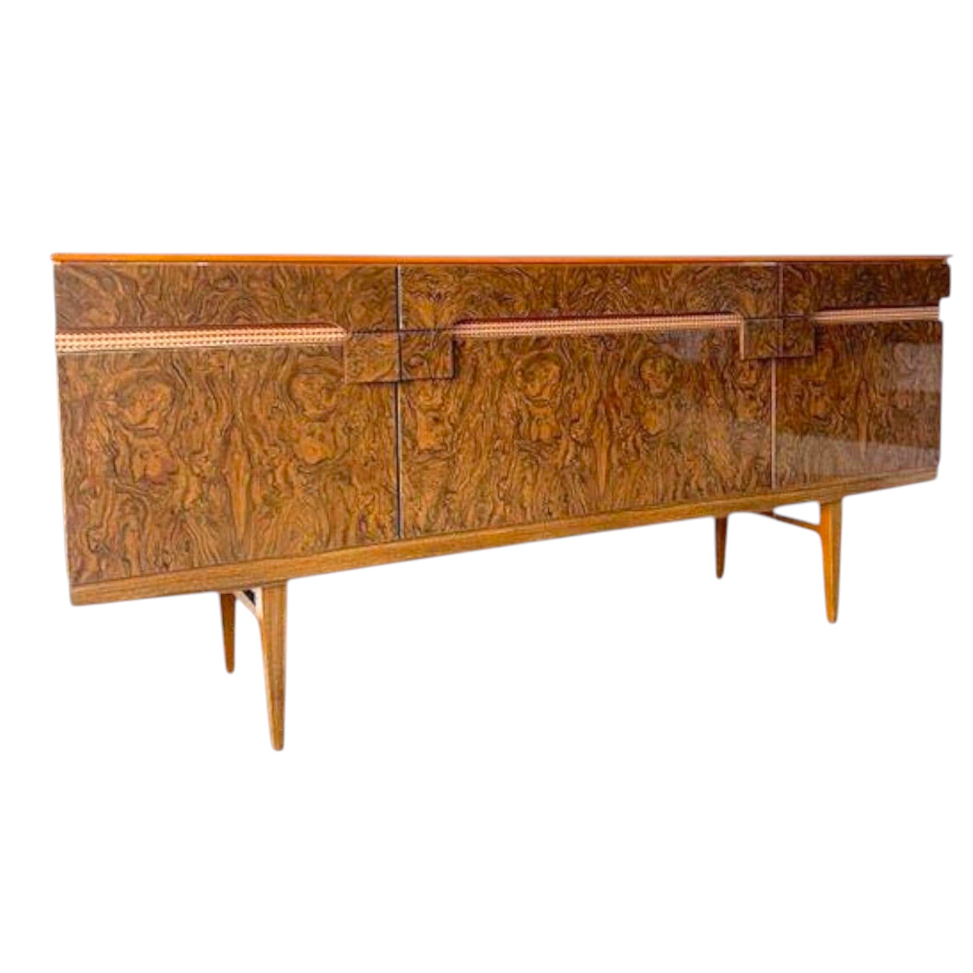 Uniquely striking 1950-60’s London based Beautility walnut burr sideboard with rattan insert detail.