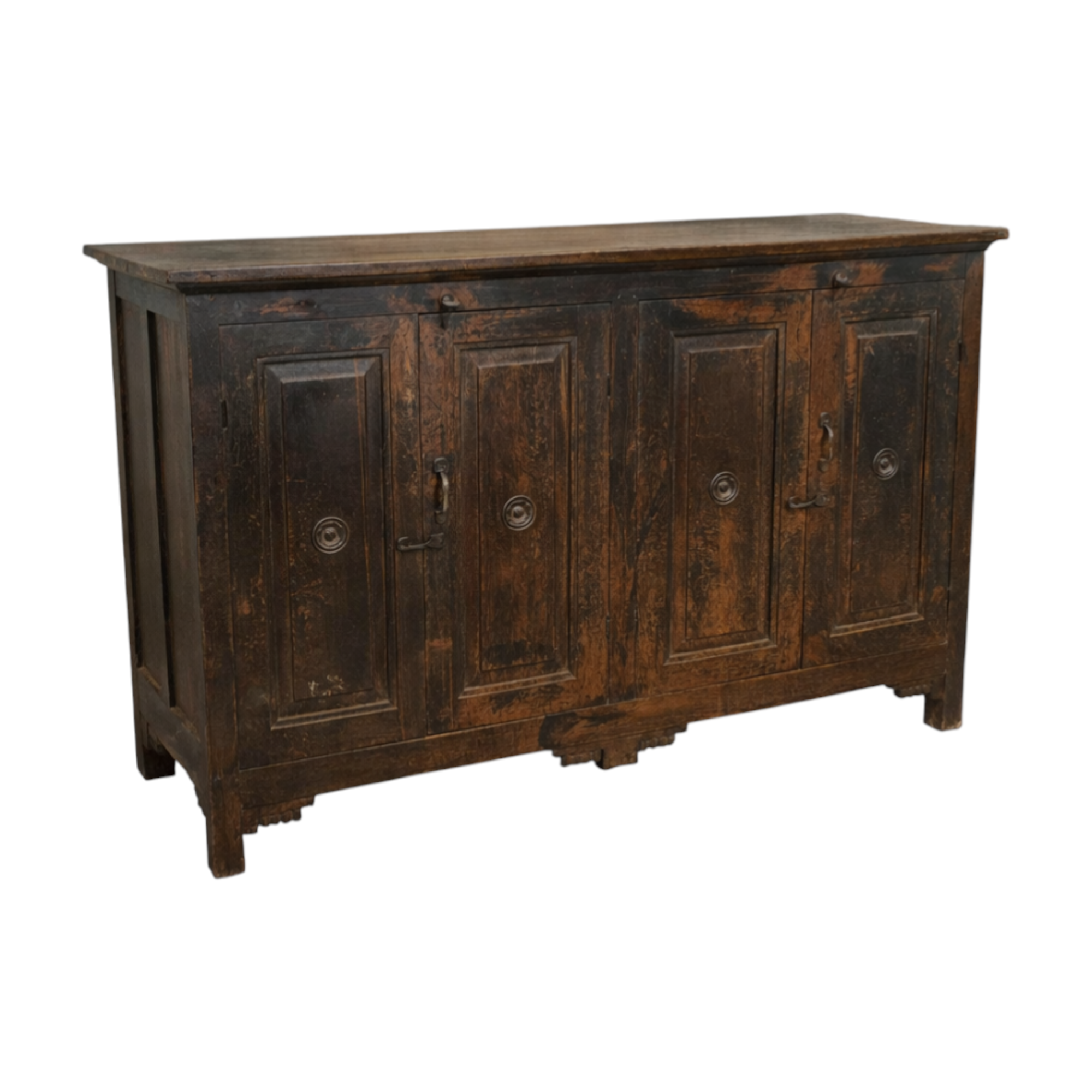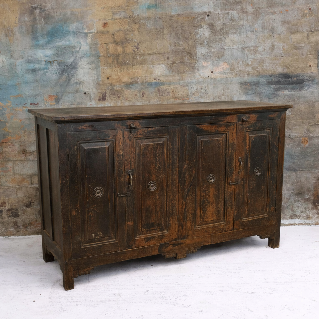 This particular antique Indian sideboard features four panelled cabinet doors with traditional iron hardware, opening to generous internal storage space. The rich, dark timber tones and distressed finish highlight the natural grain and rustic beauty of the wood, making it a striking statement piece while remaining highly functional.