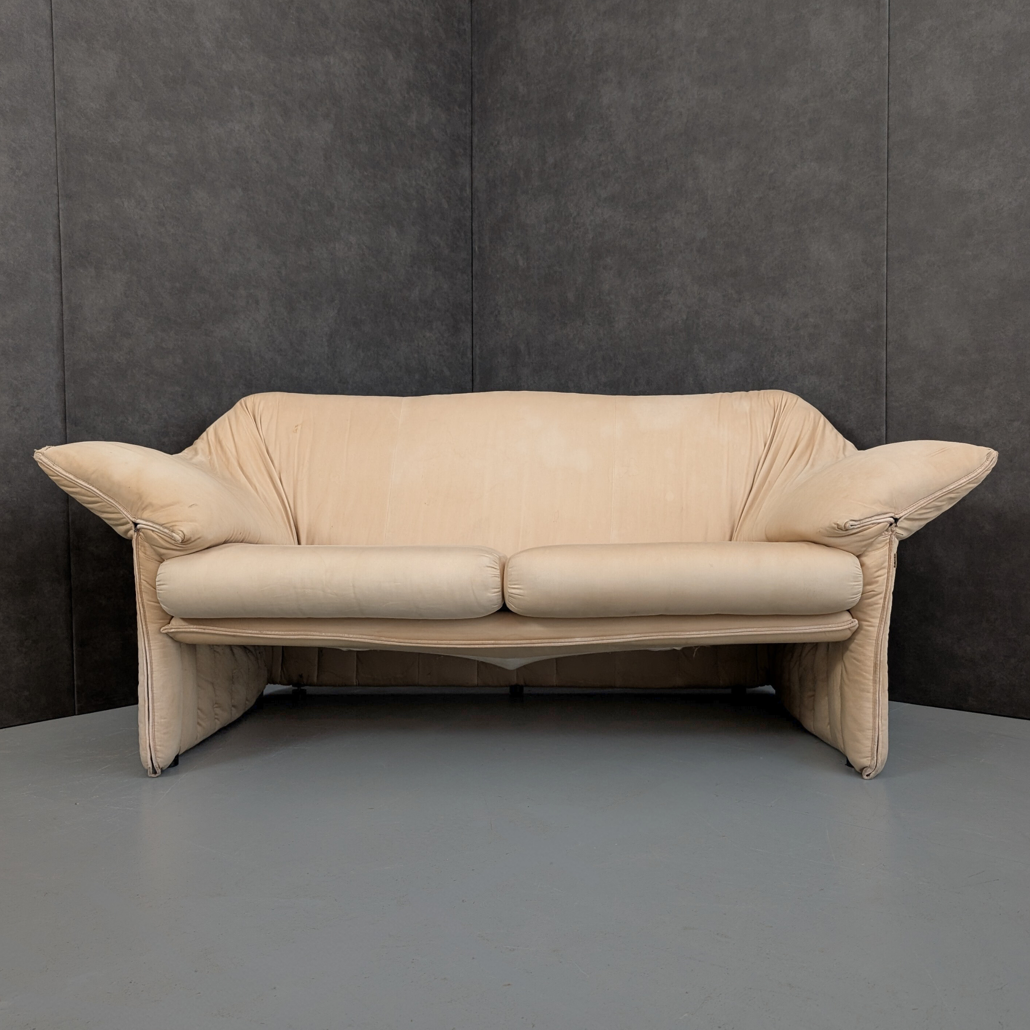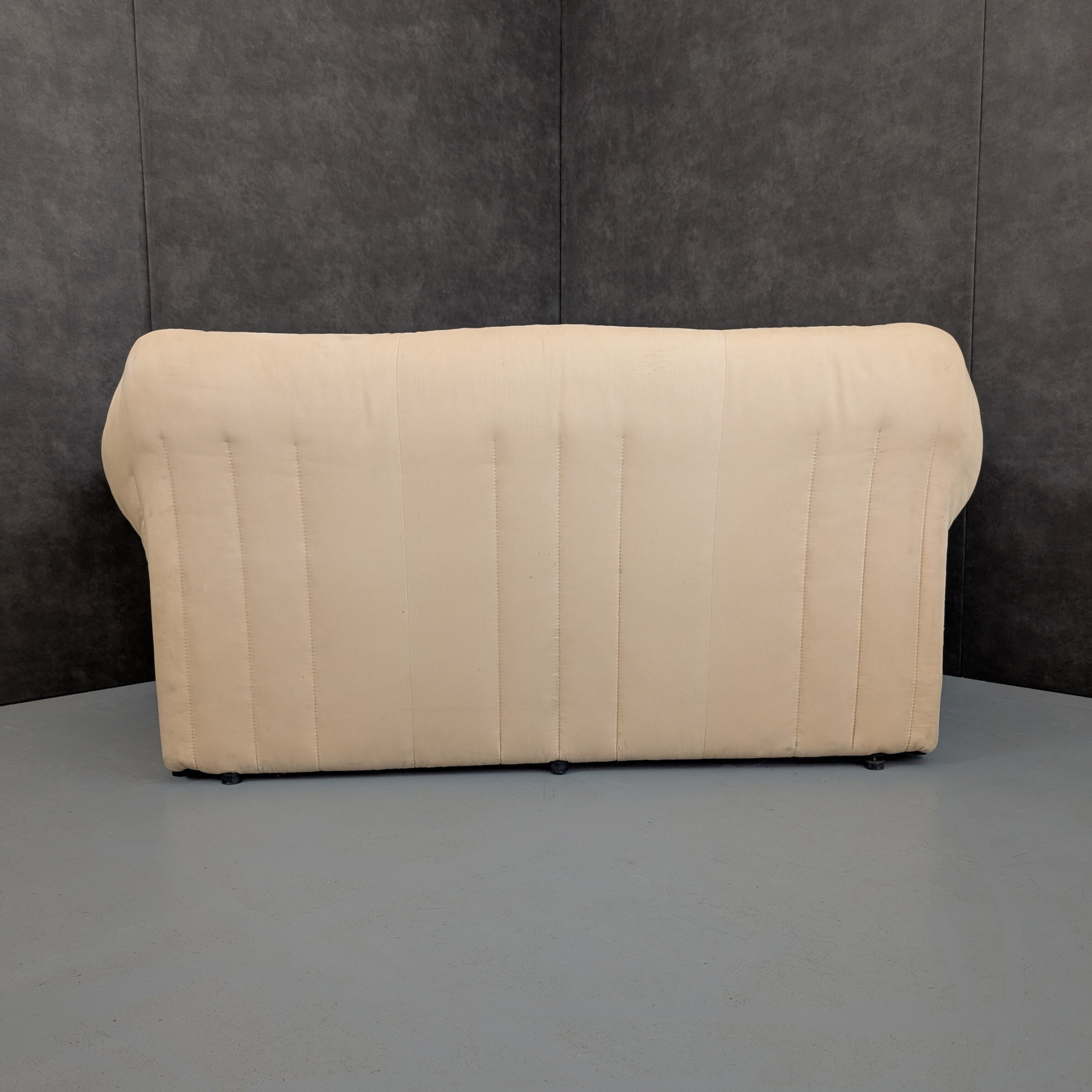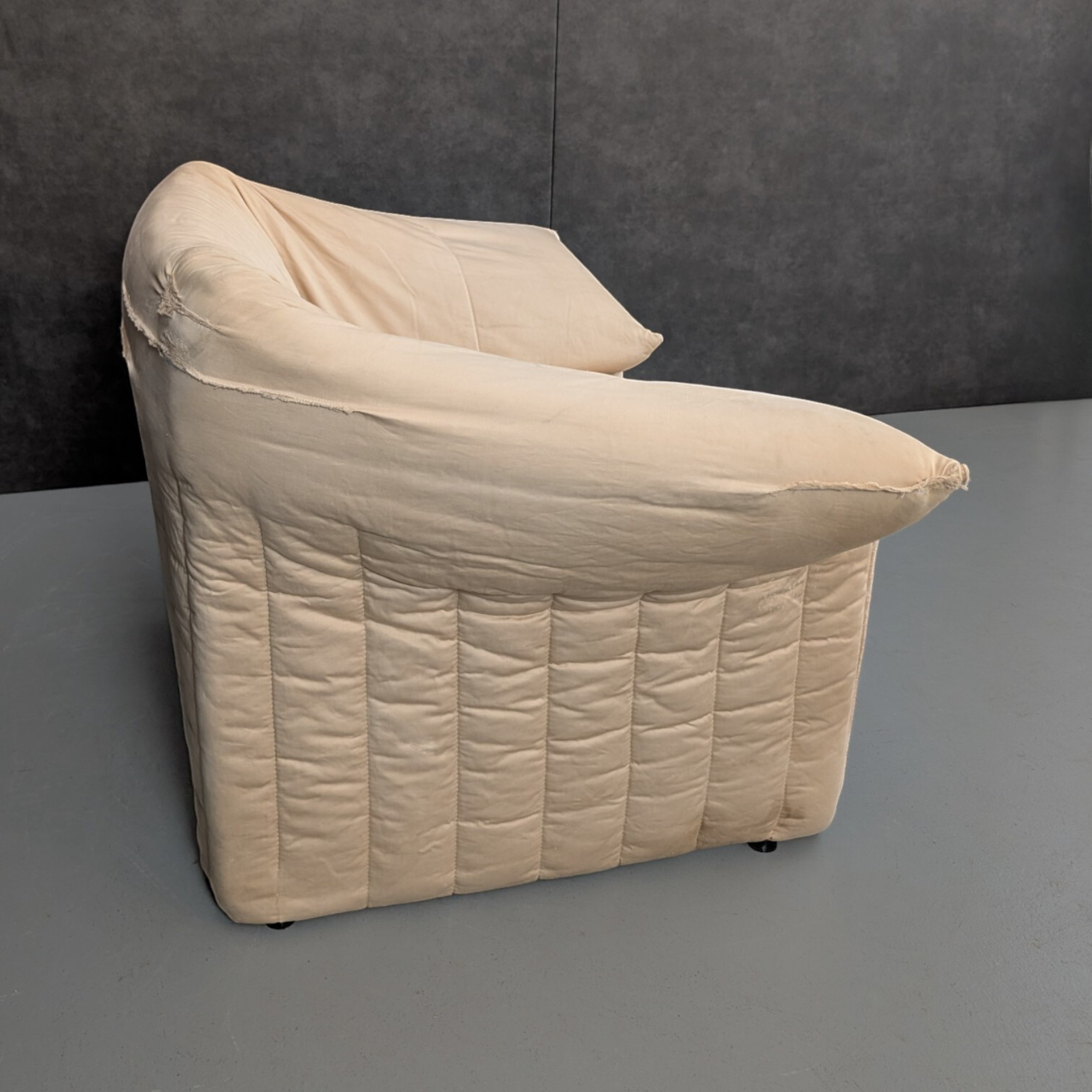 Designed by Mario Bellini for B&B Italia and produced in Italy in 1980, the Le Stelle series sits within a period of Italian furniture focused on comfort, scale, and long term use. The three seater, two seater, and armchair share the same stitched panel construction, generous proportions, and low seating height, forming a cohesive suite with consistent dimensions and visual weight. Broad arms and deep seats define the series without decorative excess.