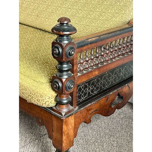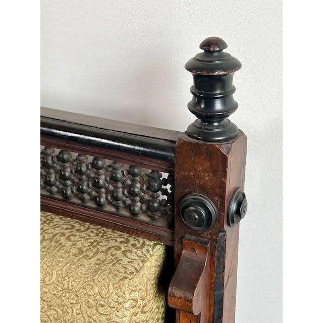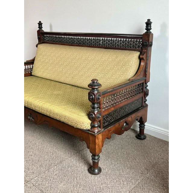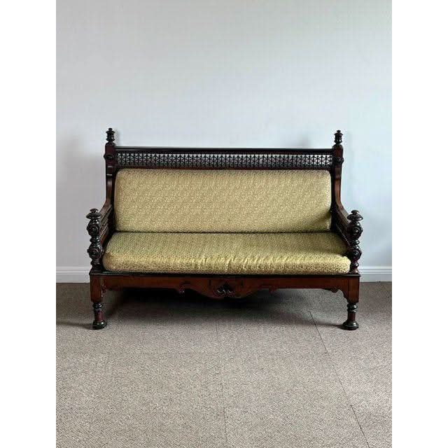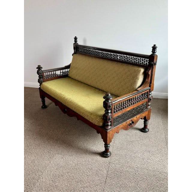 Condition: Over all very good commensurate with age and use. There are some losses to the finer turnings however our professional restorer says that is not a problem for him to replace the missing turnings plus detail the settee in general once it is sold and before it is ready for collection. The cushions are removable so are easy to recover to individual taste.