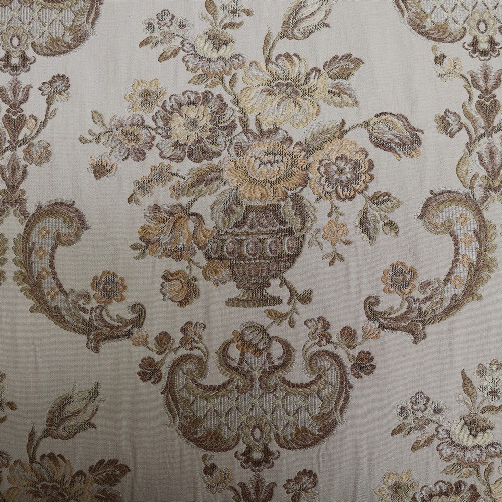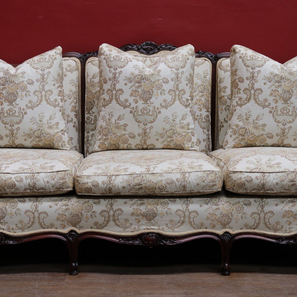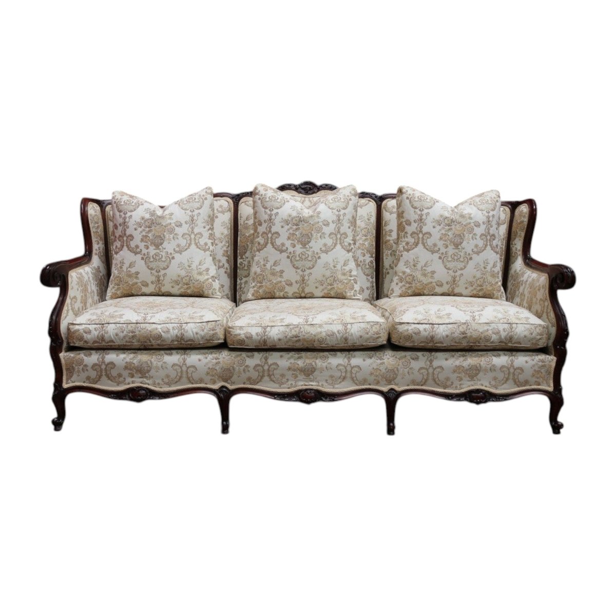 Upholstered in a cream ivory fabric with a floral and scrollwork pattern, the sofa includes feather-filled seat cushions and matching loose pillows for added comfort. A luxurious and elegant piece with presence and character.