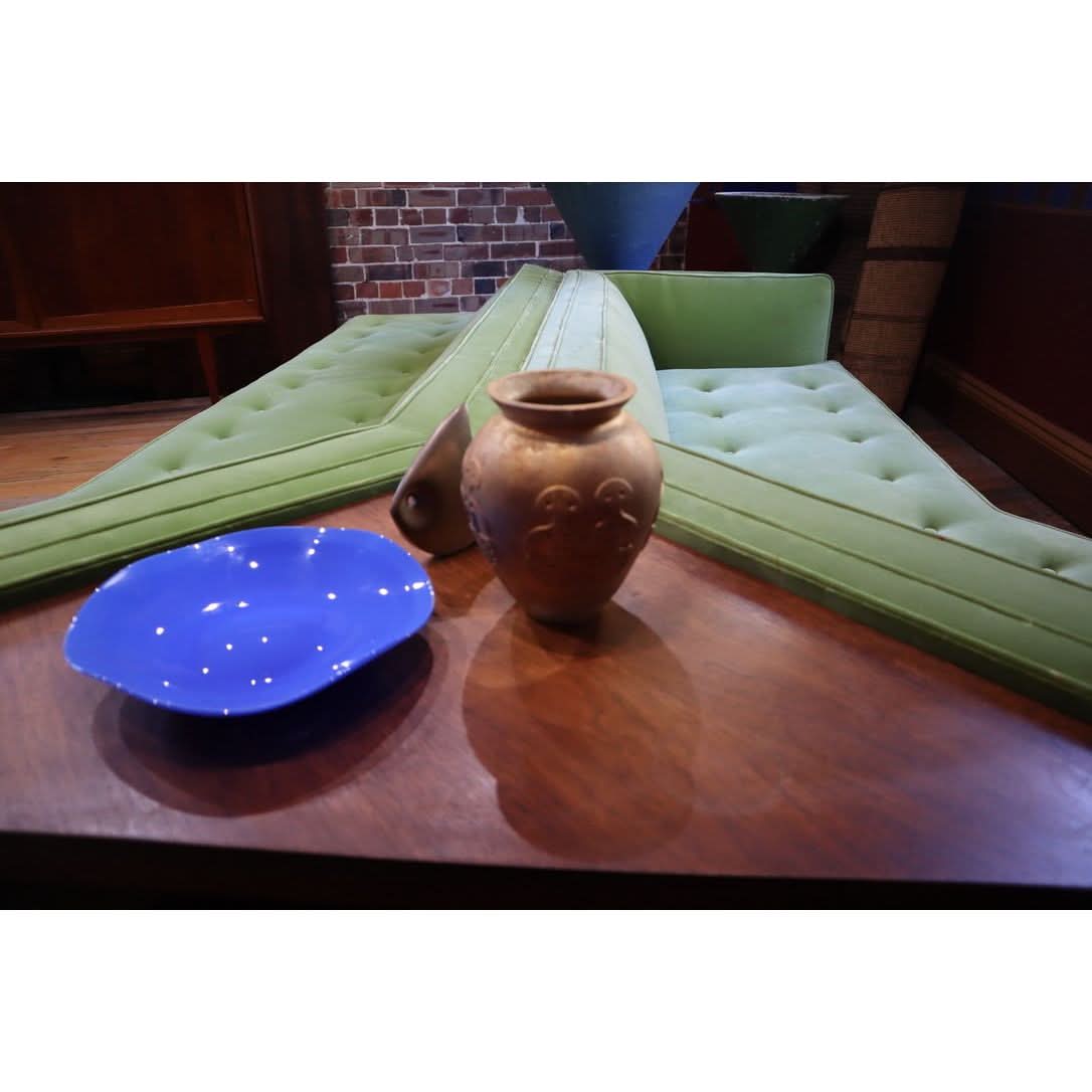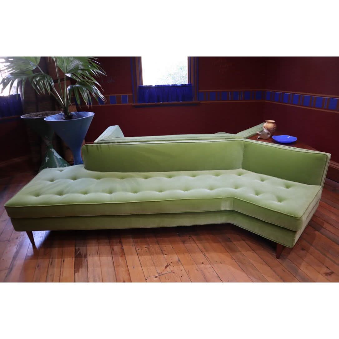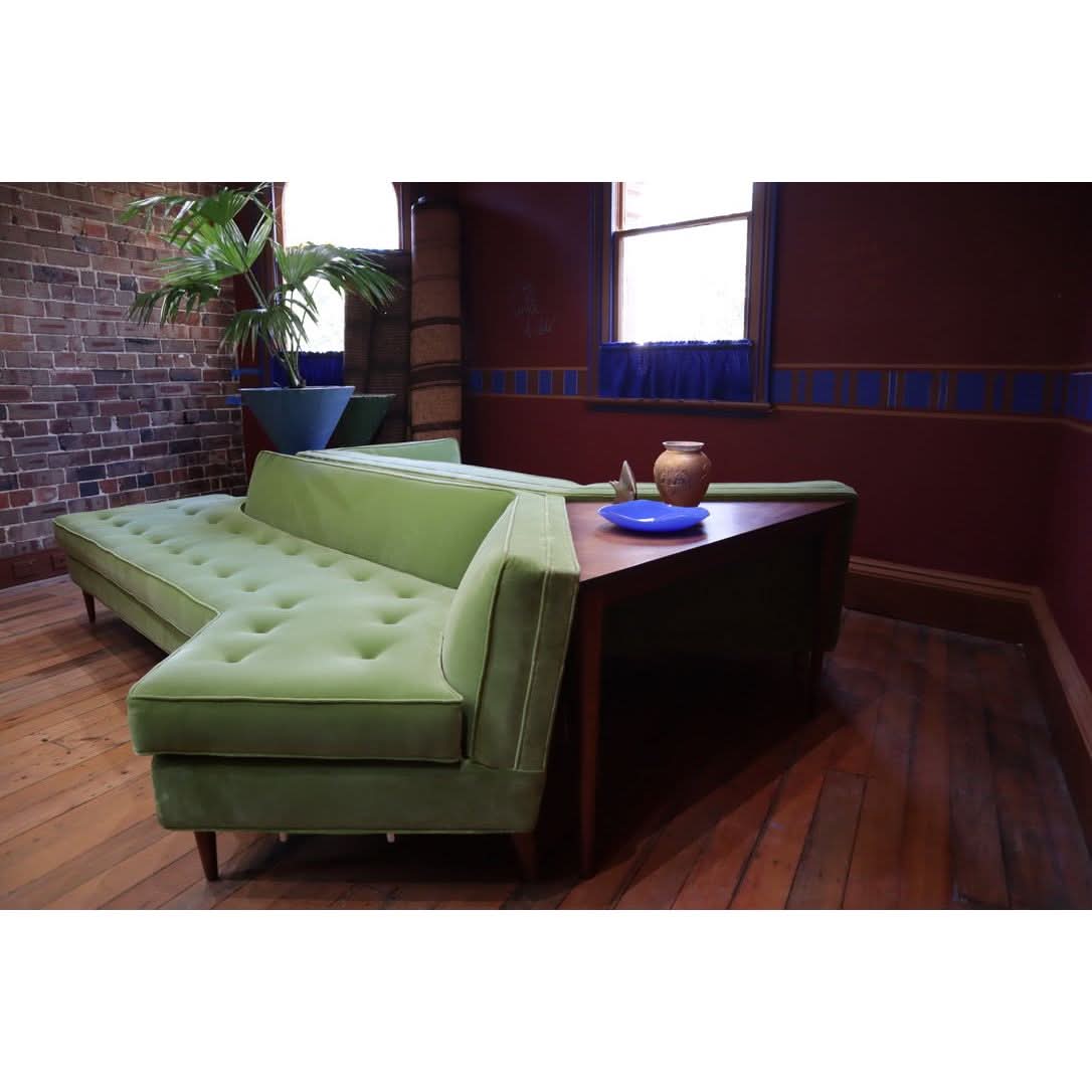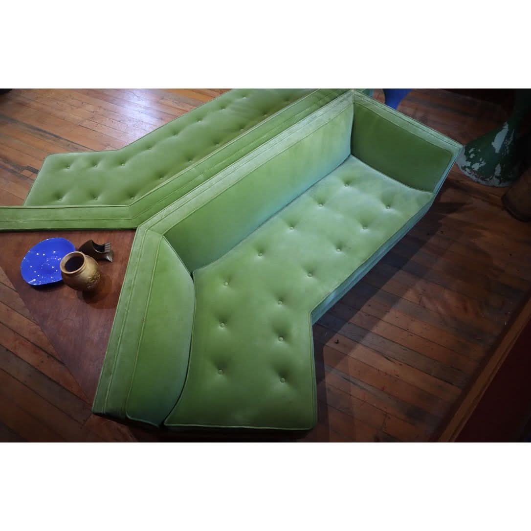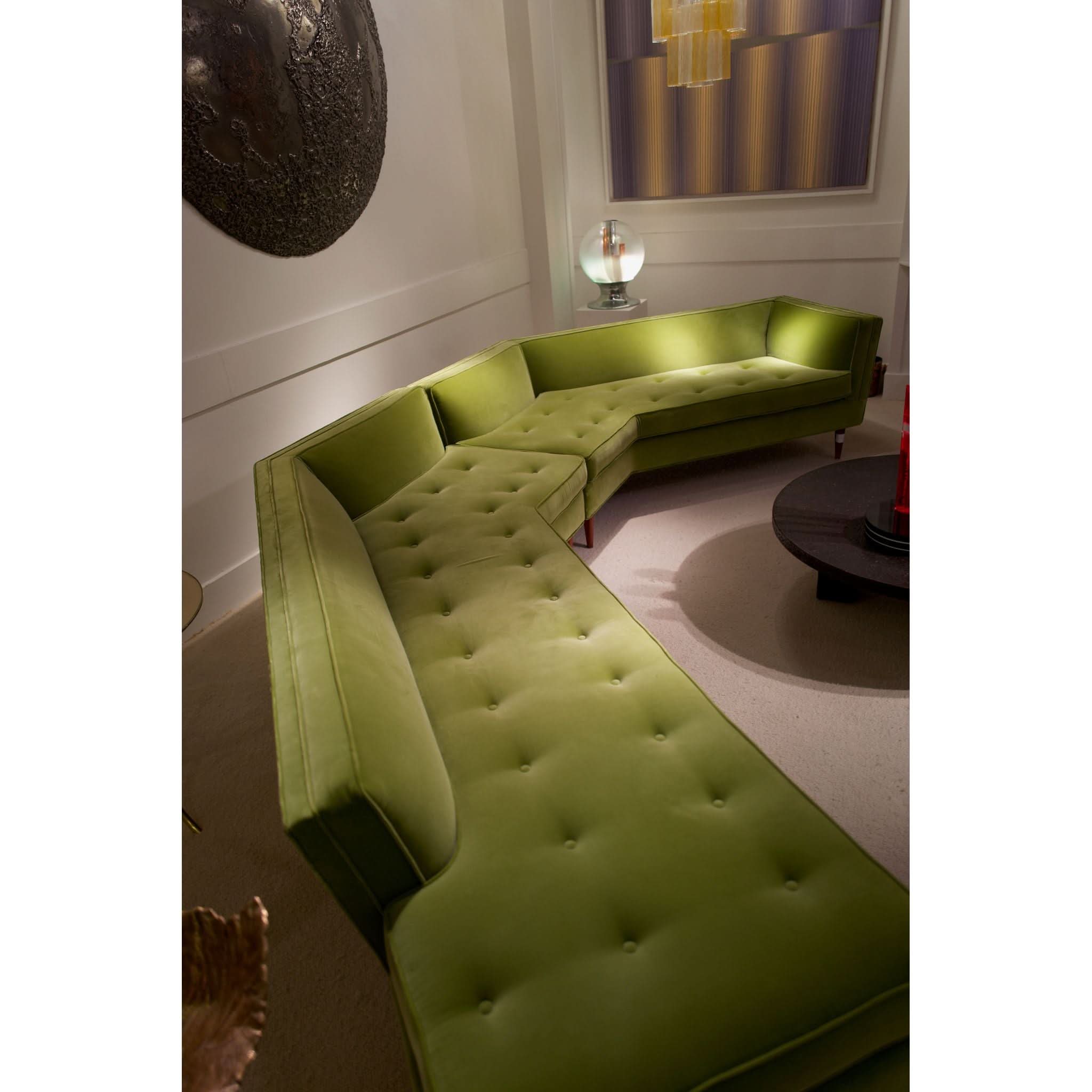 The most stunning modular large sofa in solid walnut and green mohair velvet by Bertha Schaefer. c.1950 Truly a unique piece. H:710mm W:4360mm D:215mm
