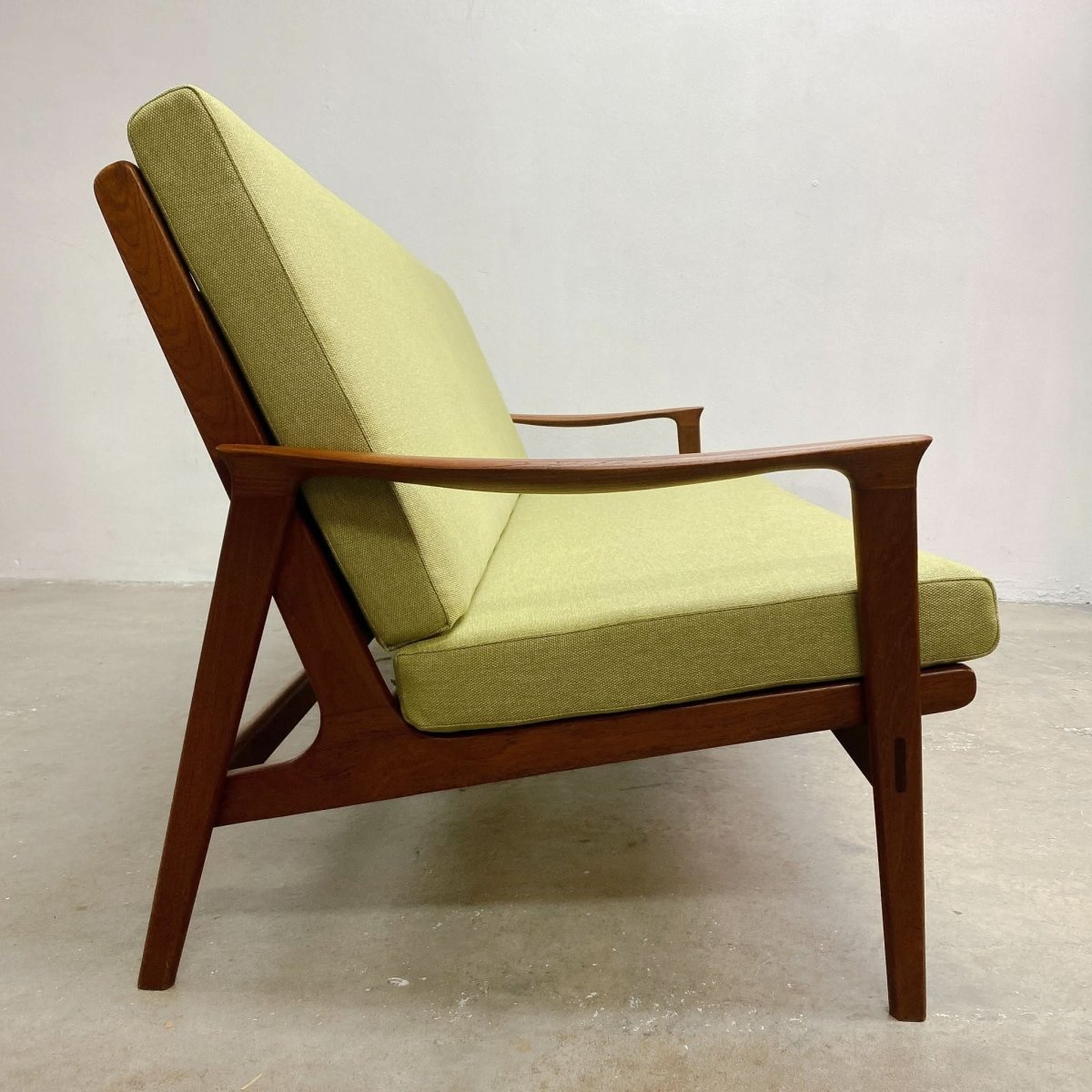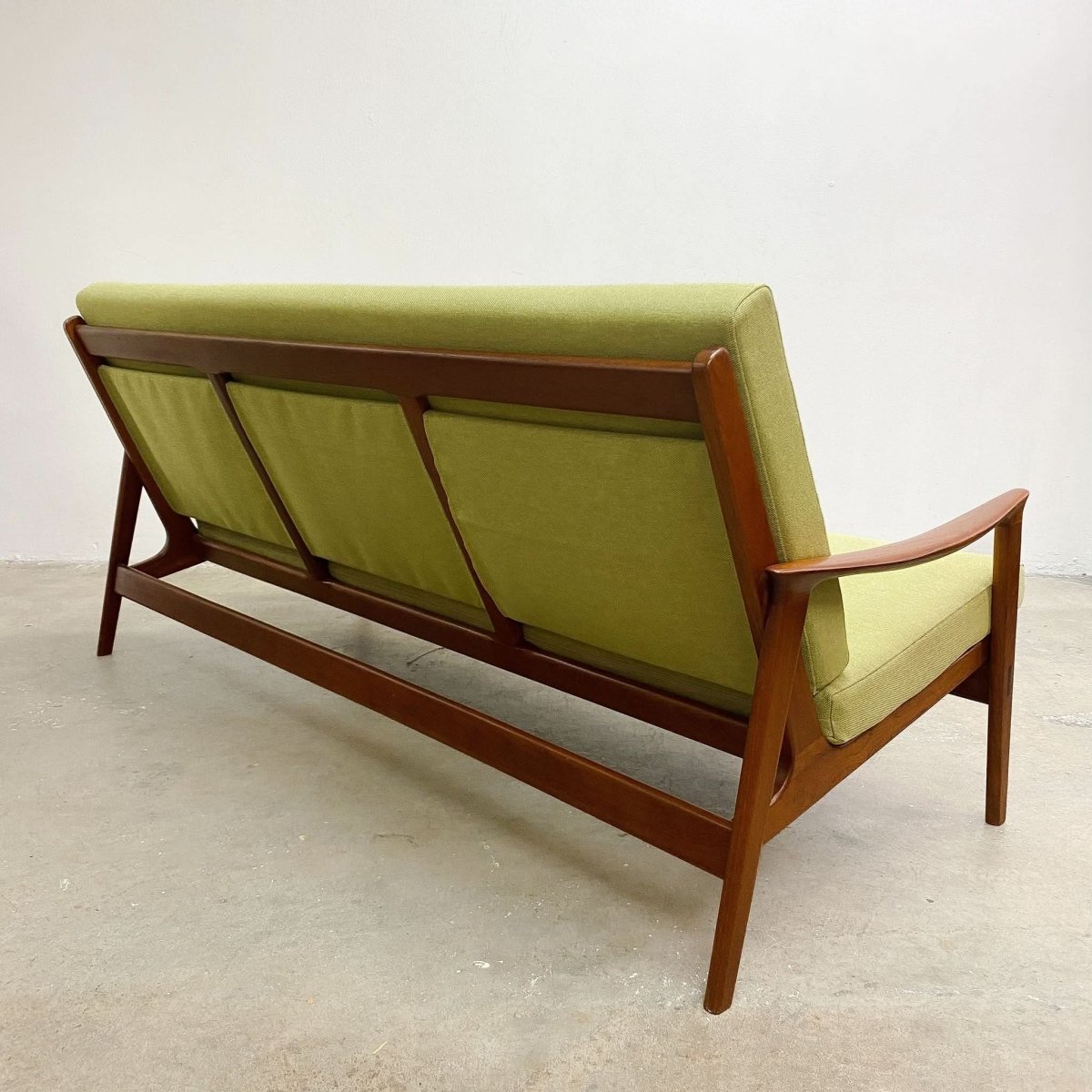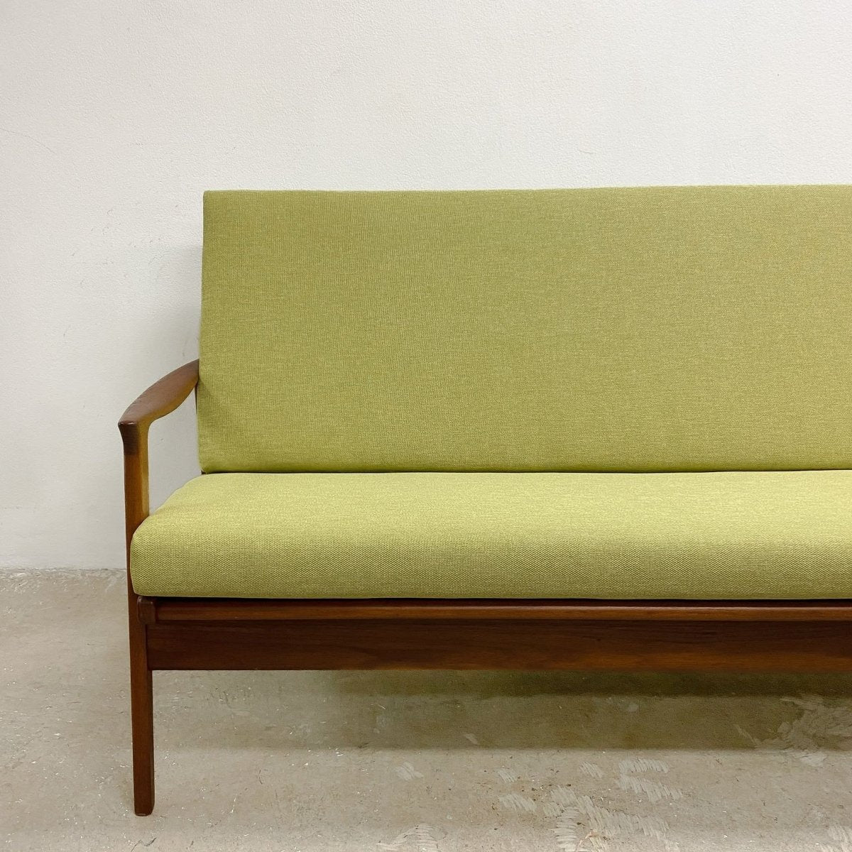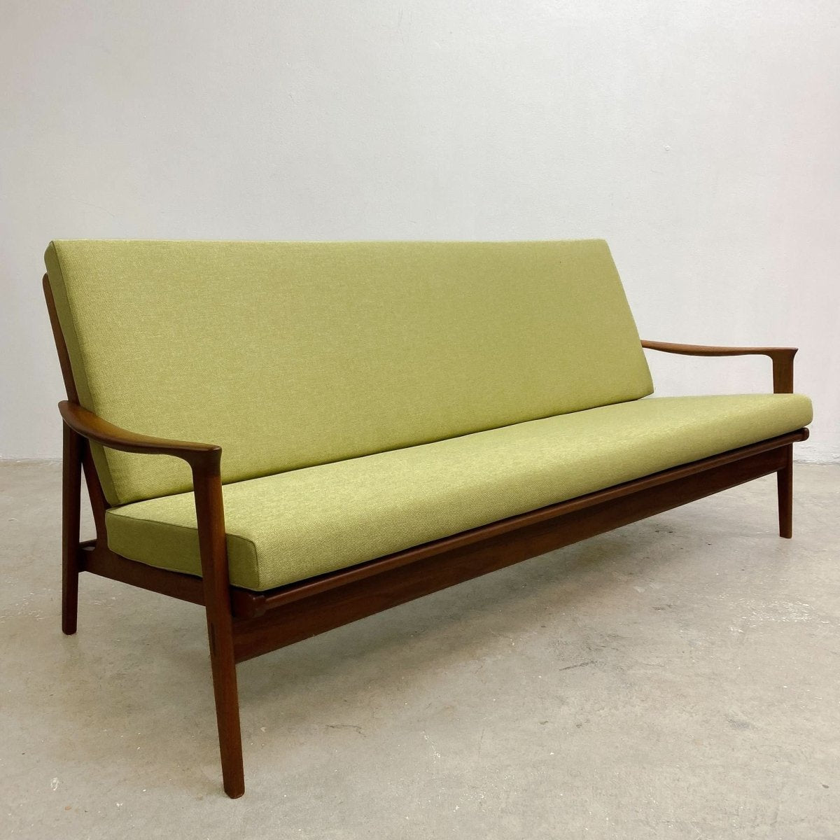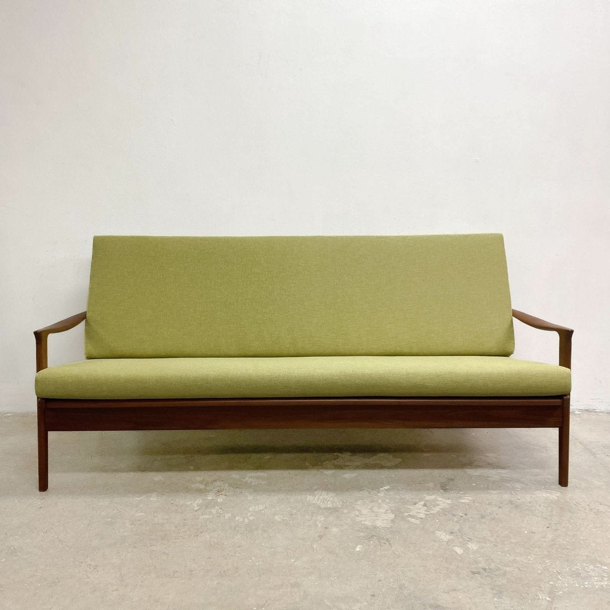Restored mid century quality Parker teak 3 seater sofa, model number 158. The frame has been refinished, there is a new strapping and upholstery with new foam inserts.