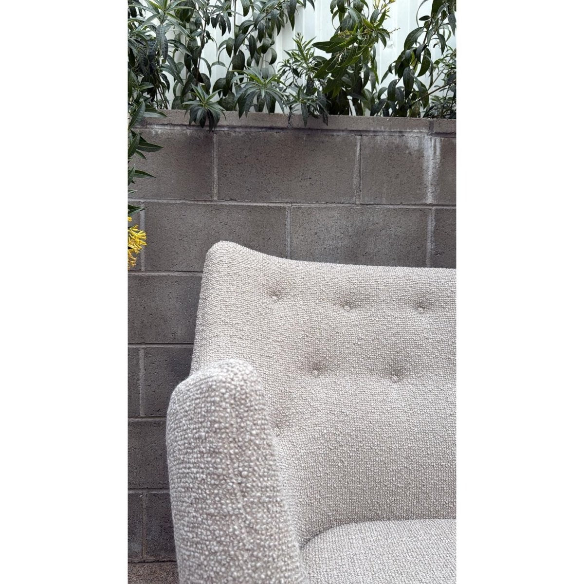 The sofa is now in pristine condition, arguably better than new, thanks to the superior materials and expert craftsmanship involved in its restoration. The solid walnut legs have been carefully sanded and finished with two coats of clear matte lacquer, resulting in a flawless, refined appearance. Every detail, from the foam selection to the upholstery, has been executed with precision and care.