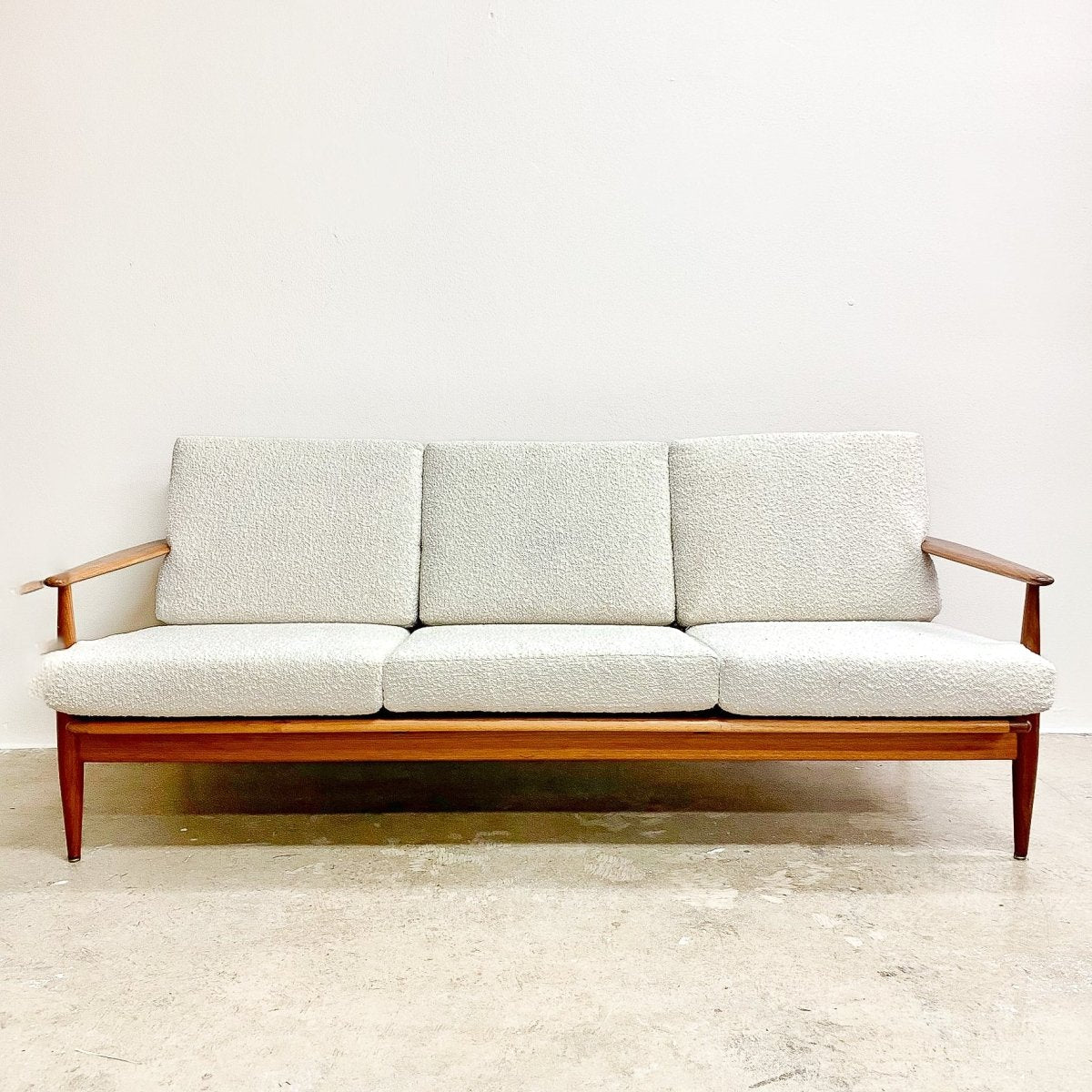 Excellent recently restored frame and recently upholstery by the previous owners in a white boucle fabric.