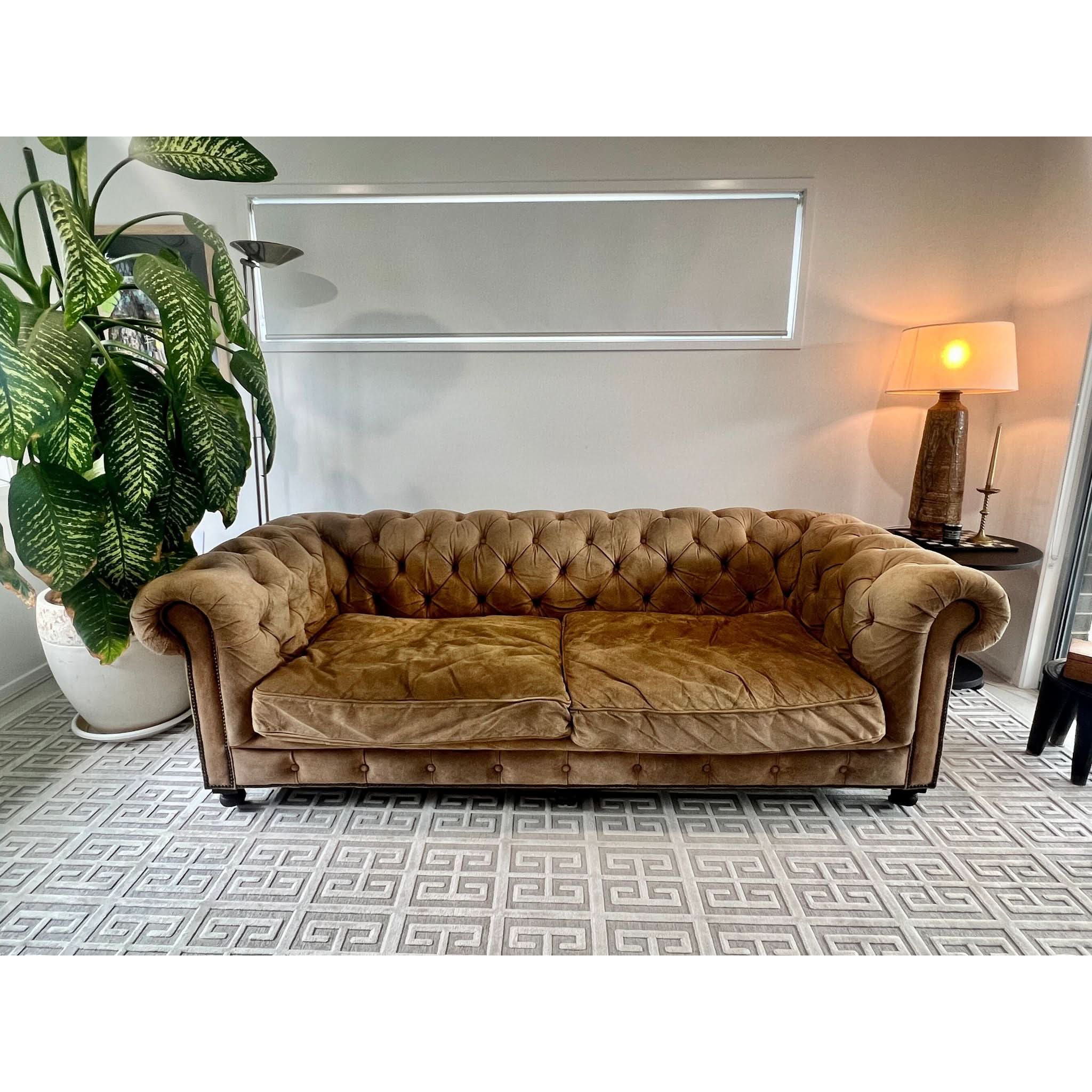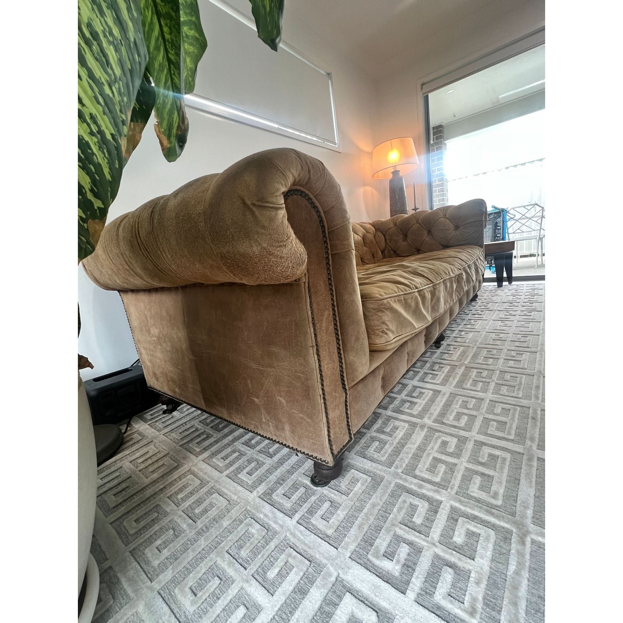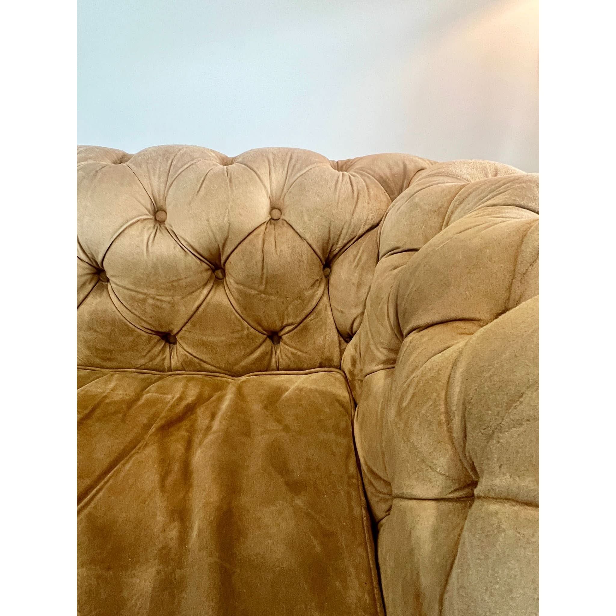 From the Timothy Oulton x Restoration Hardware collection, this suede Chesterfield features deep seating (78cm), classic tufting, and rolled arms. The suede has softened with age, developing a natural patina consistent with low use and no visible stains or damage. Like a great leather jacket, it only gets better with time—gaining character while retaining its timeless comfort and style.