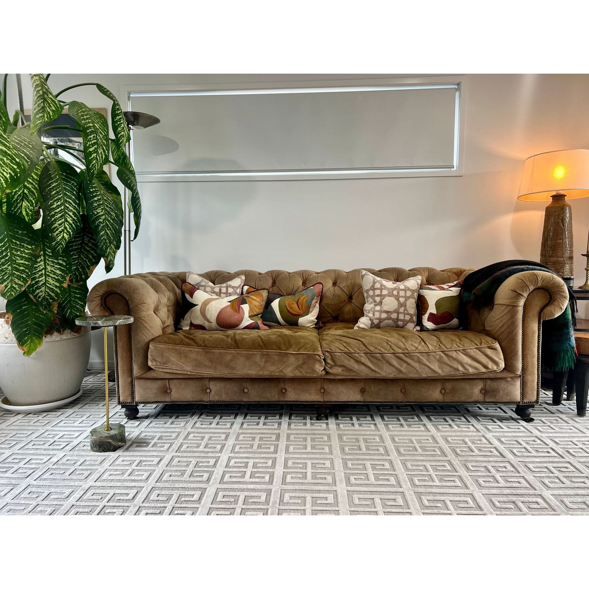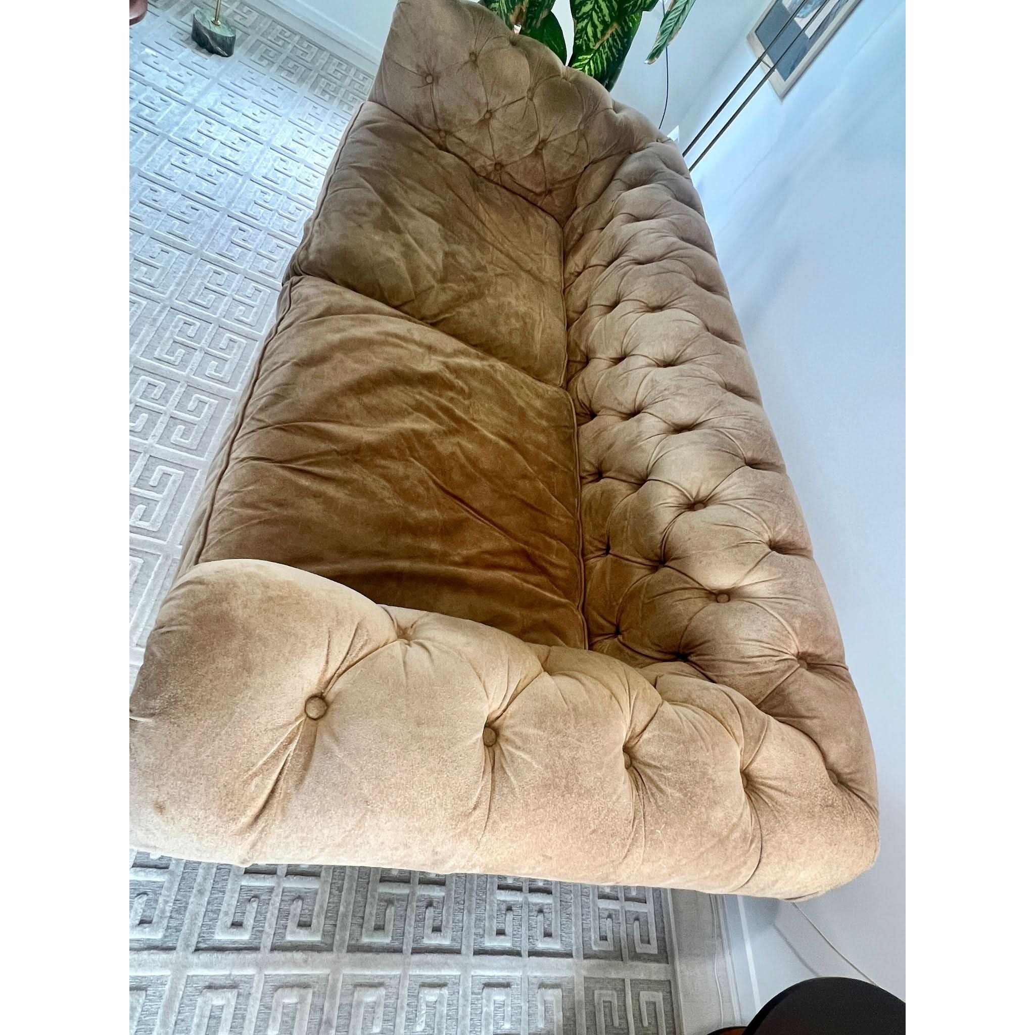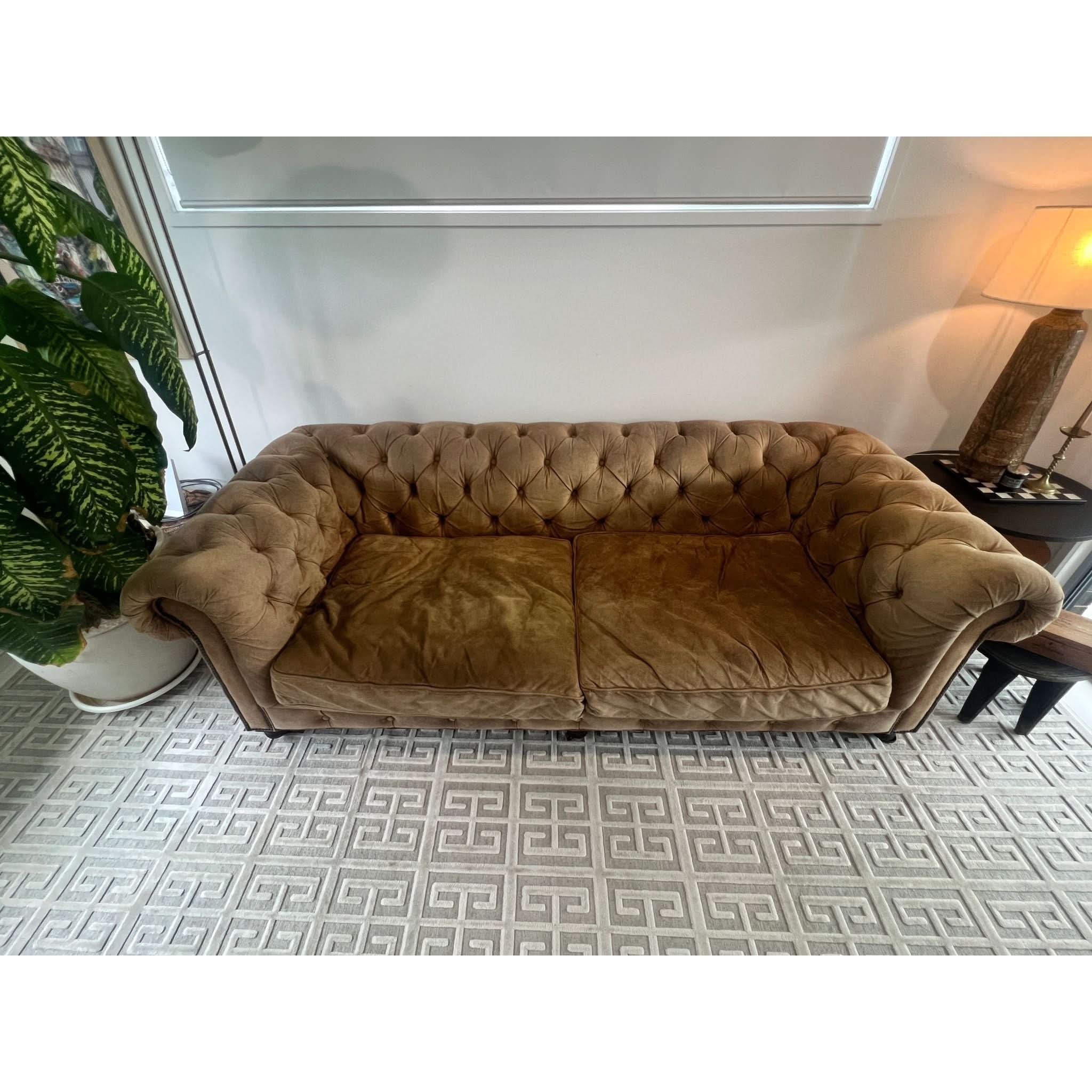 From the Timothy Oulton x Restoration Hardware collection, this suede Chesterfield features deep seating (78cm), classic tufting, and rolled arms. The suede has softened with age, developing a natural patina consistent with low use and no visible stains or damage. Like a great leather jacket, it only gets better with time—gaining character while retaining its timeless comfort and style.
