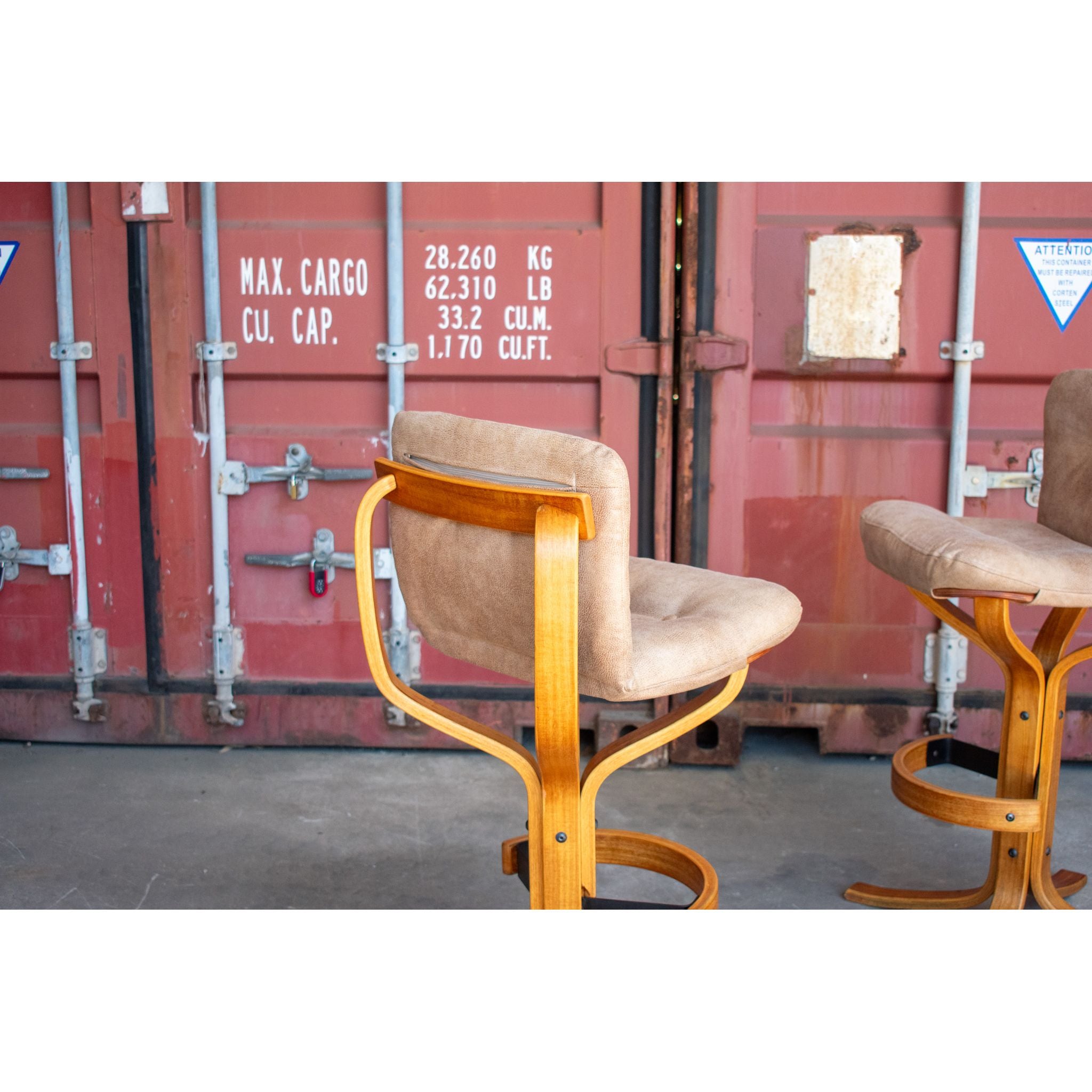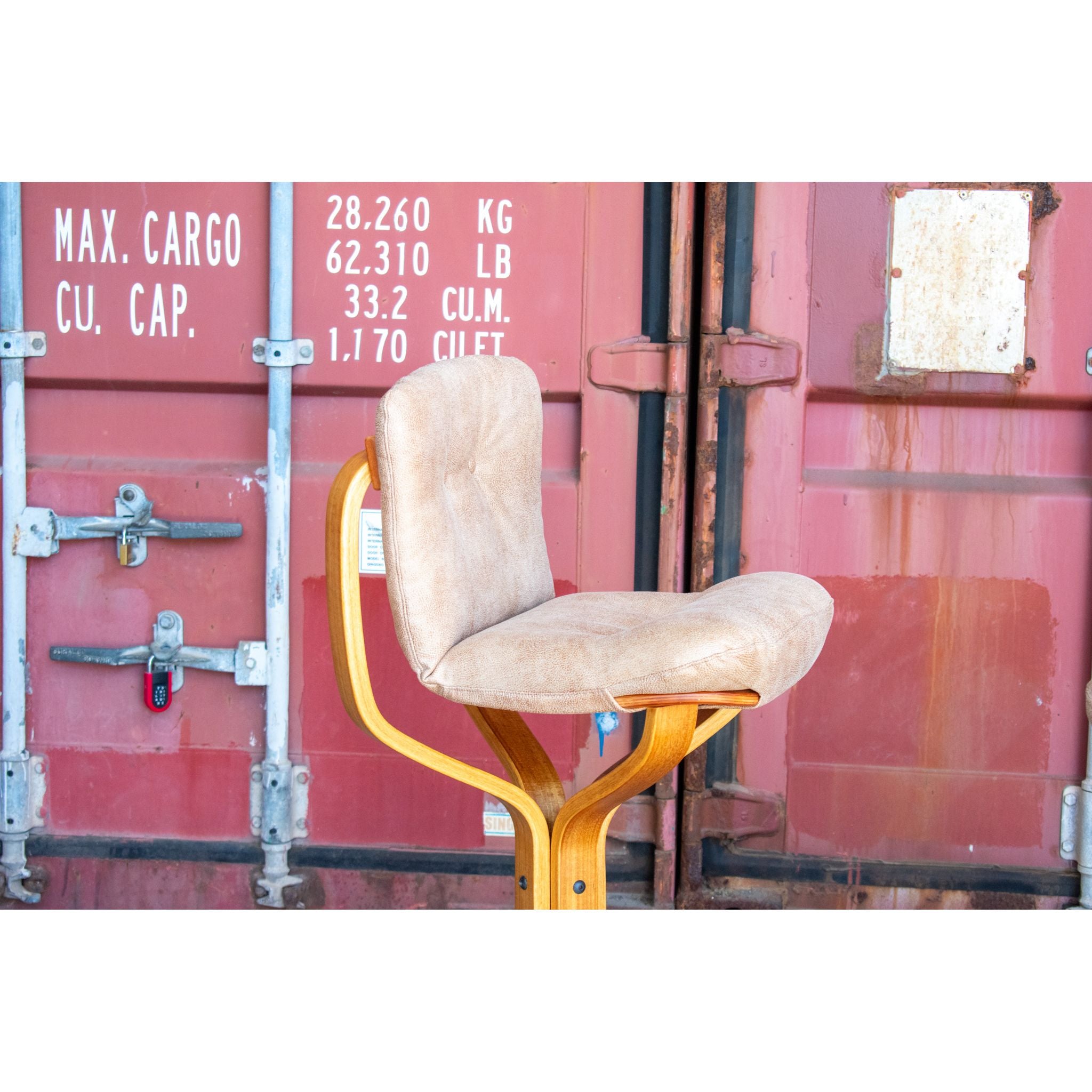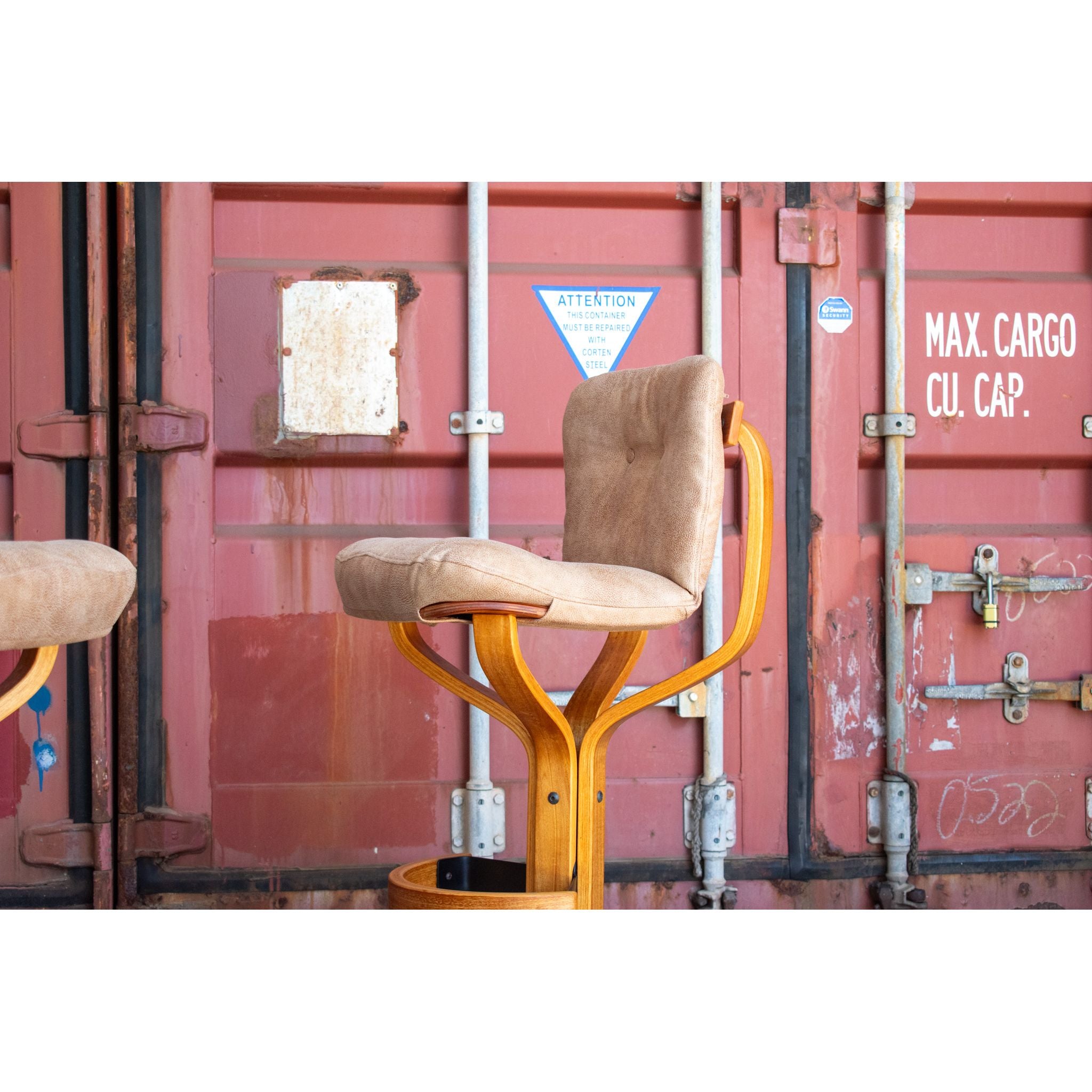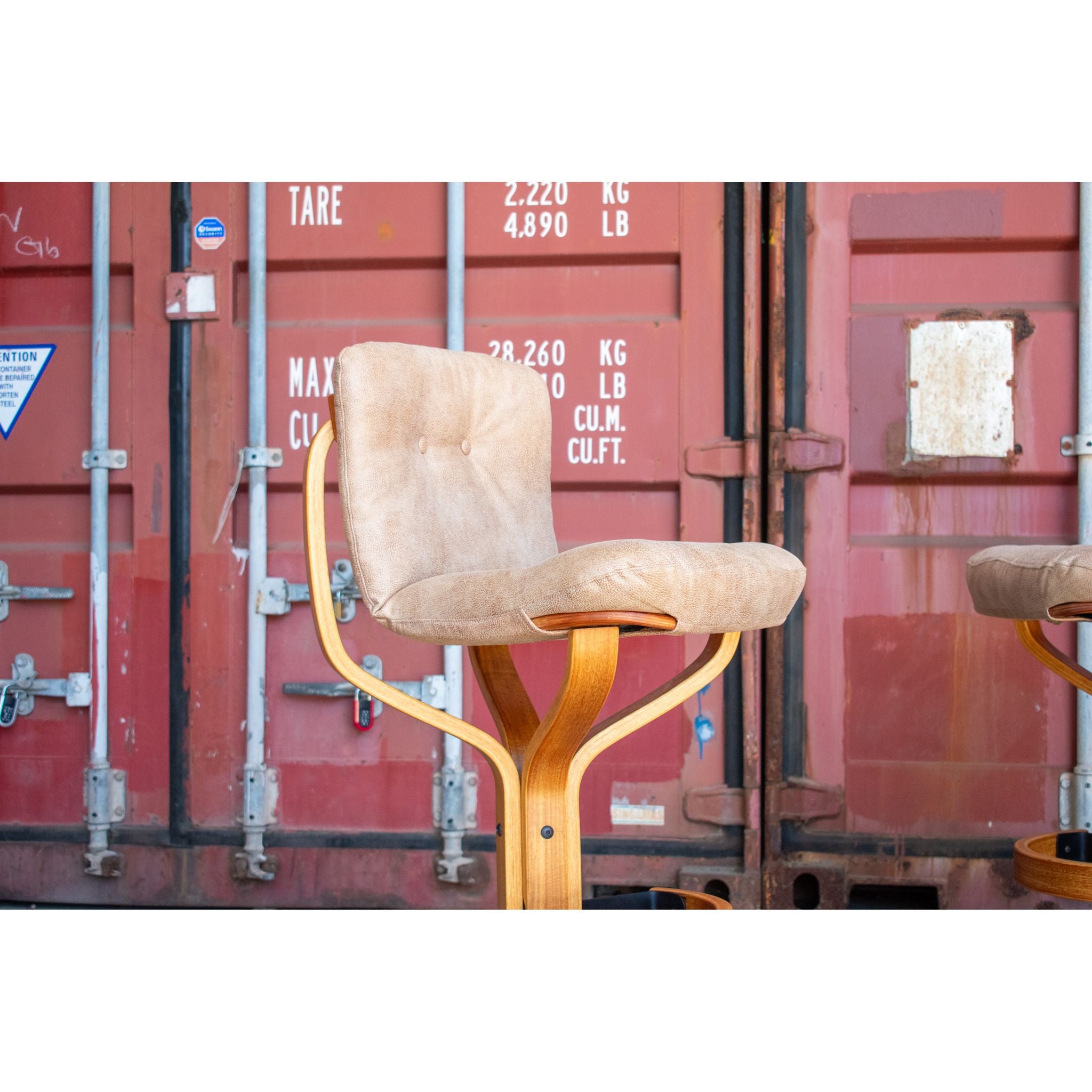 A rare matched pair of bar stools attributed to Joe Rufenacht, known for his sculptural timber forms and refined joinery. These stools have been fully restored in-house: frames stripped, sanded, and refinished with our durable oil blend to enhance grain depth and long-term resilience. Seats and backrests reupholstered in Warwick Eastwood Sand—a textured neutral that complements the timber beautifully.