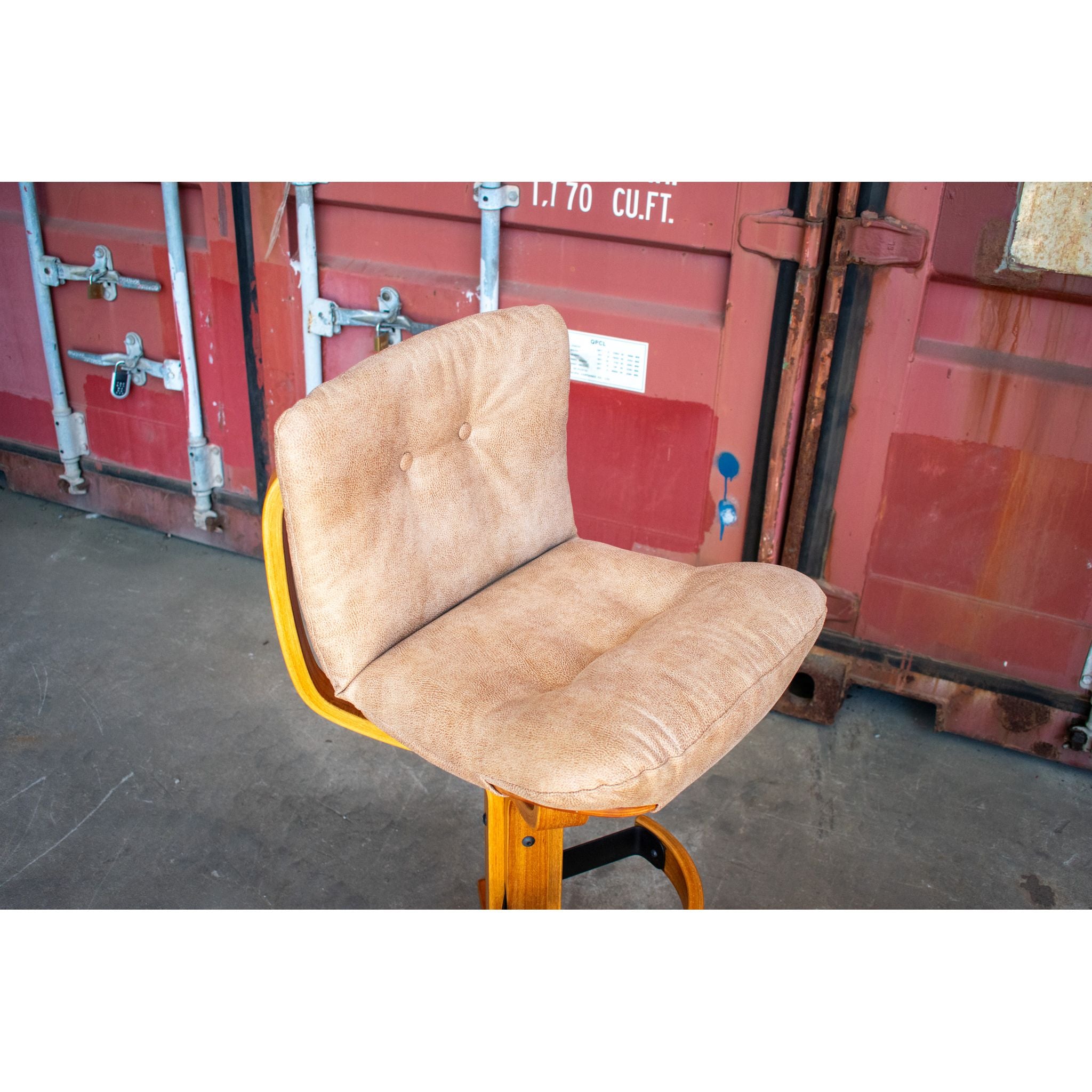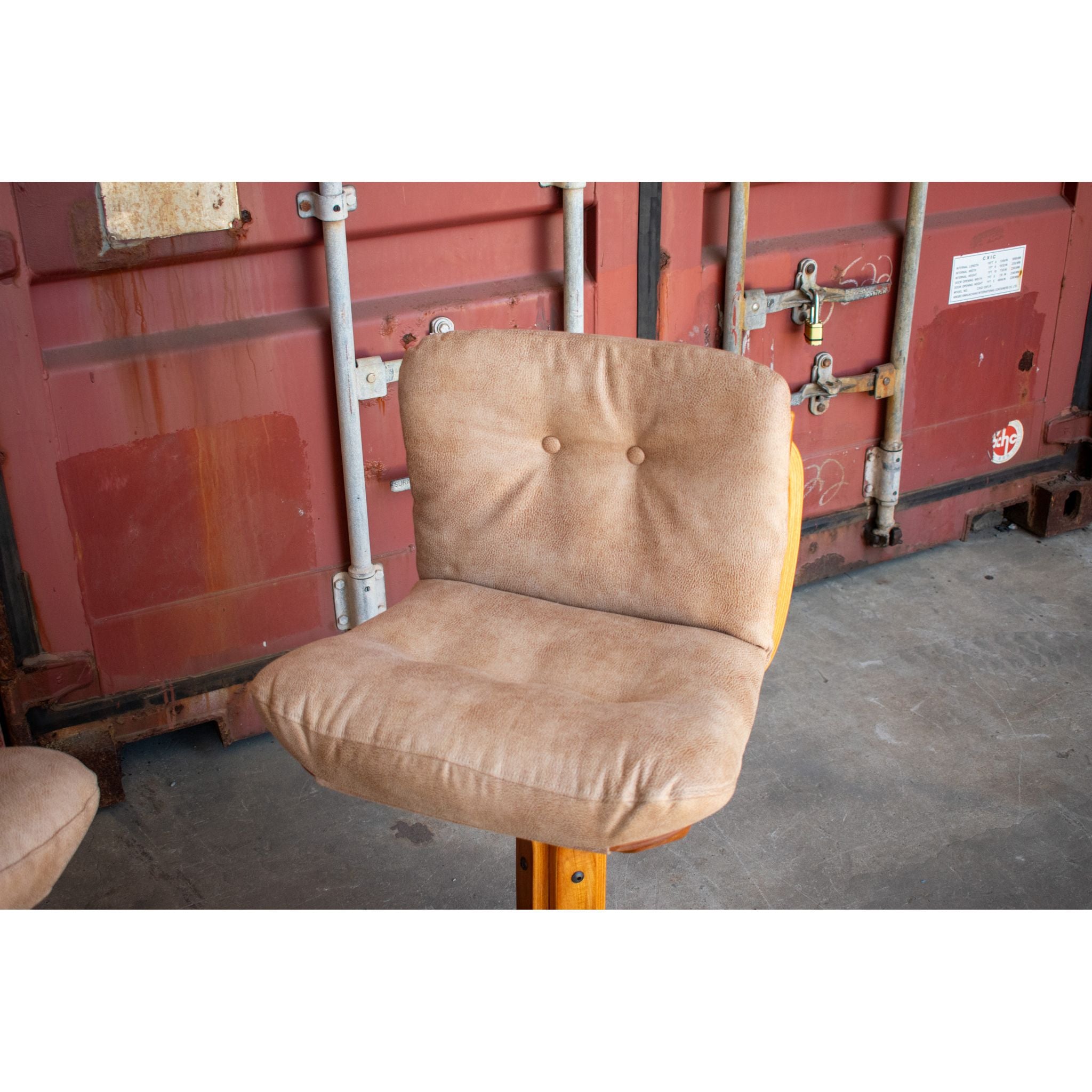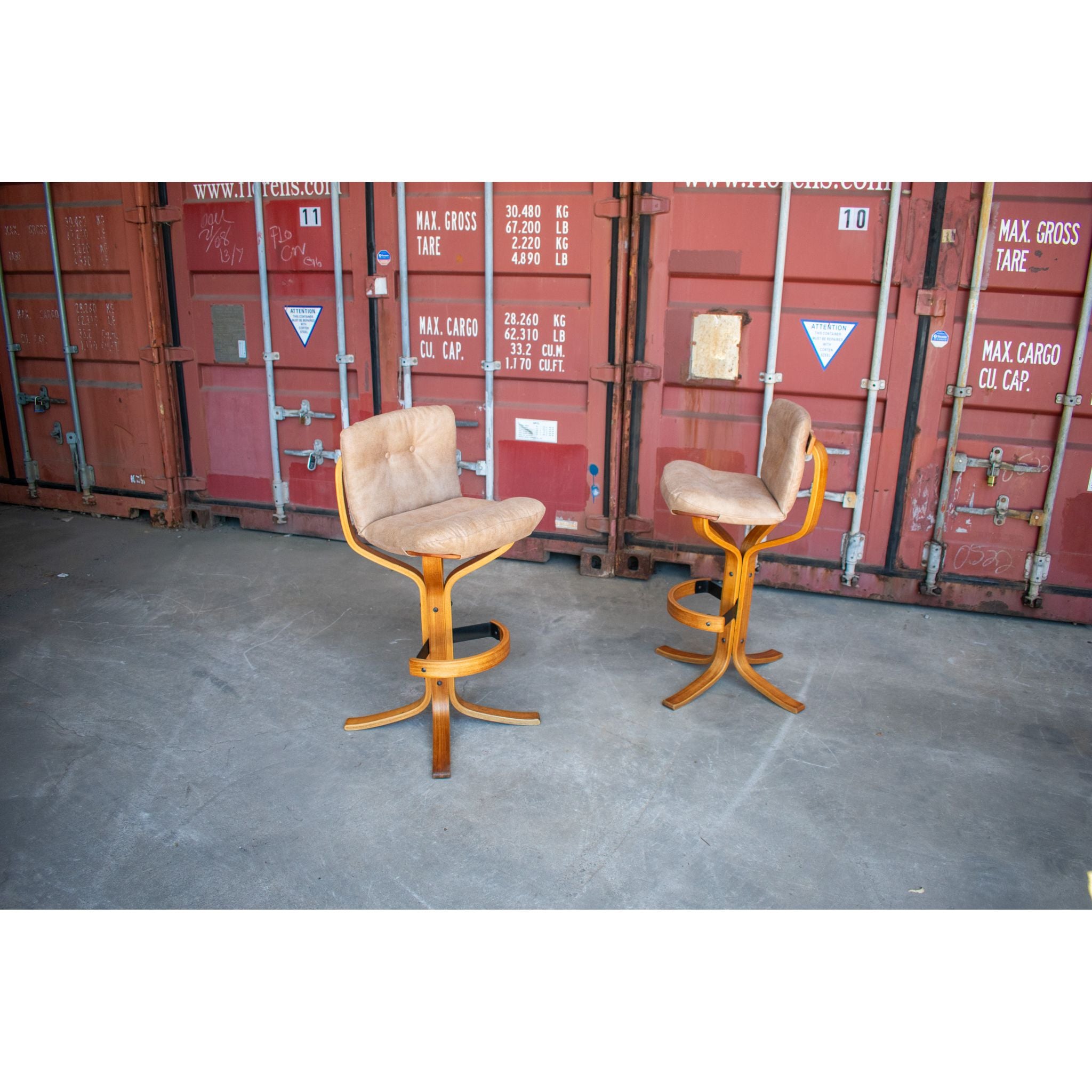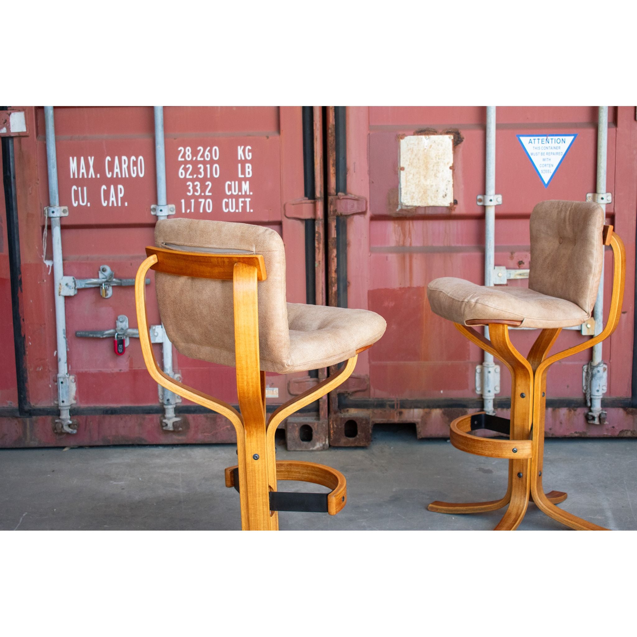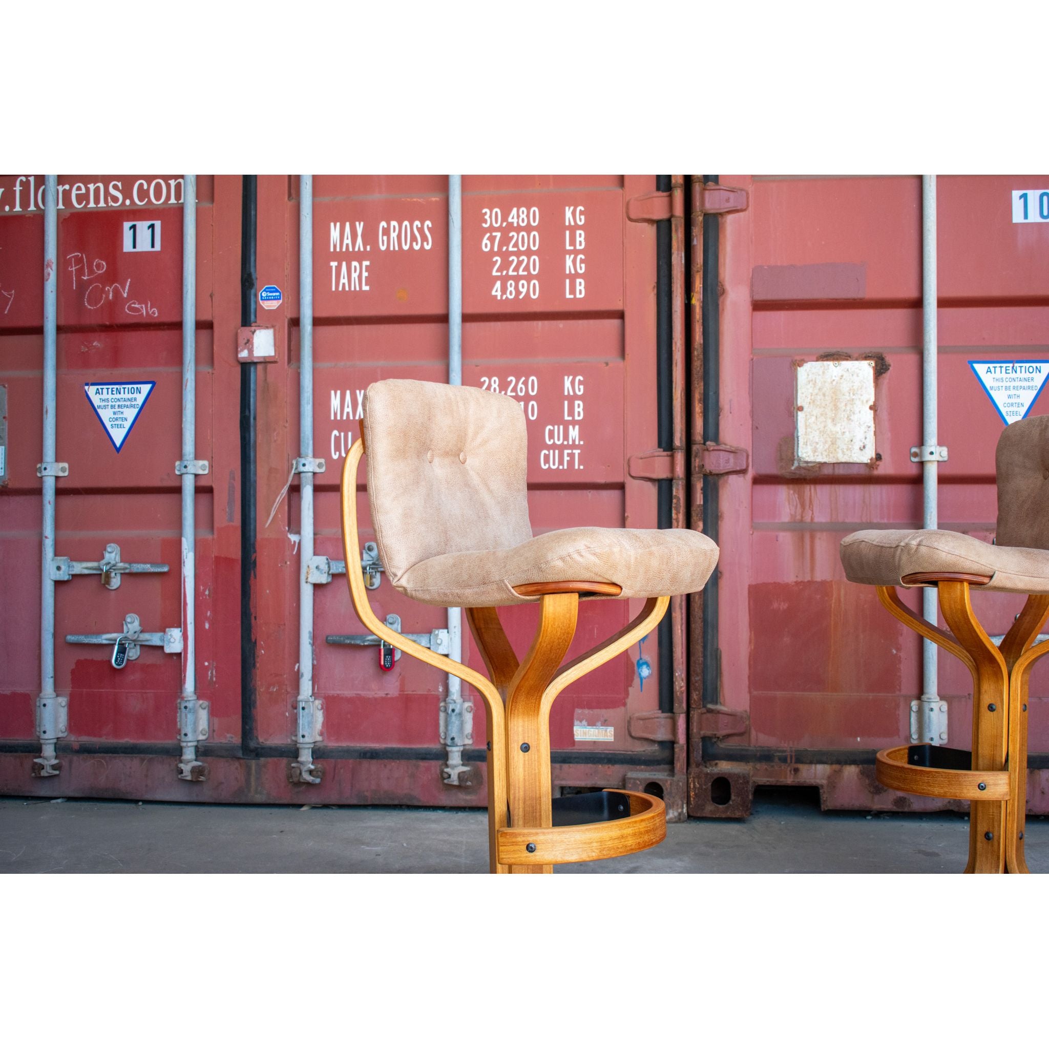 A rare matched pair of bar stools attributed to Joe Rufenacht, known for his sculptural timber forms and refined joinery. These stools have been fully restored in-house: frames stripped, sanded, and refinished with our durable oil blend to enhance grain depth and long-term resilience. Seats and backrests reupholstered in Warwick Eastwood Sand—a textured neutral that complements the timber beautifully.
