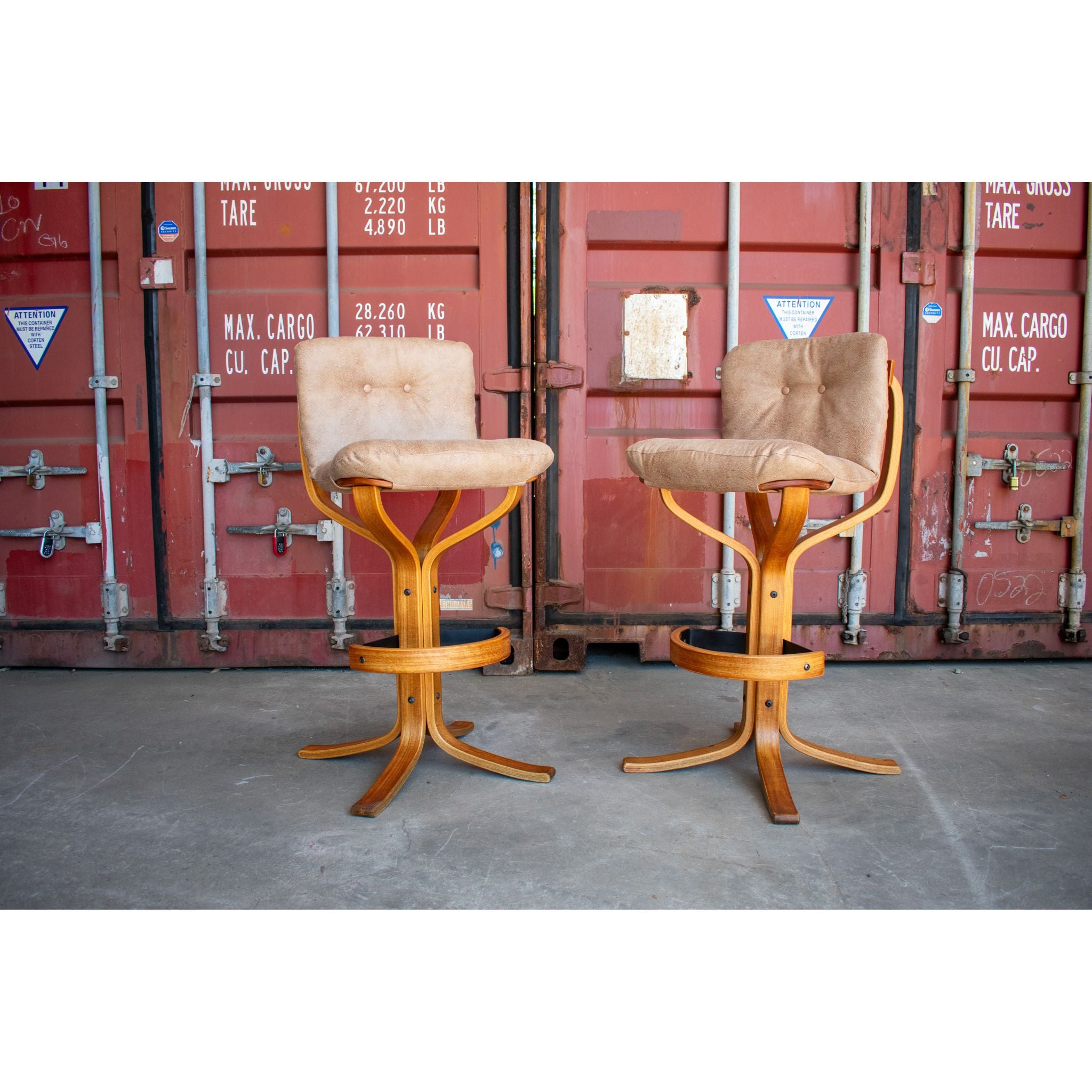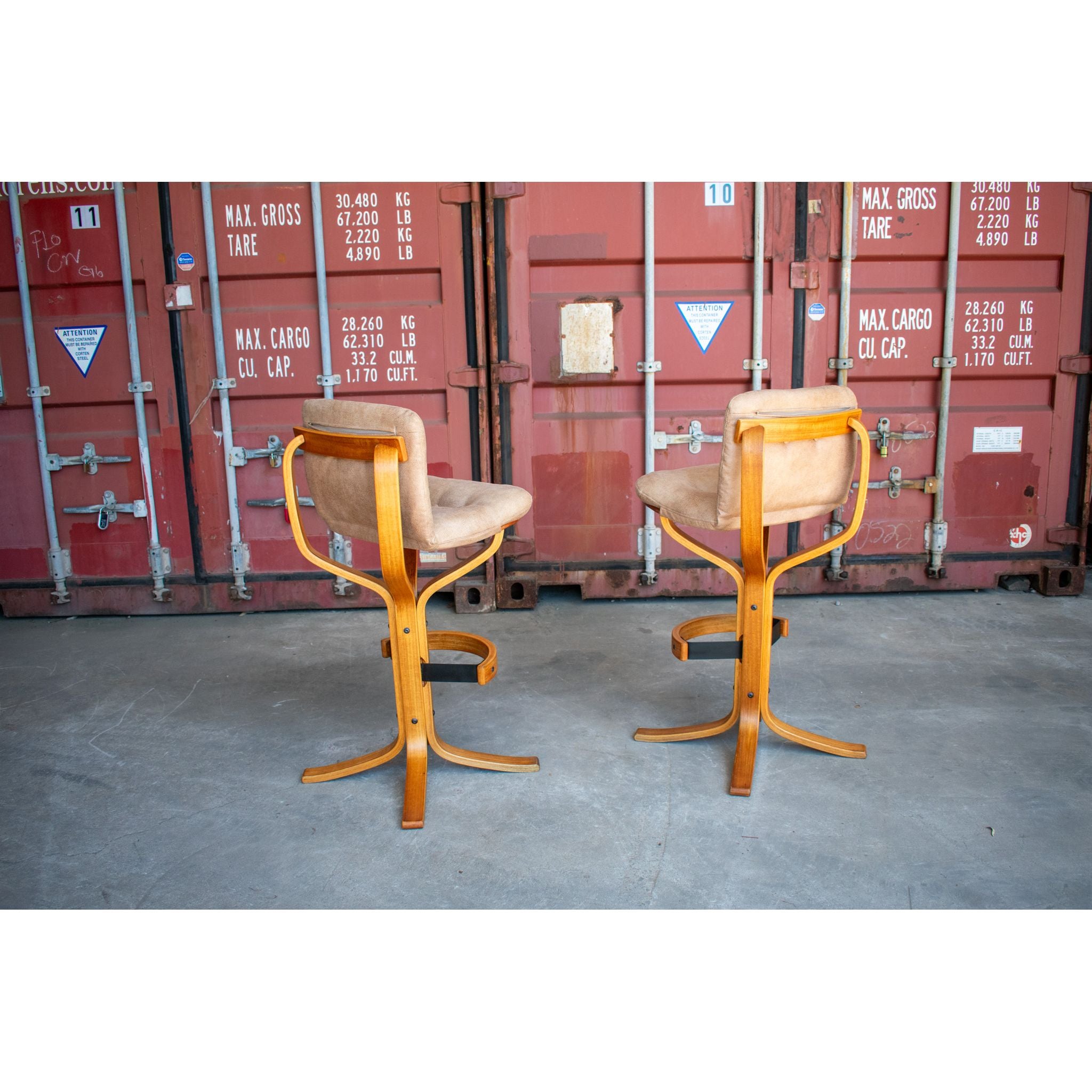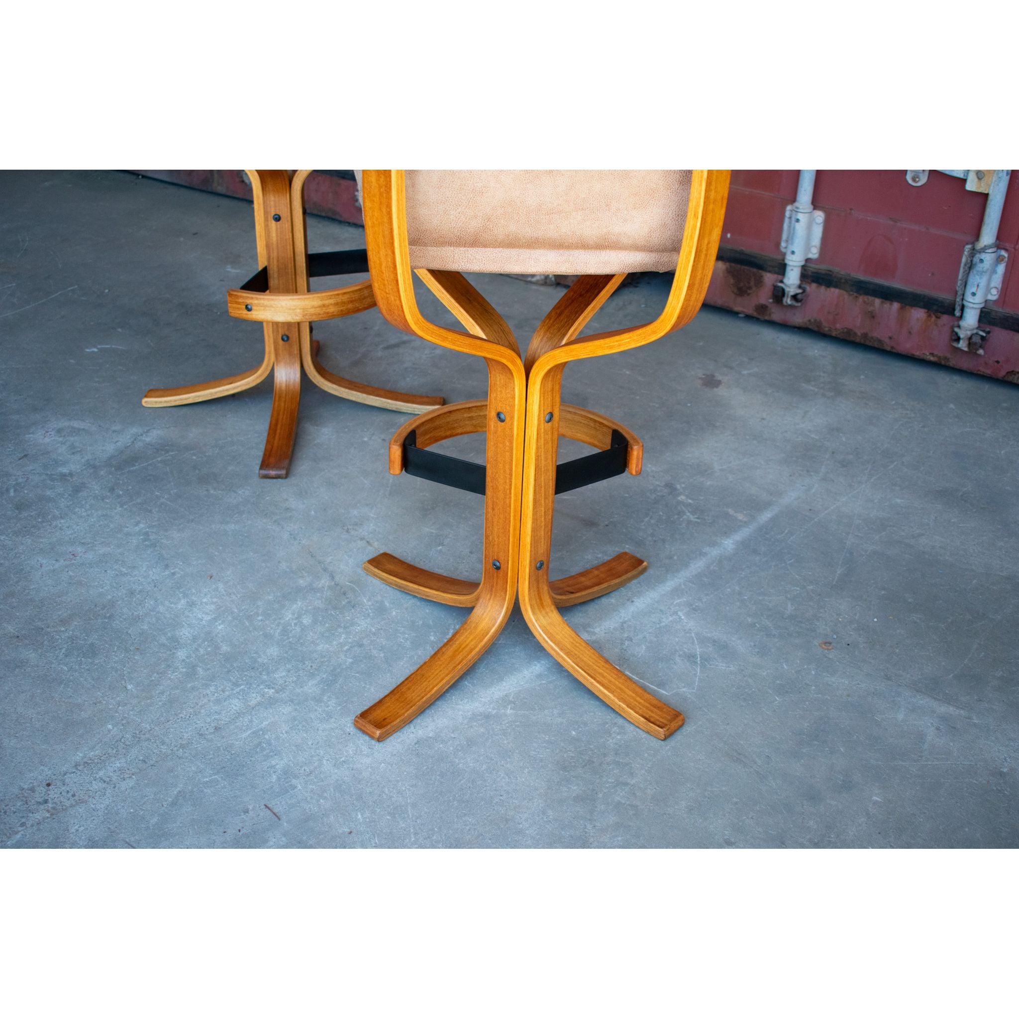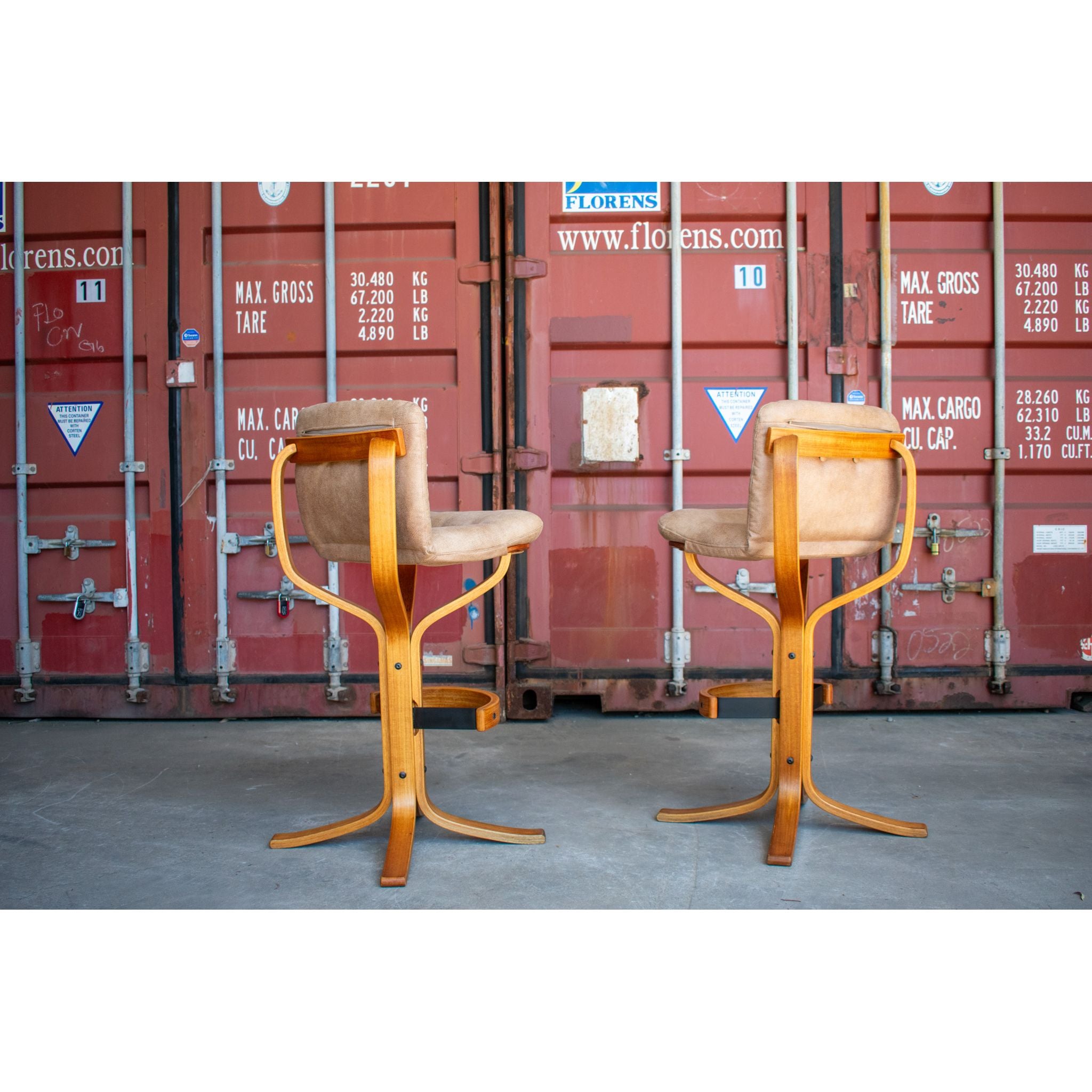 A rare matched pair of bar stools attributed to Joe Rufenacht, known for his sculptural timber forms and refined joinery. These stools have been fully restored in-house: frames stripped, sanded, and refinished with our durable oil blend to enhance grain depth and long-term resilience. Seats and backrests reupholstered in Warwick Eastwood Sand—a textured neutral that complements the timber beautifully.