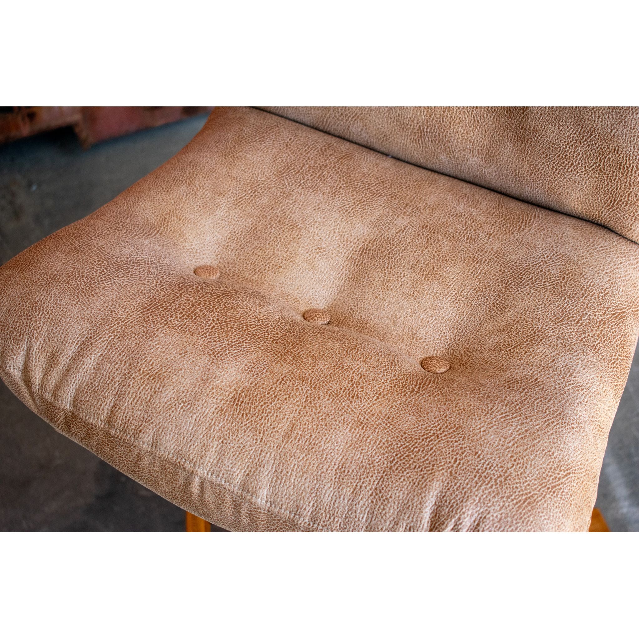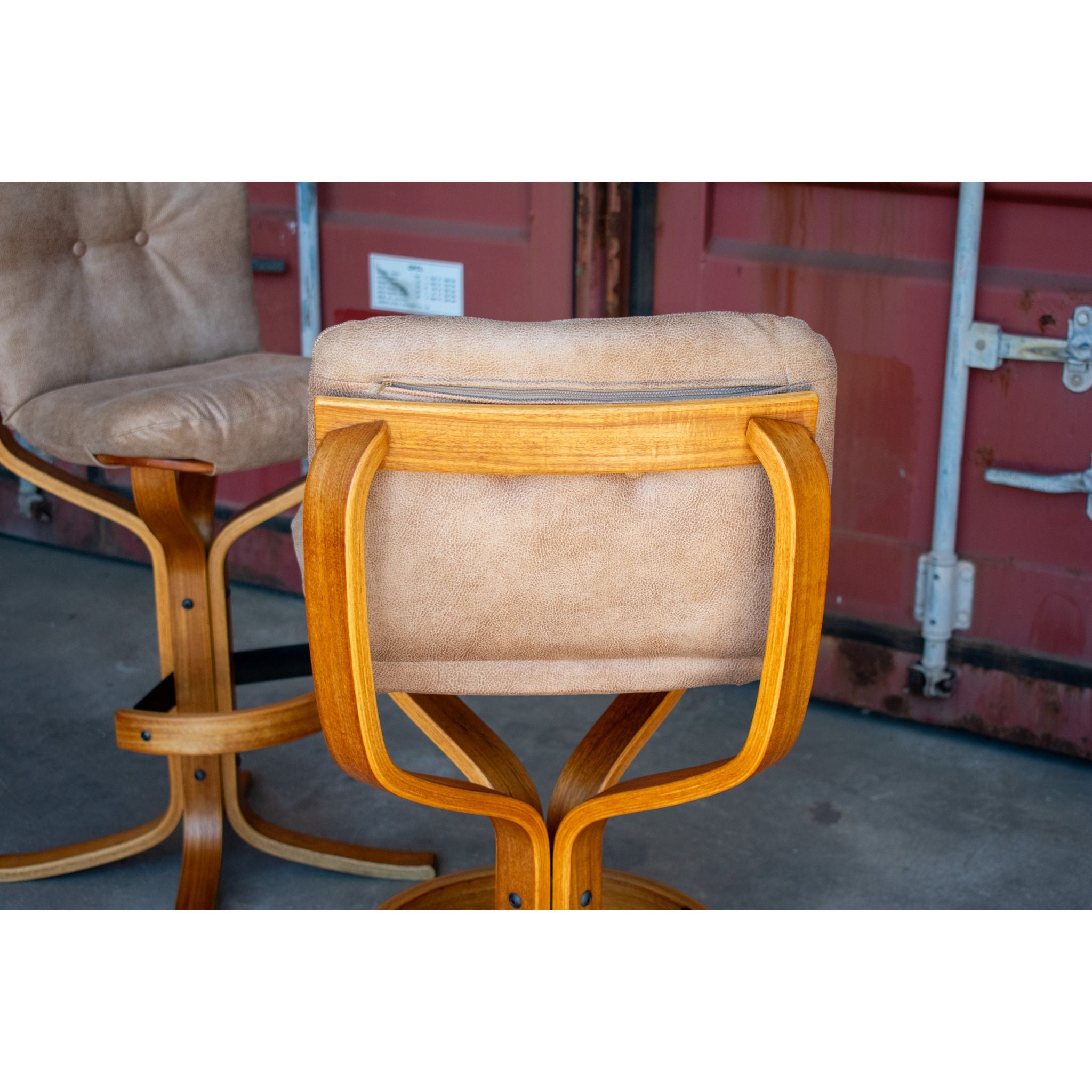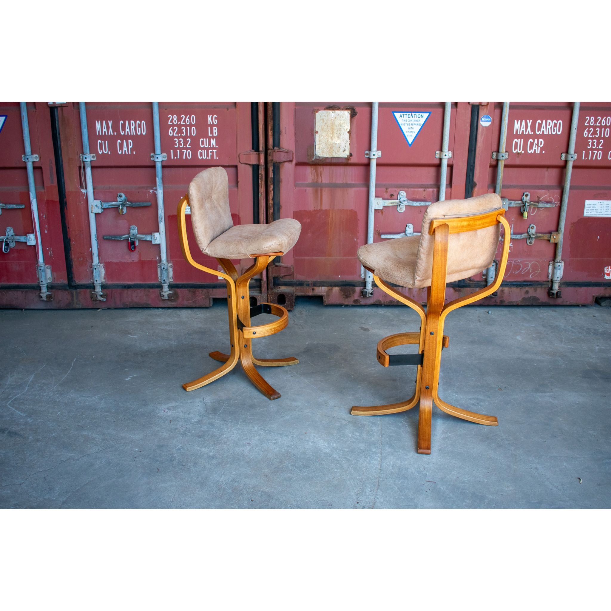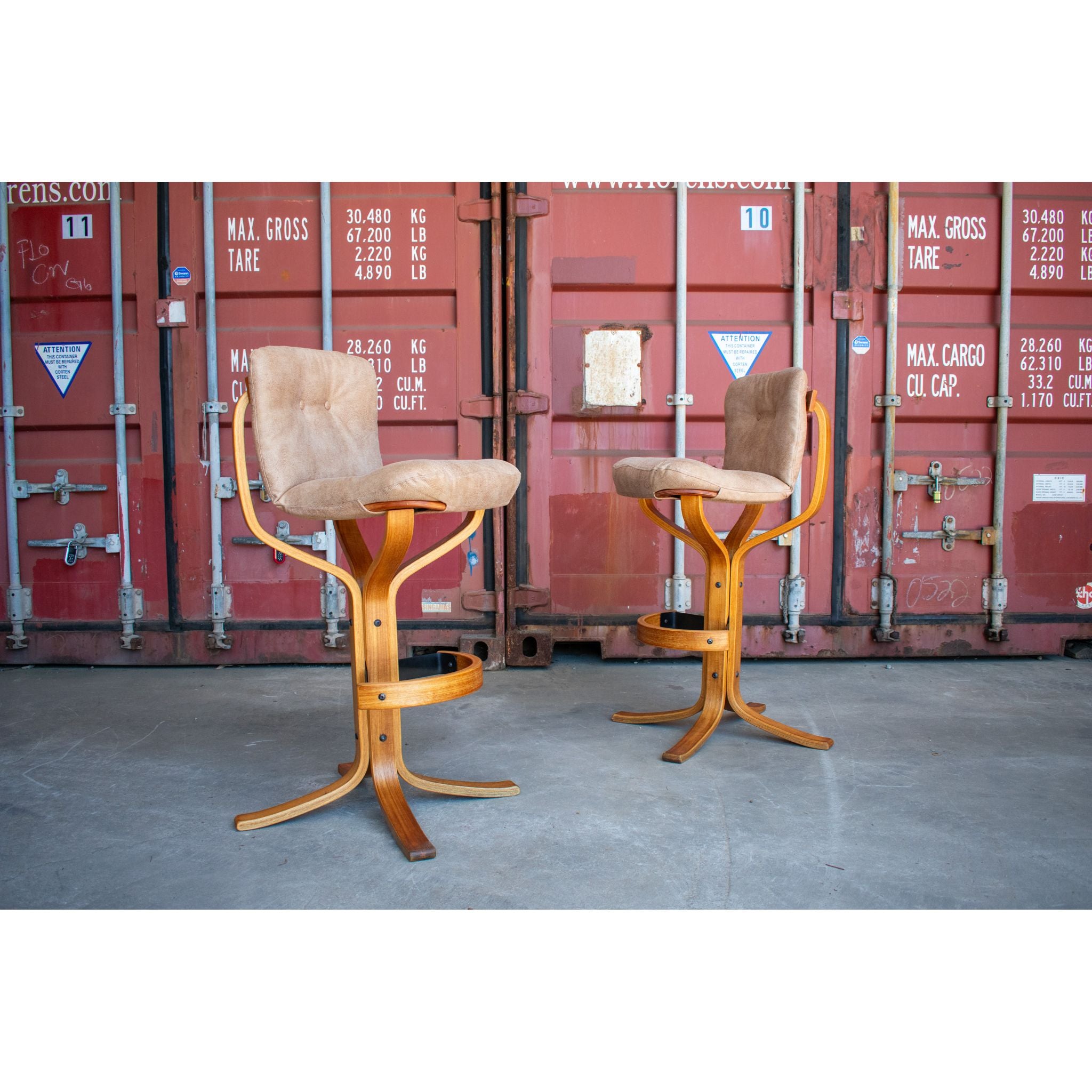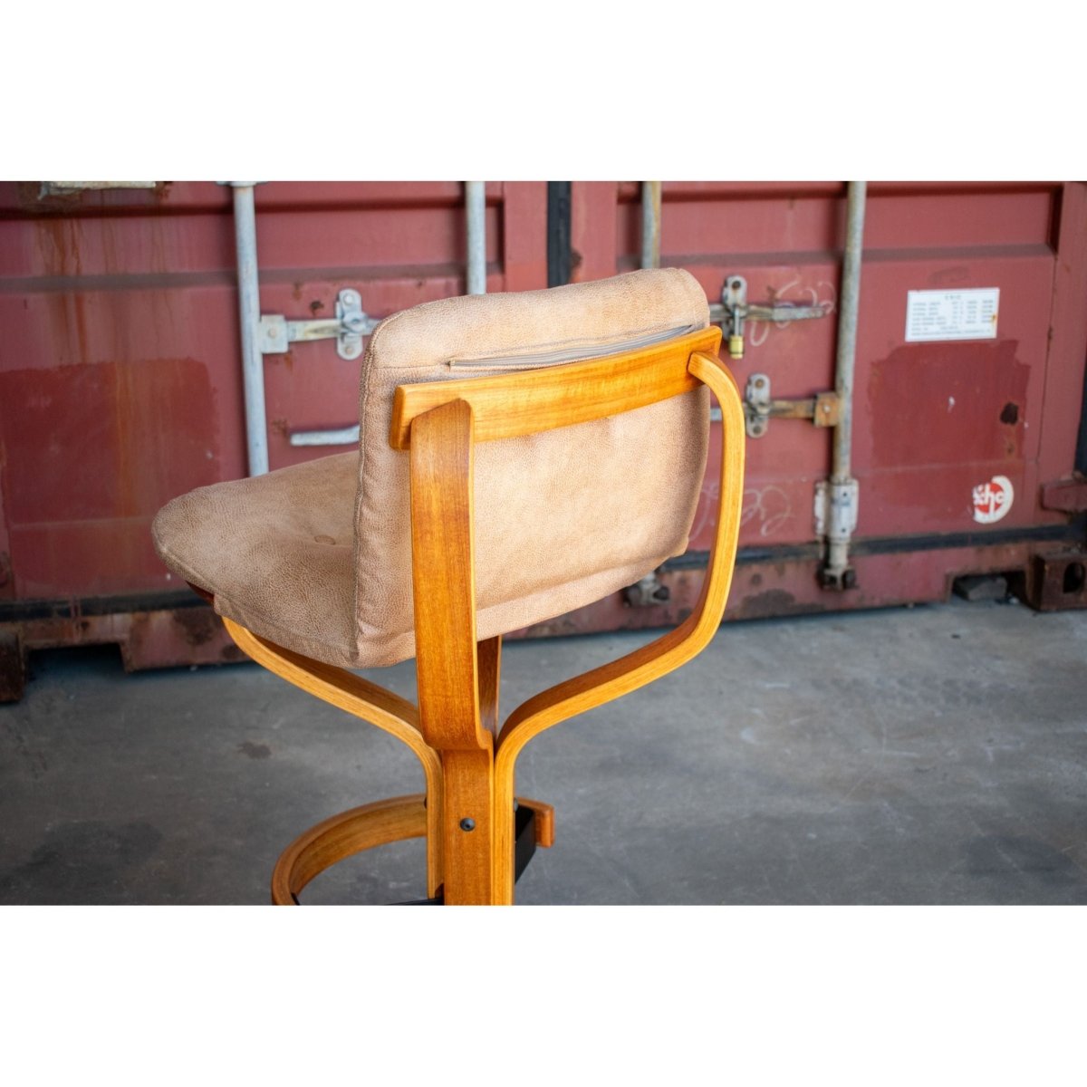 A rare matched pair of bar stools attributed to Joe Rufenacht, known for his sculptural timber forms and refined joinery. These stools have been fully restored in-house: frames stripped, sanded, and refinished with our durable oil blend to enhance grain depth and long-term resilience. Seats and backrests reupholstered in Warwick Eastwood Sand—a textured neutral that complements the timber beautifully.