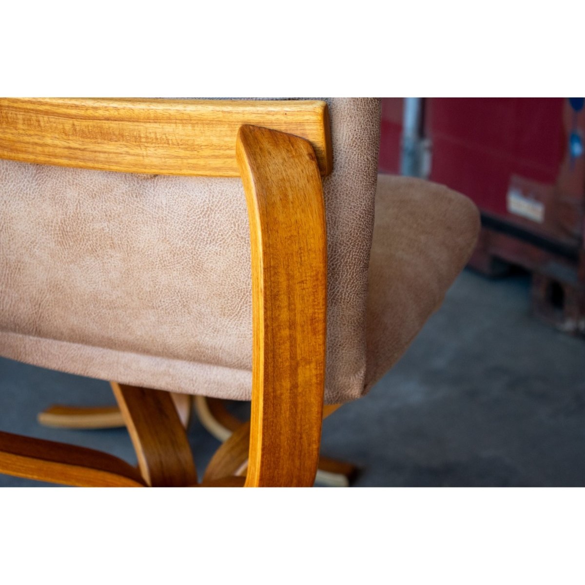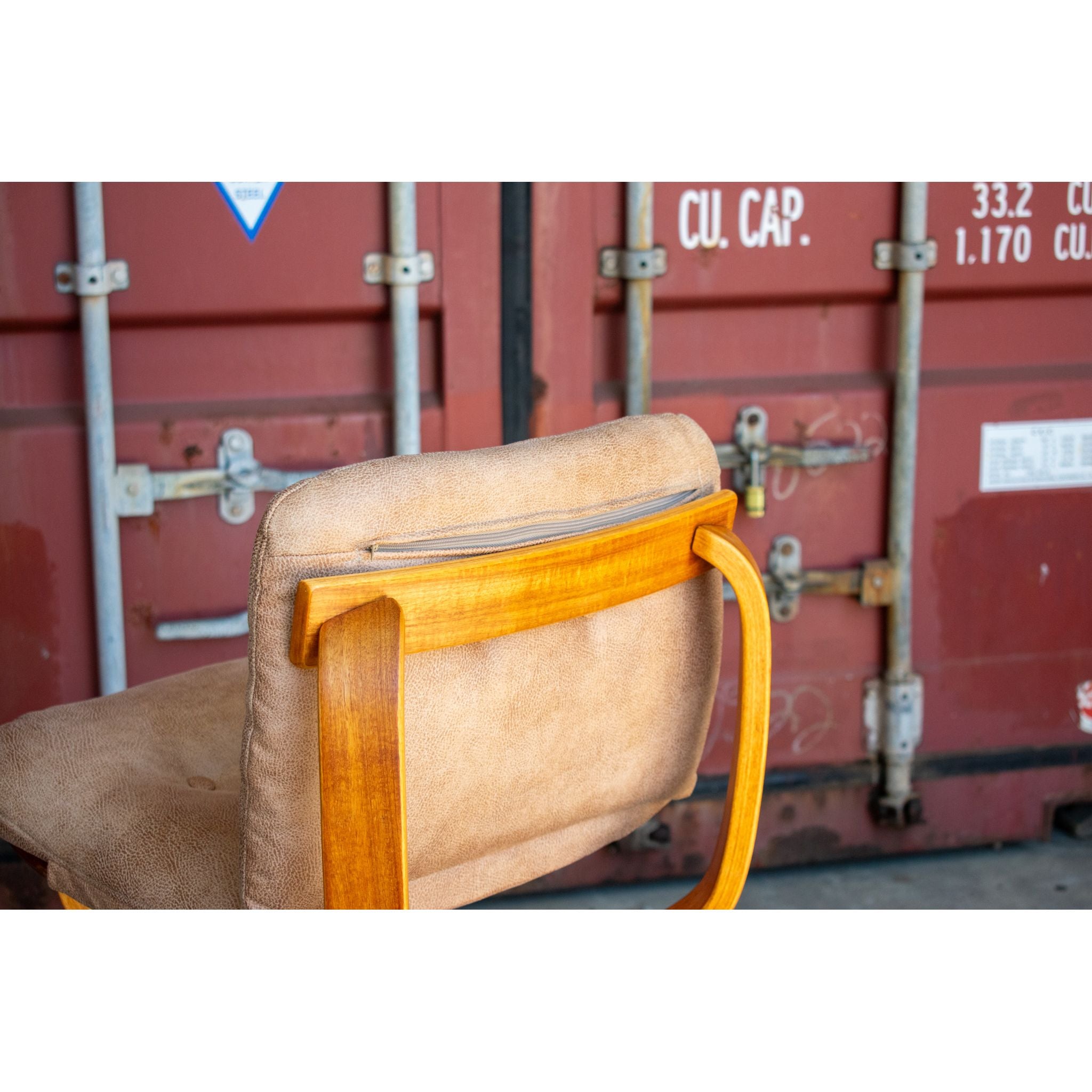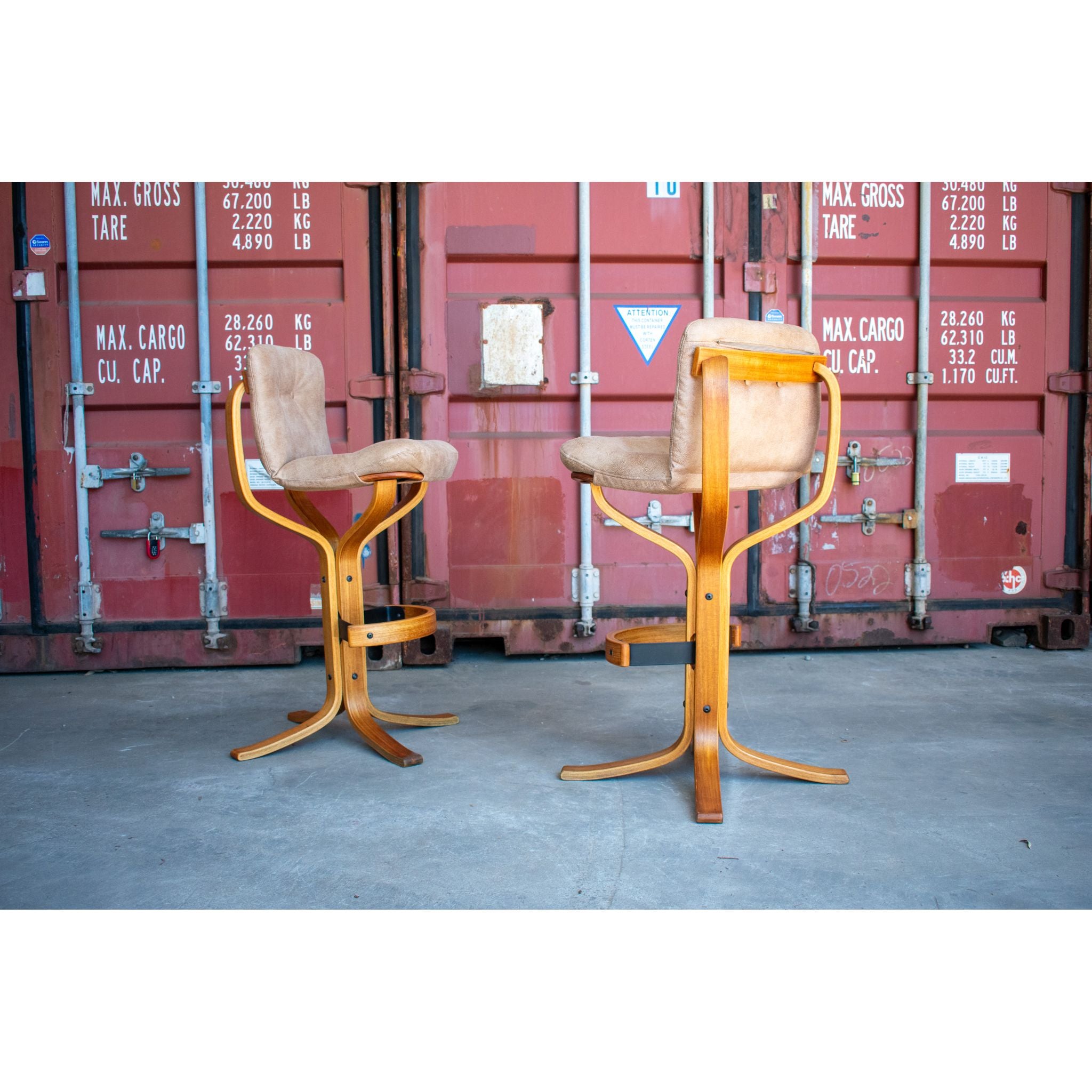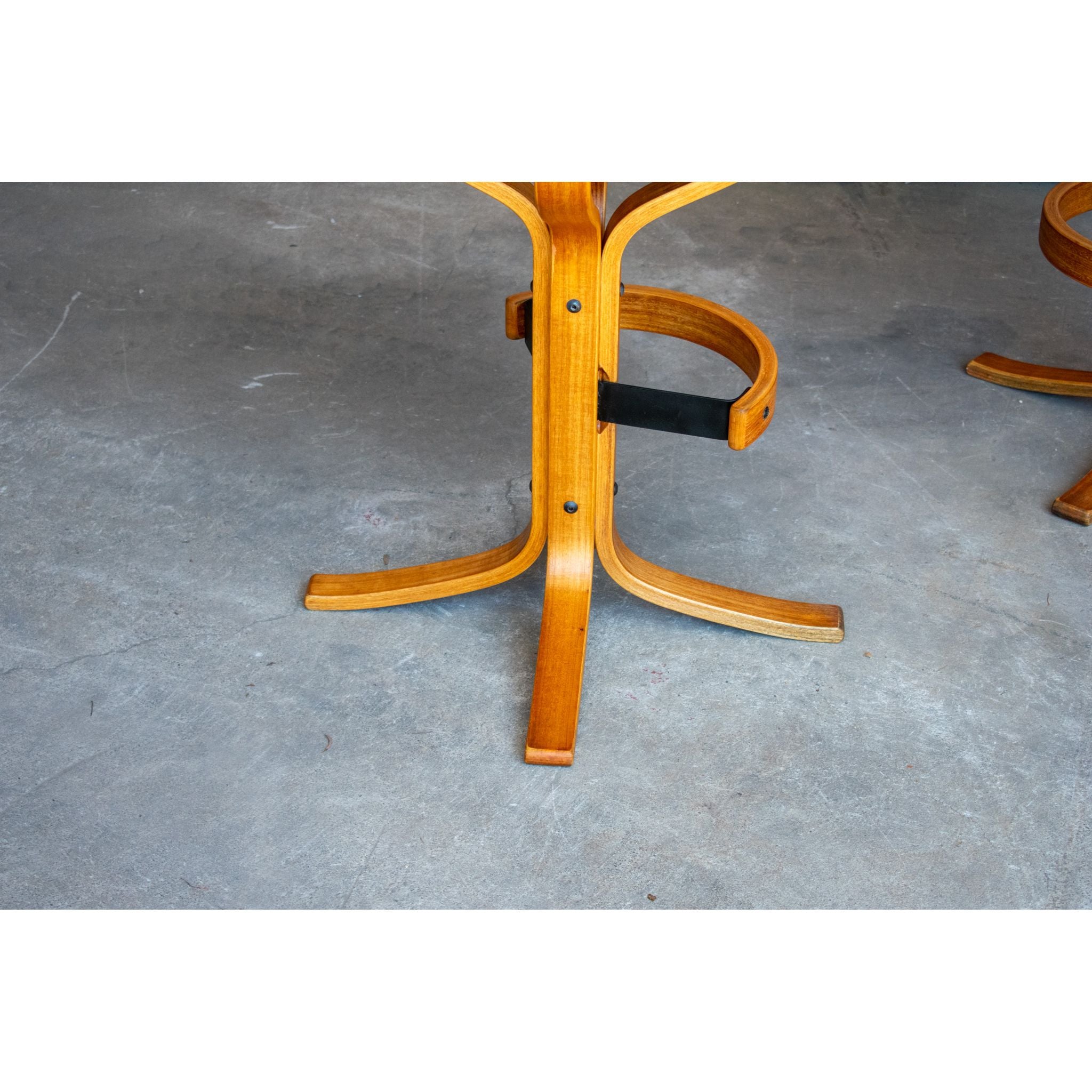 A rare matched pair of bar stools attributed to Joe Rufenacht, known for his sculptural timber forms and refined joinery. These stools have been fully restored in-house: frames stripped, sanded, and refinished with our durable oil blend to enhance grain depth and long-term resilience. Seats and backrests reupholstered in Warwick Eastwood Sand—a textured neutral that complements the timber beautifully.