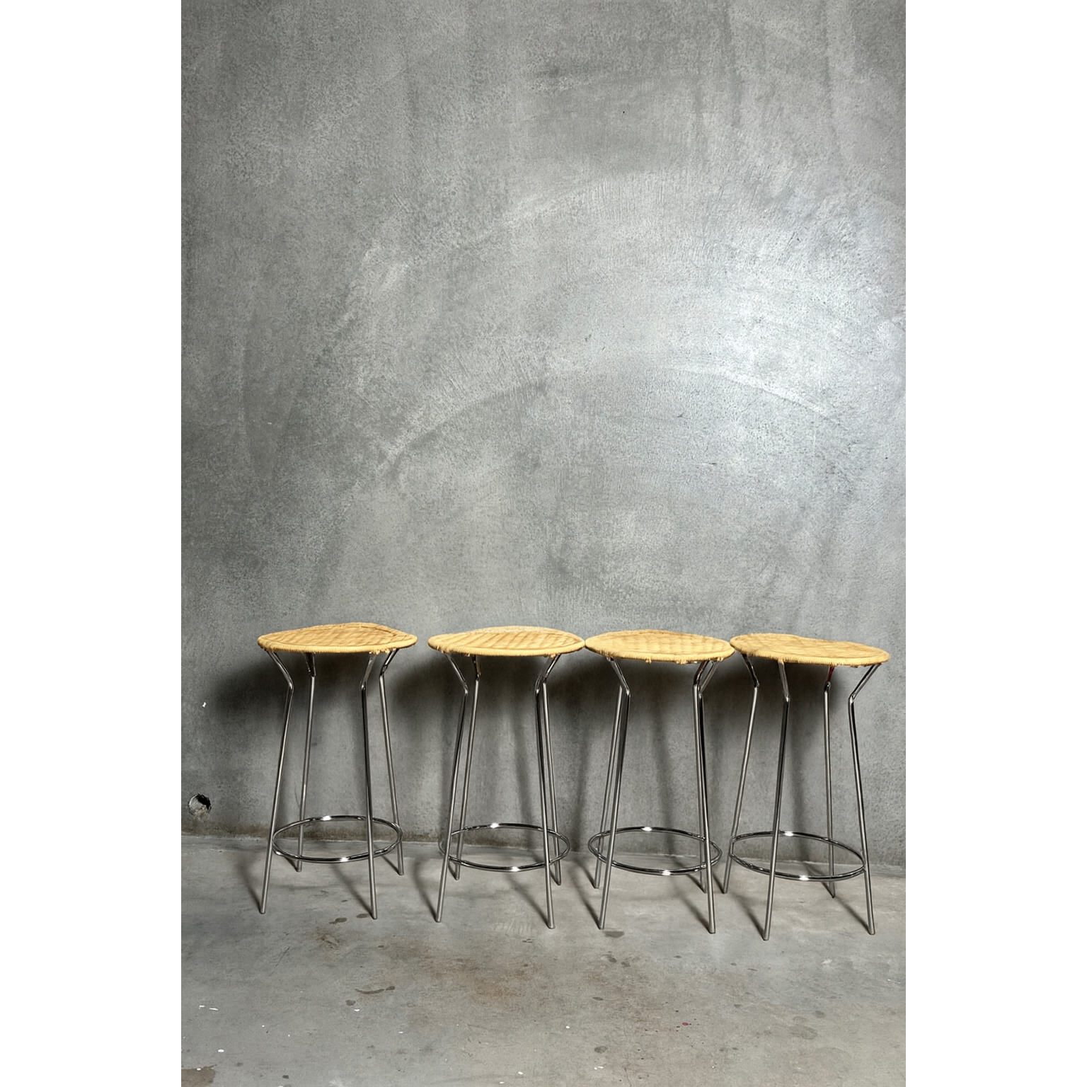 A balanced set by Italian designer Luciano Marson for Casamania. Each stool pairs a sleek chrome-plated steel frame with a handwoven seat crafted from natural uncoated pith. Woven by skilled Italian artisans with beautiful subtle variation in tone and texture.