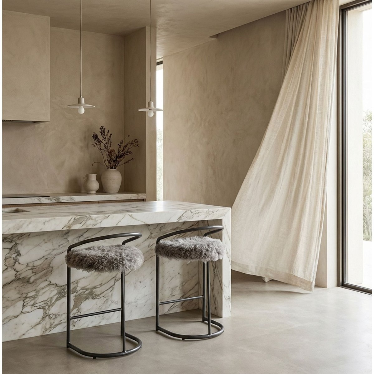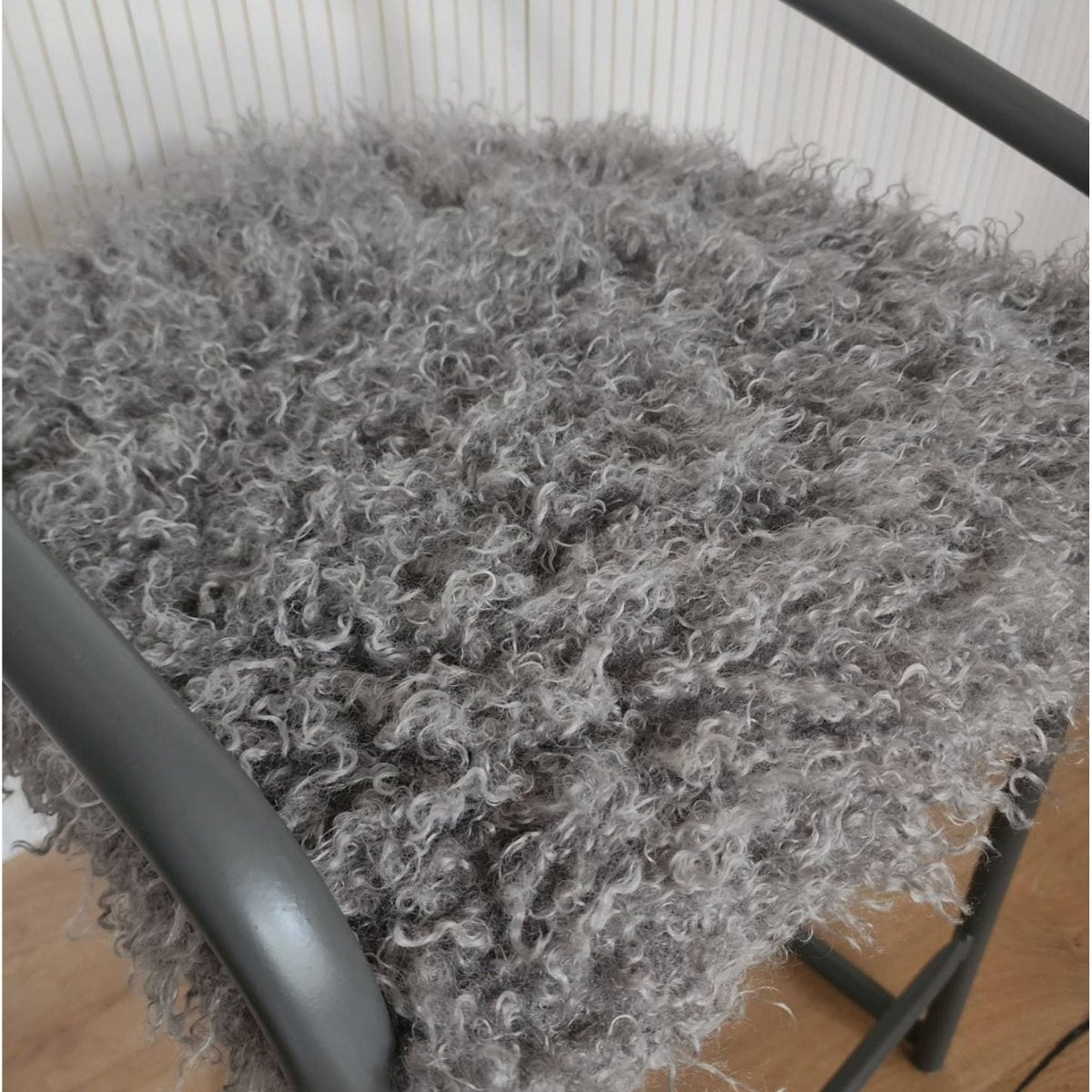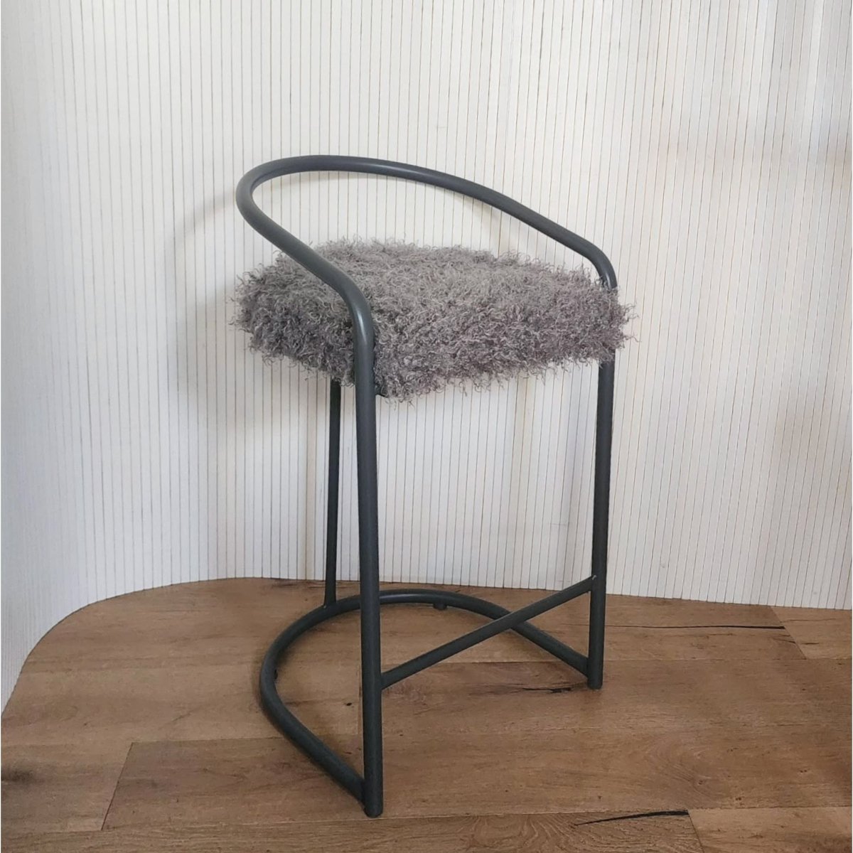 Upcycled bar stools finished in satin dark grey, topped with plush Mongolian fur seats. A unique piece inspired by a special customer request.