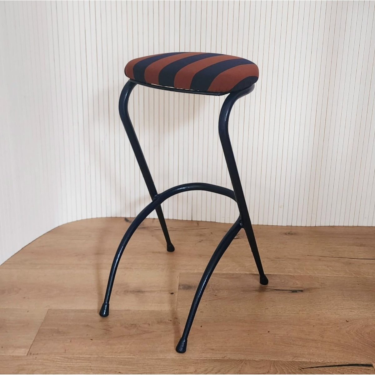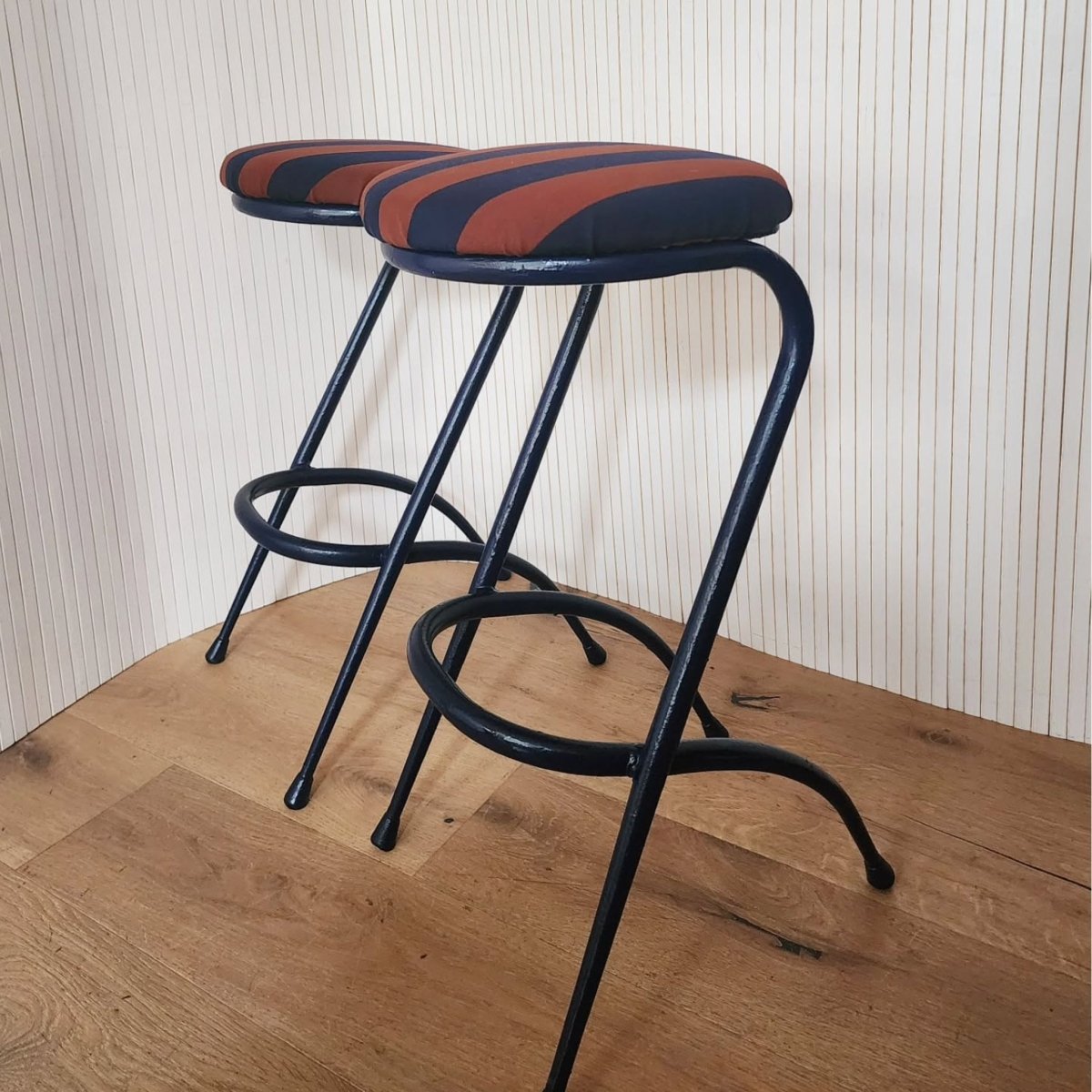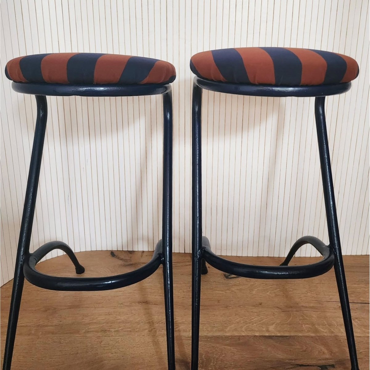 Vintage-style bar stools with a navy metal frame and a striped navy-and-terracotta newly re upholstered seats. Some unevenness in the frames, but still presents well. One is slightly higher than the other.