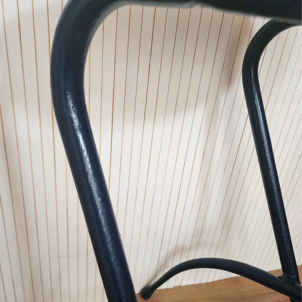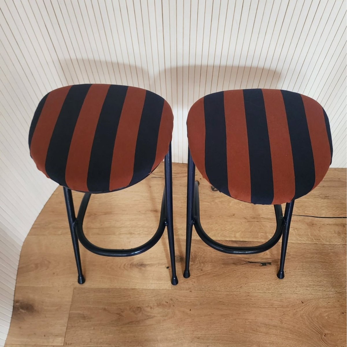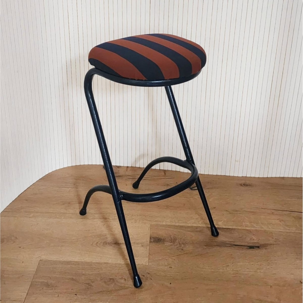 Vintage-style bar stools with a navy metal frame and a striped navy-and-terracotta newly re upholstered seats. Some unevenness in the frames, but still presents well. One is slightly higher than the other.