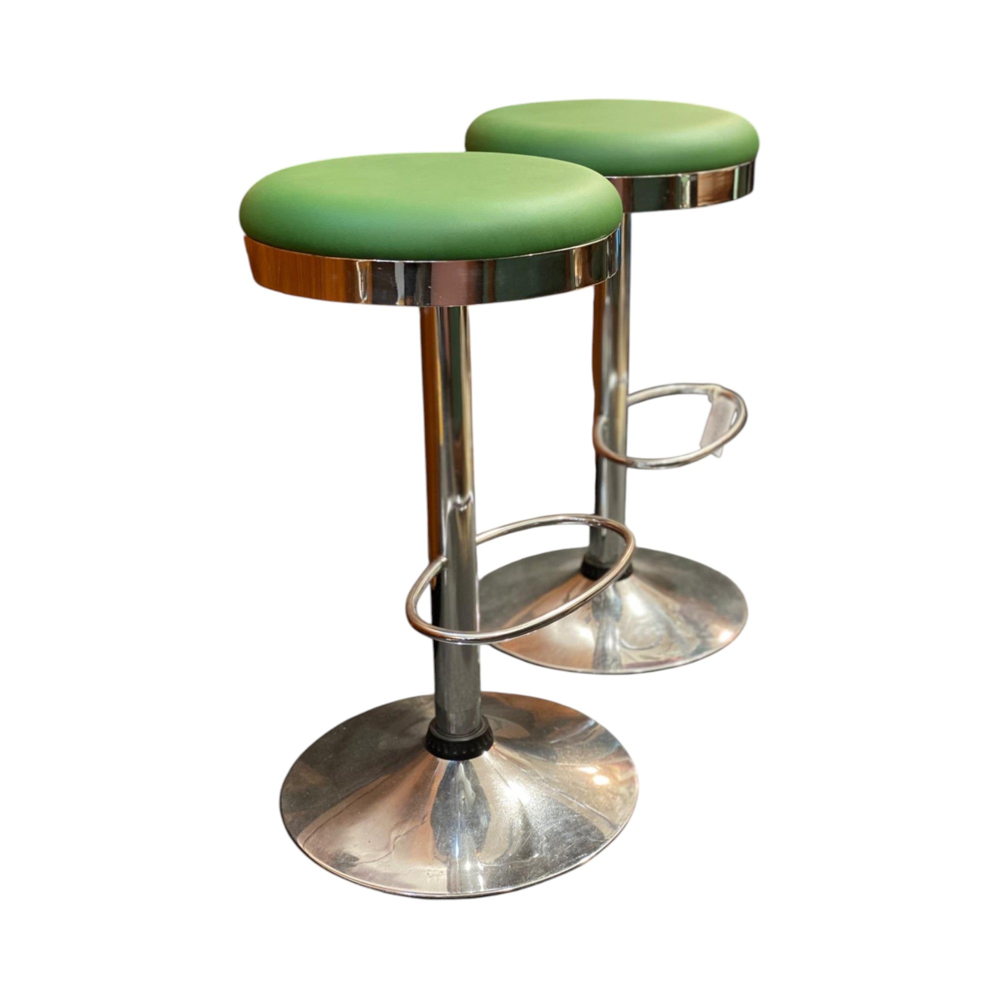 A seriously cute pair of retro swivel stools, bringing just the right hit of vintage charm with a playful twist. Freshly upholstered in a bold Kermit-green vinyl, the seat pads pop beautifully against their classic chrome form, giving them a fun yet timeless edge with the sturdy base of a disk form.