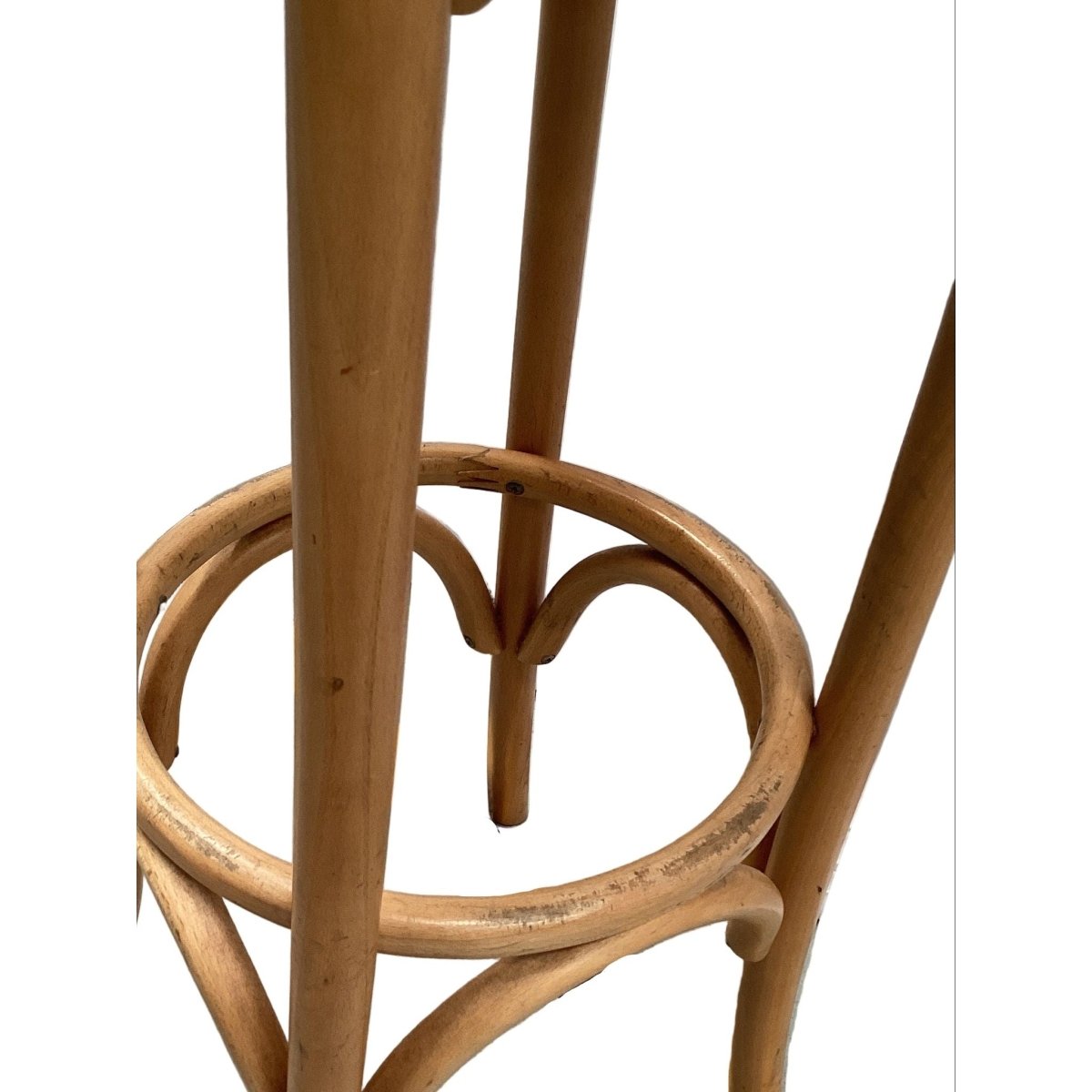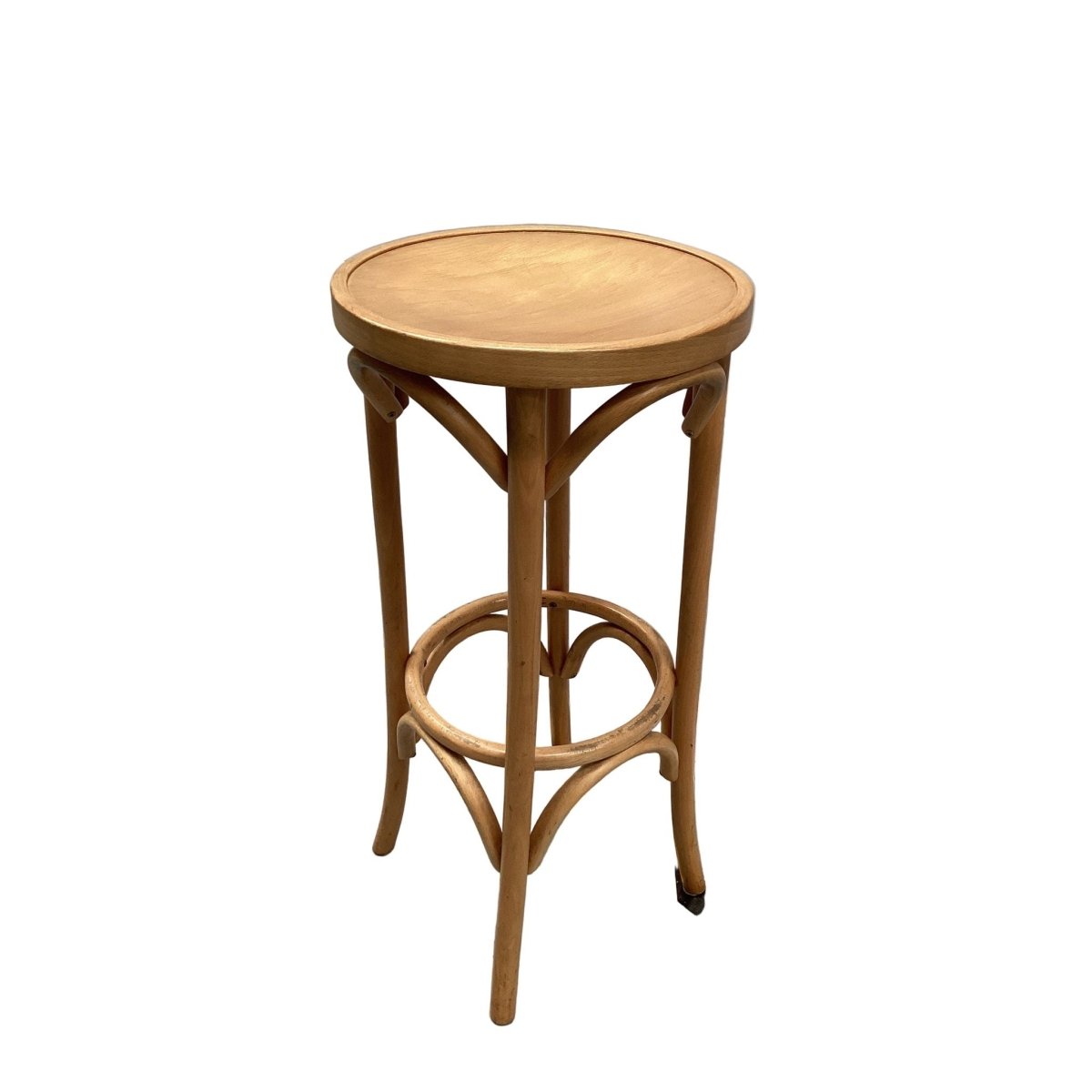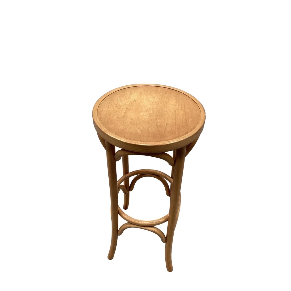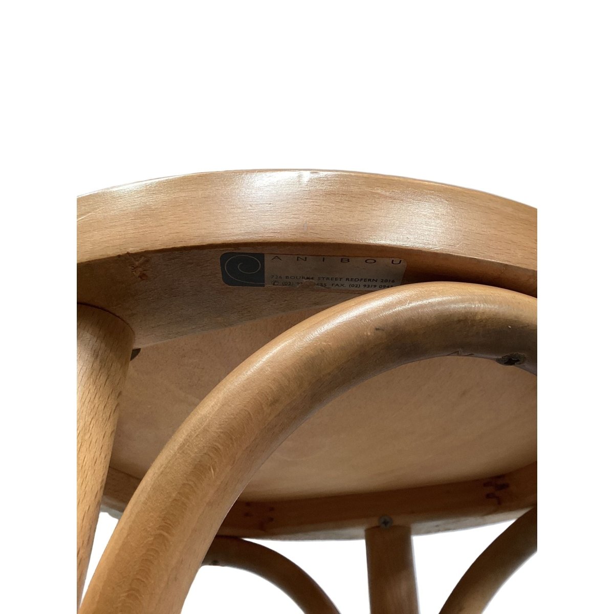 This iconic bentwood barstool draws inspiration from Thonet's legendary design heritage, featuring the characteristic curved beech frame that defined early modernist furniture. The robust construction combines traditional steam-bending techniques with timeless proportions, creating a piece equally suited to contemporary kitchens or period interiors. The natural wood finish showcases the material's warmth while the compact footprint maximises seating efficiency. A functional classic that bridges vintage authenticity with enduring style. Anibou sticker on base. General vintage wear.