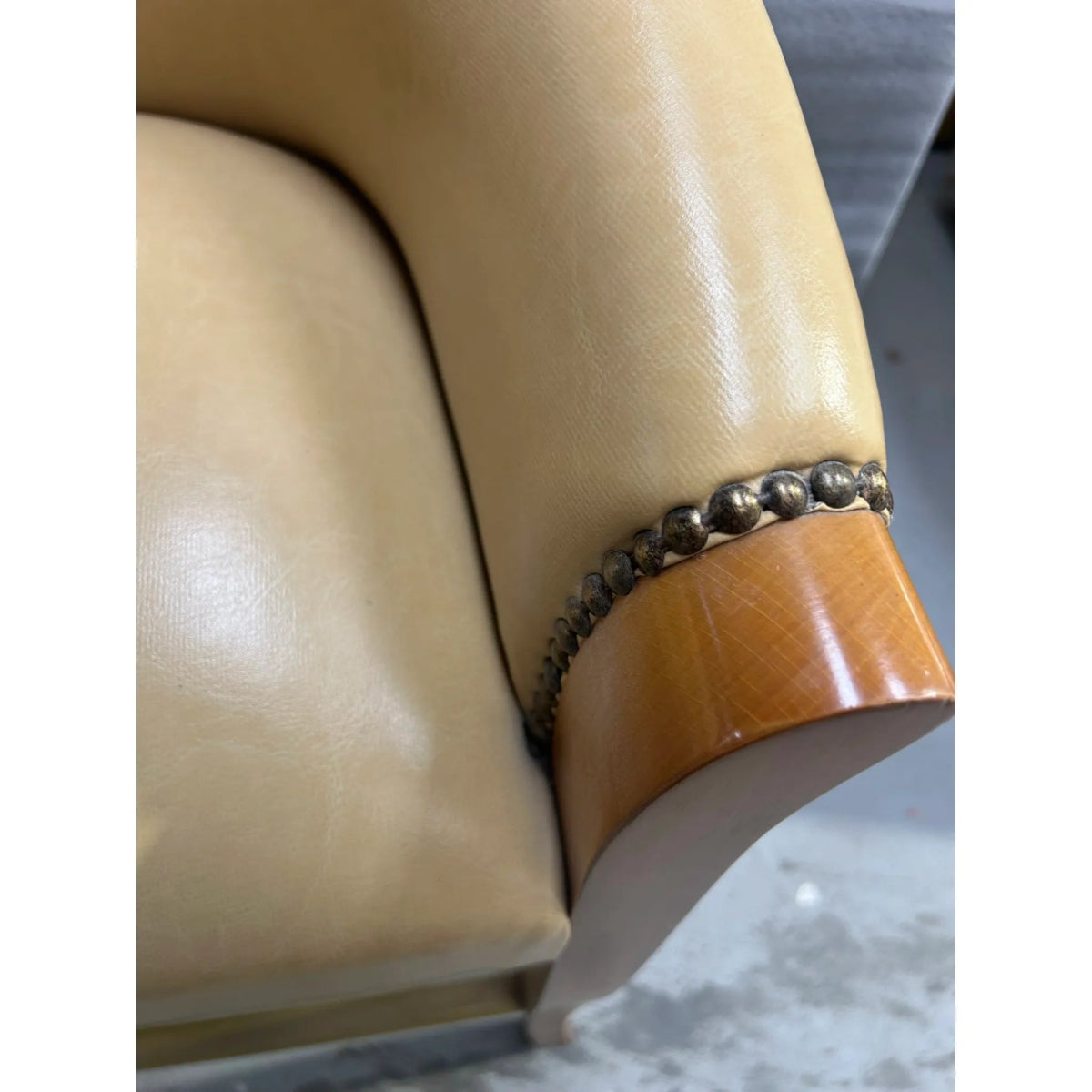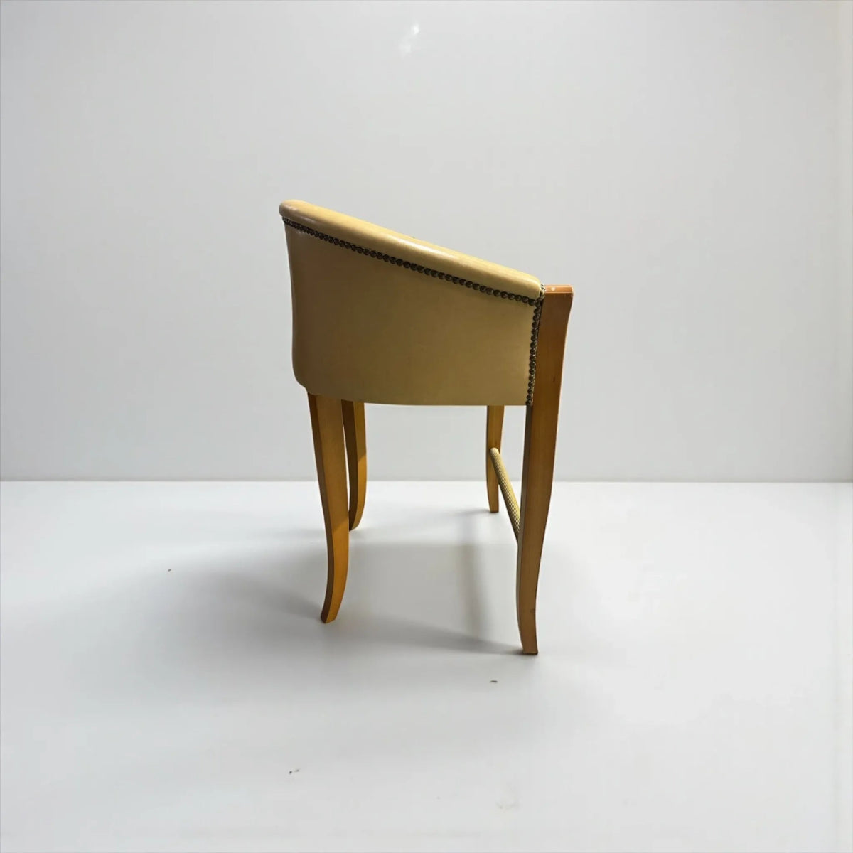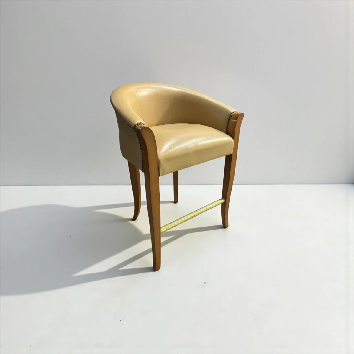 This vintage bar stool brings a warm nostalgic character with its soft yellow vinyl upholstery and polished timber frame. The curved backrest, highlighted with brass stud detailing, offers a classic touch, while the gold textured foot rail adds a subtle hint of glamour.