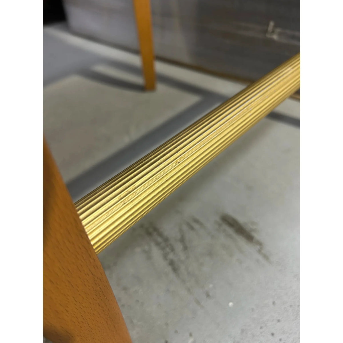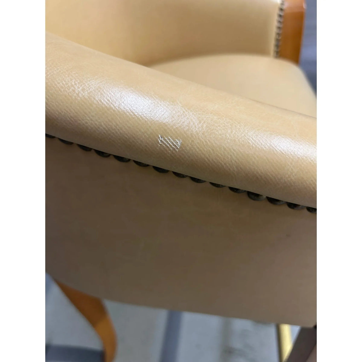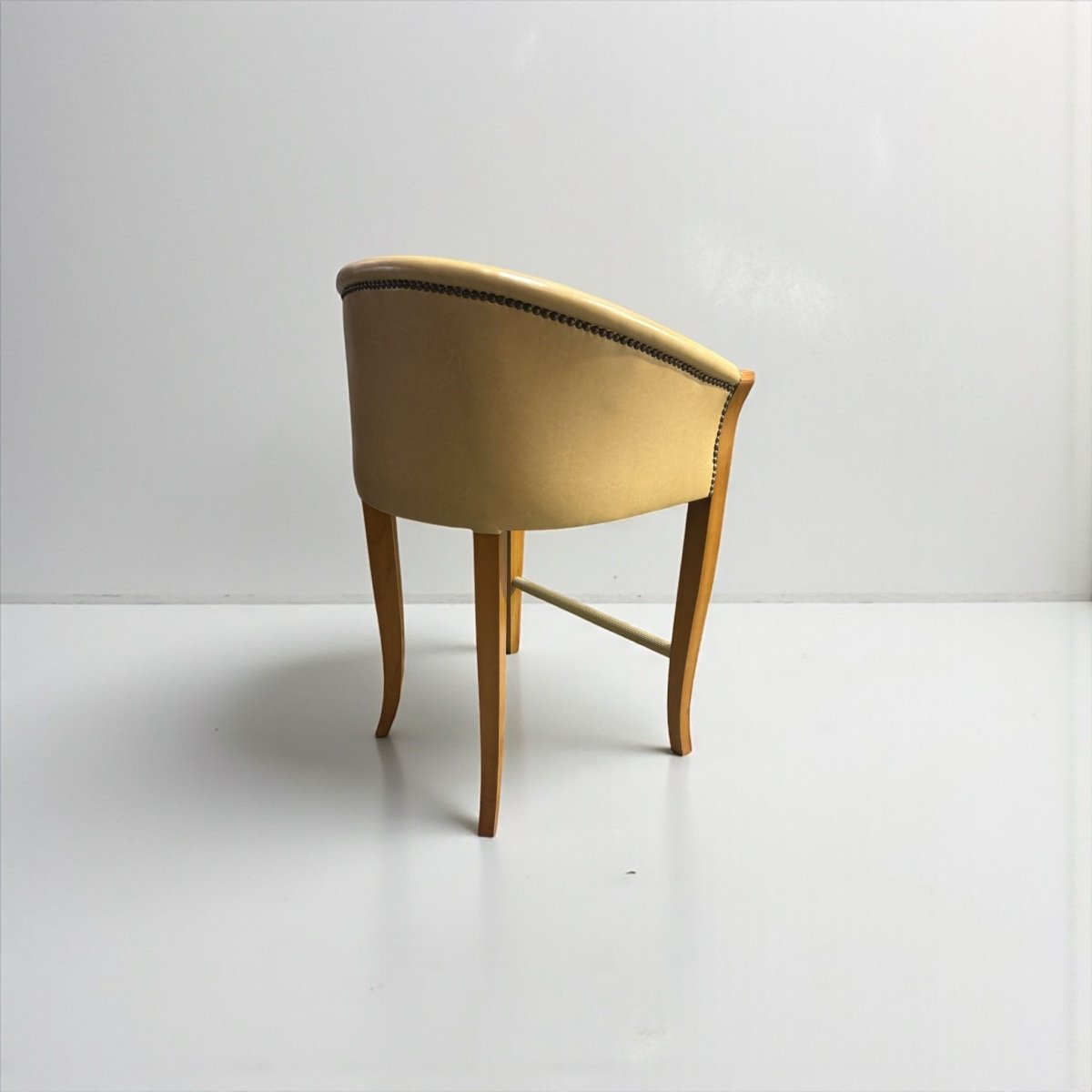 This vintage bar stool brings a warm nostalgic character with its soft yellow vinyl upholstery and polished timber frame. The curved backrest, highlighted with brass stud detailing, offers a classic touch, while the gold textured foot rail adds a subtle hint of glamour.