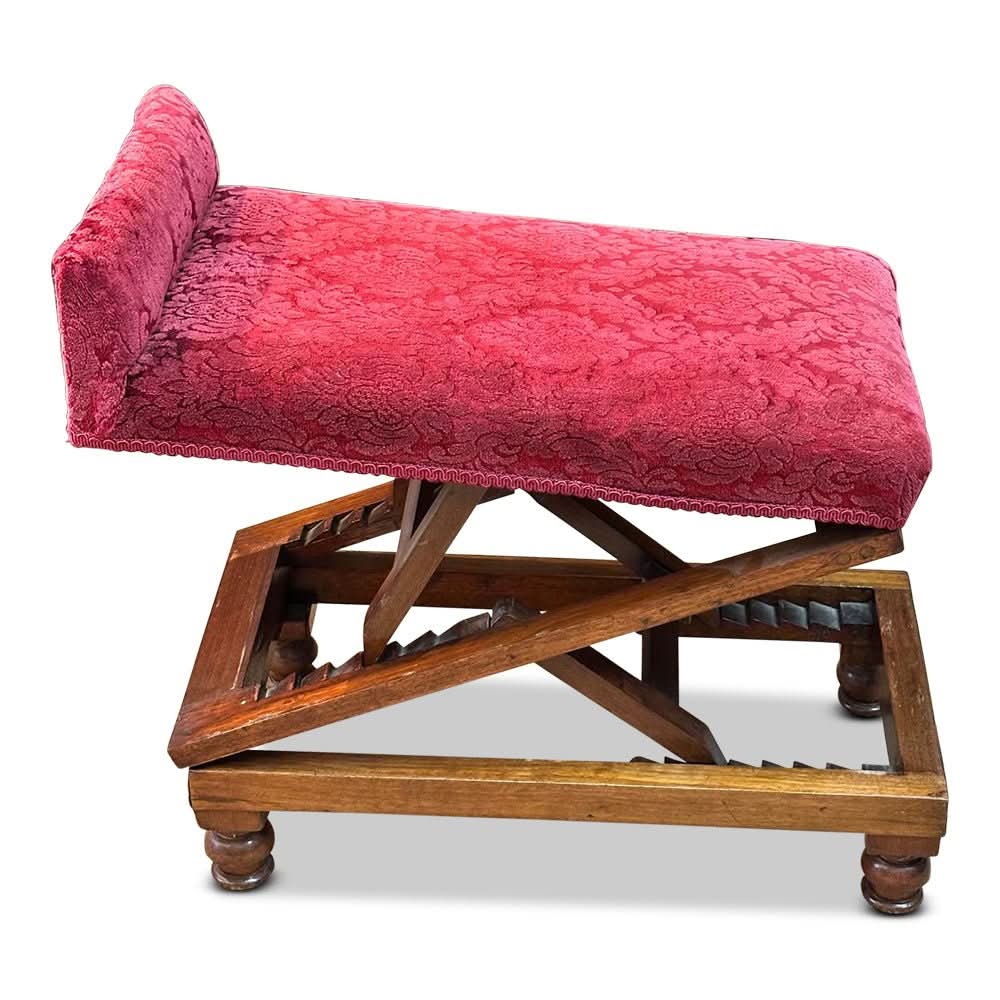 It features an adjustable design whereby the footrest can be tilted or flat at varying heights, depending on your requirements. Frame is mahogany and it has lovely turned feet.