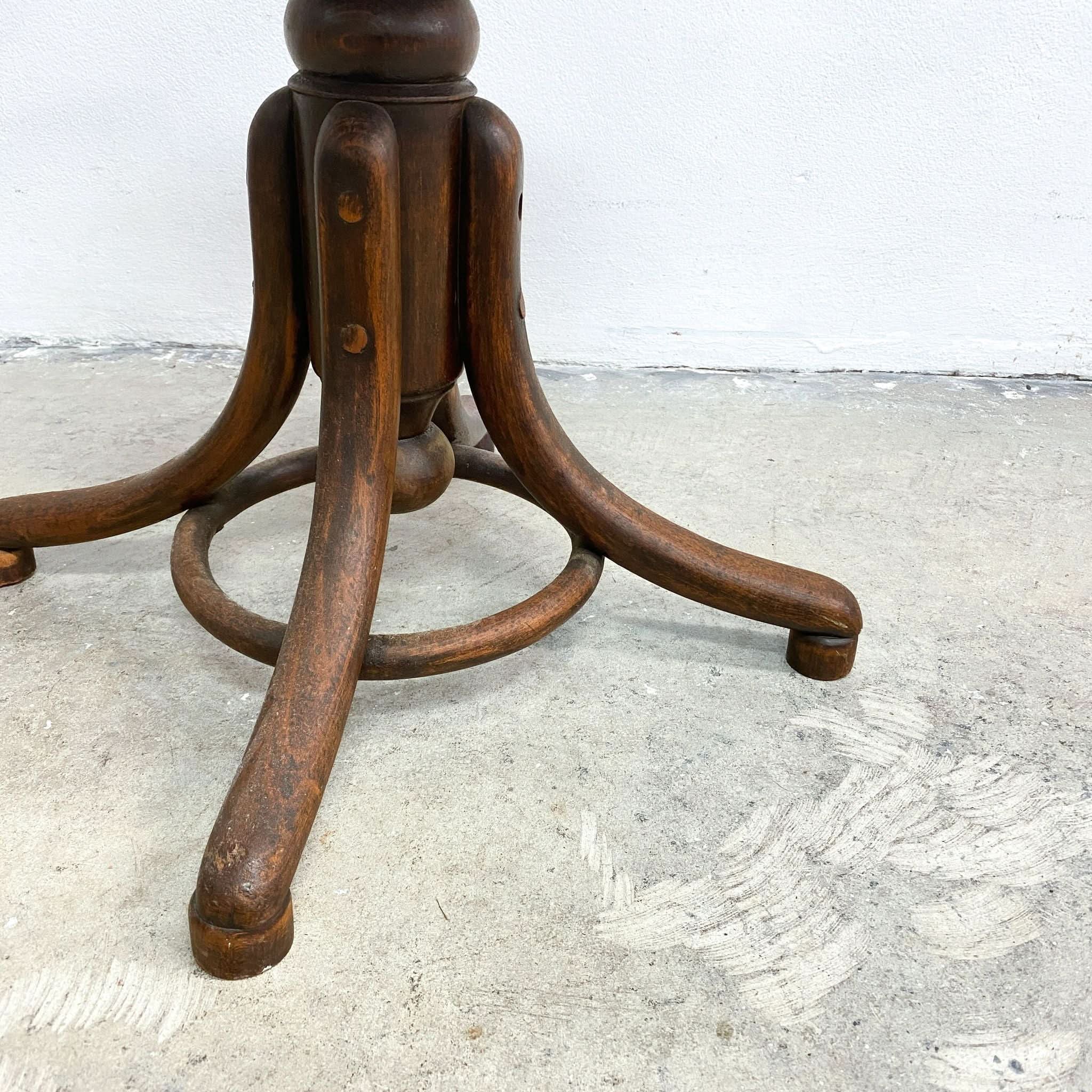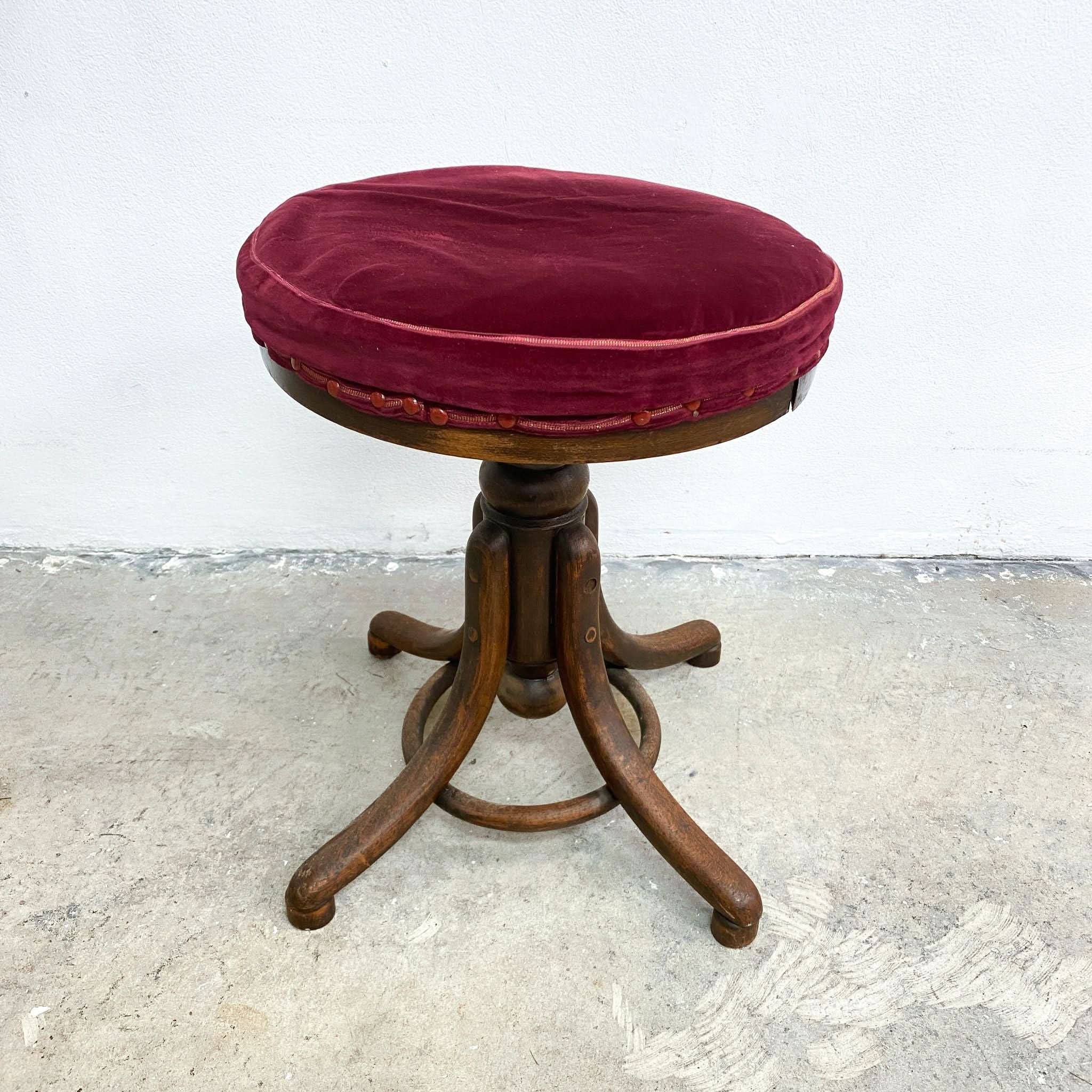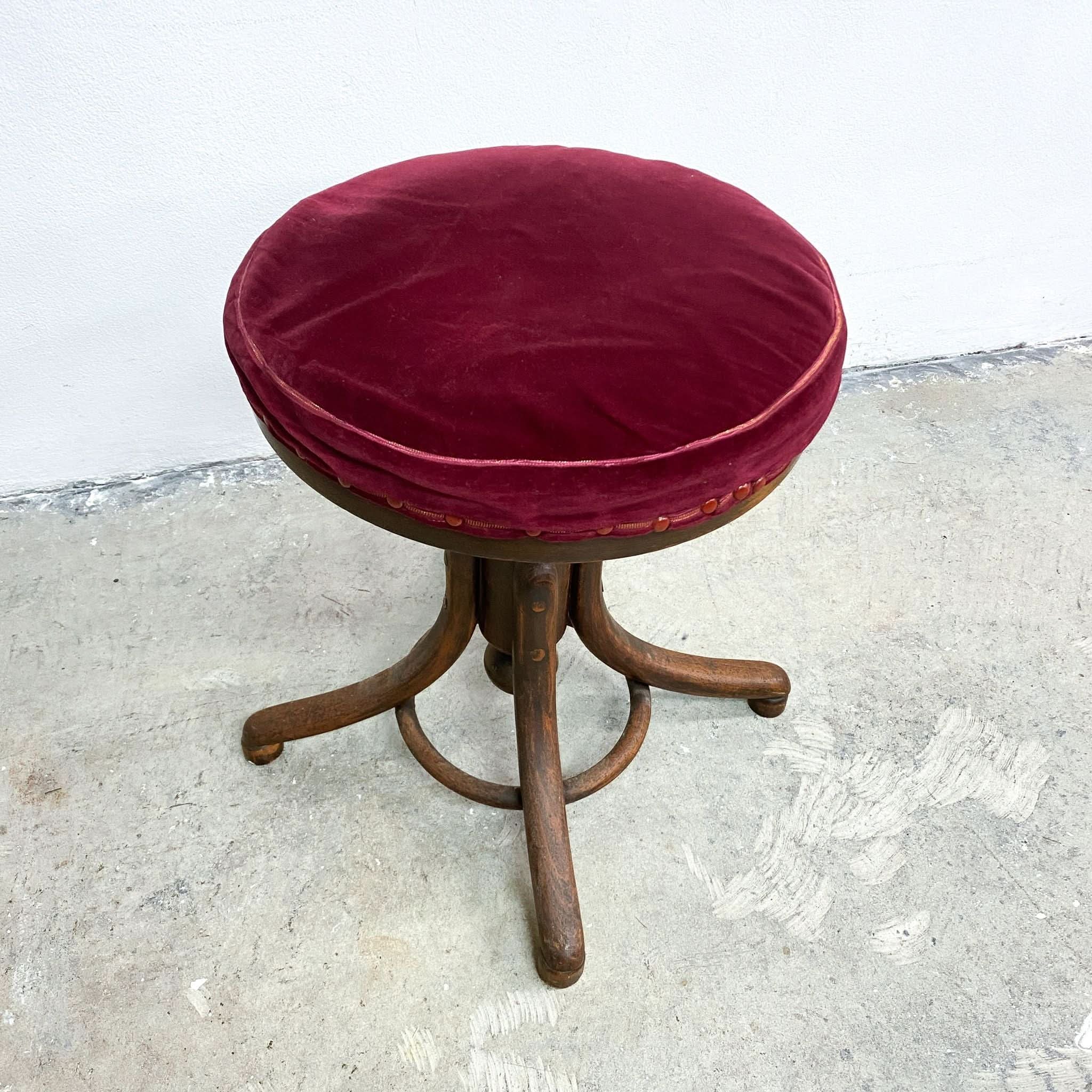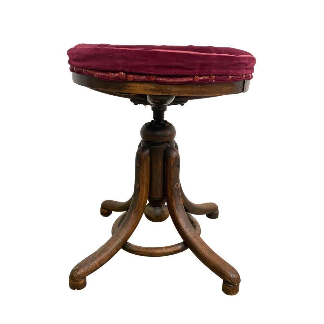 Charming antique bentwood swivel piano stool with ruby velvet upholstery. Excellent original condition, later upholstery.