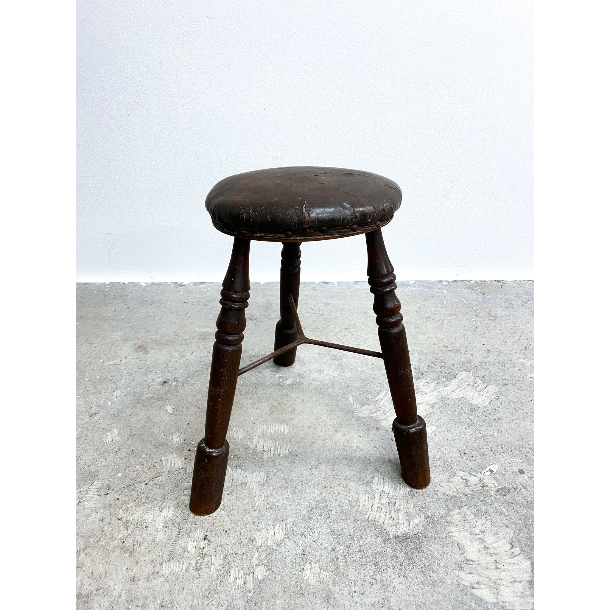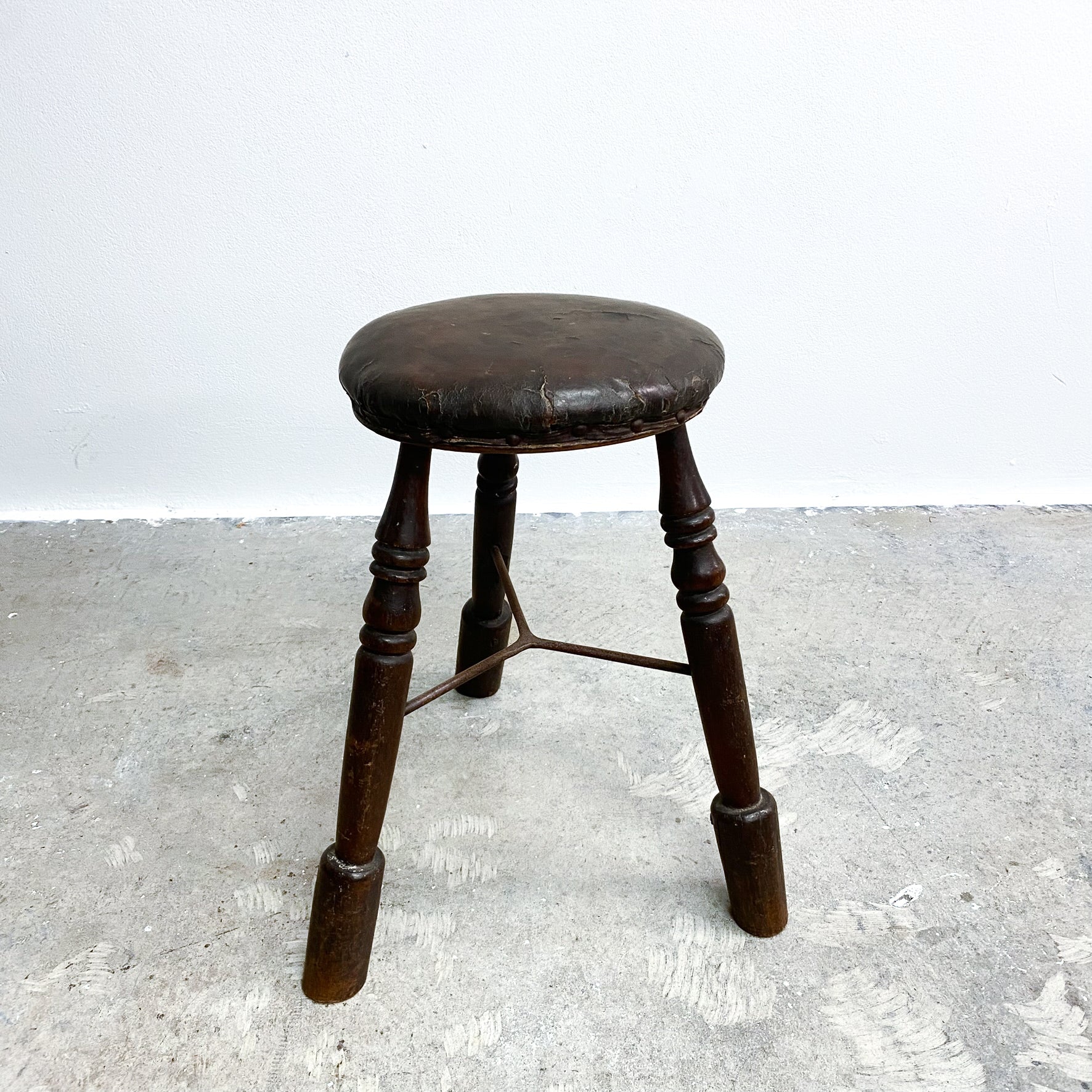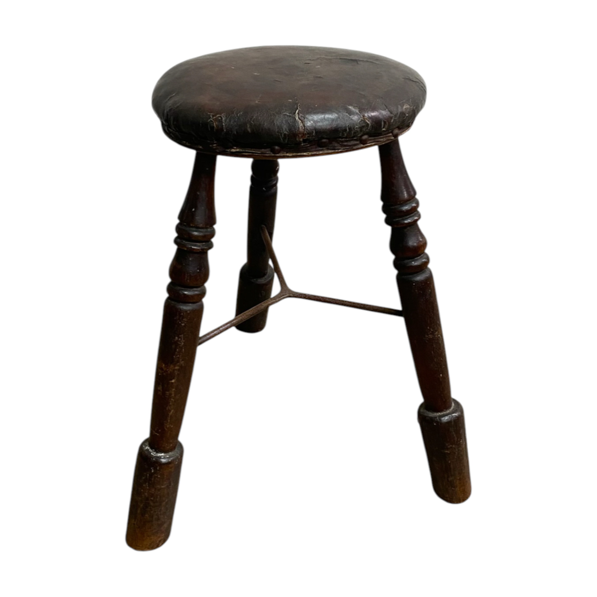Antique tri footed wooden stool with original leather top. Constructed with turned wooden legs and a thick leather seat with a deep and rich patina.