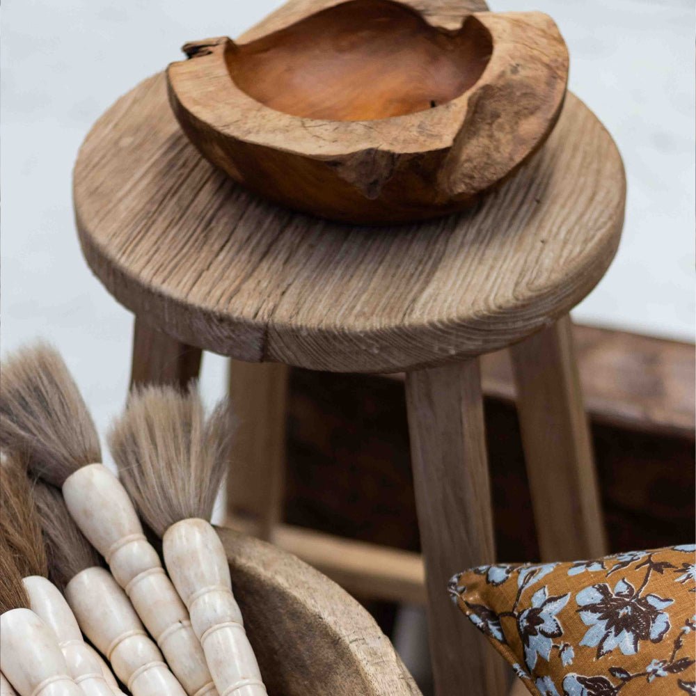 With a sturdy three-legged structure and traditional cross brace detailing, this stool is both functional and full of character. Whether used as casual seating, a bedside stand or a sculptural accent piece, it offers understated elegance and lasting strength. The aged timber carries subtle marks and variations that celebrate its past, making each piece entirely unique.