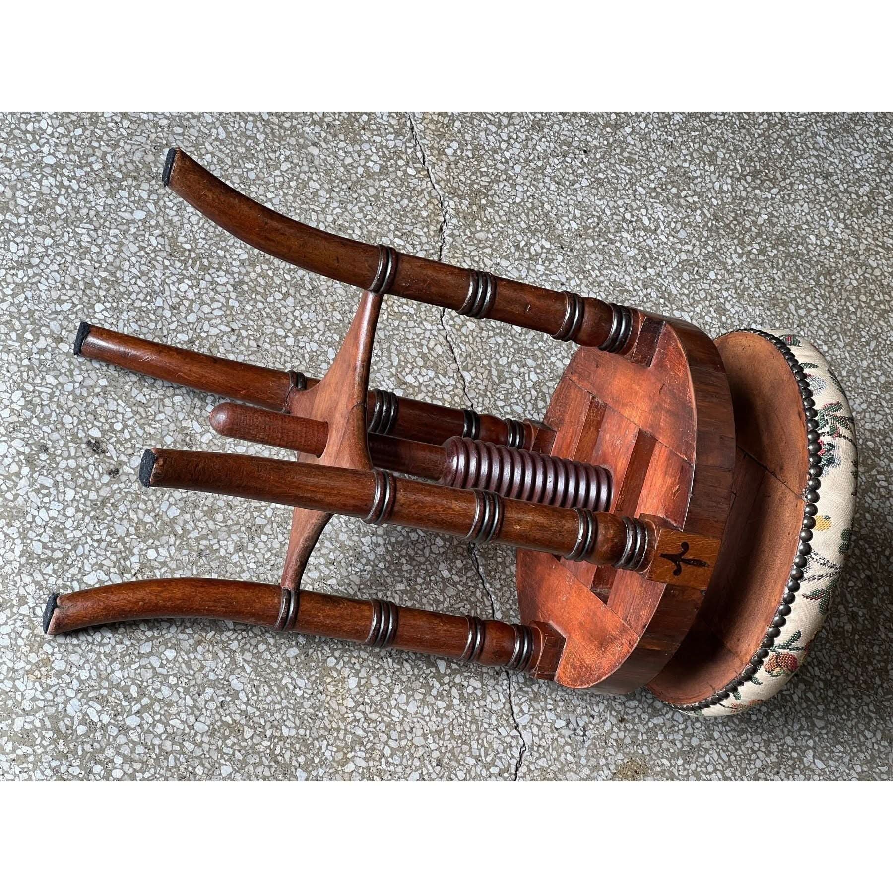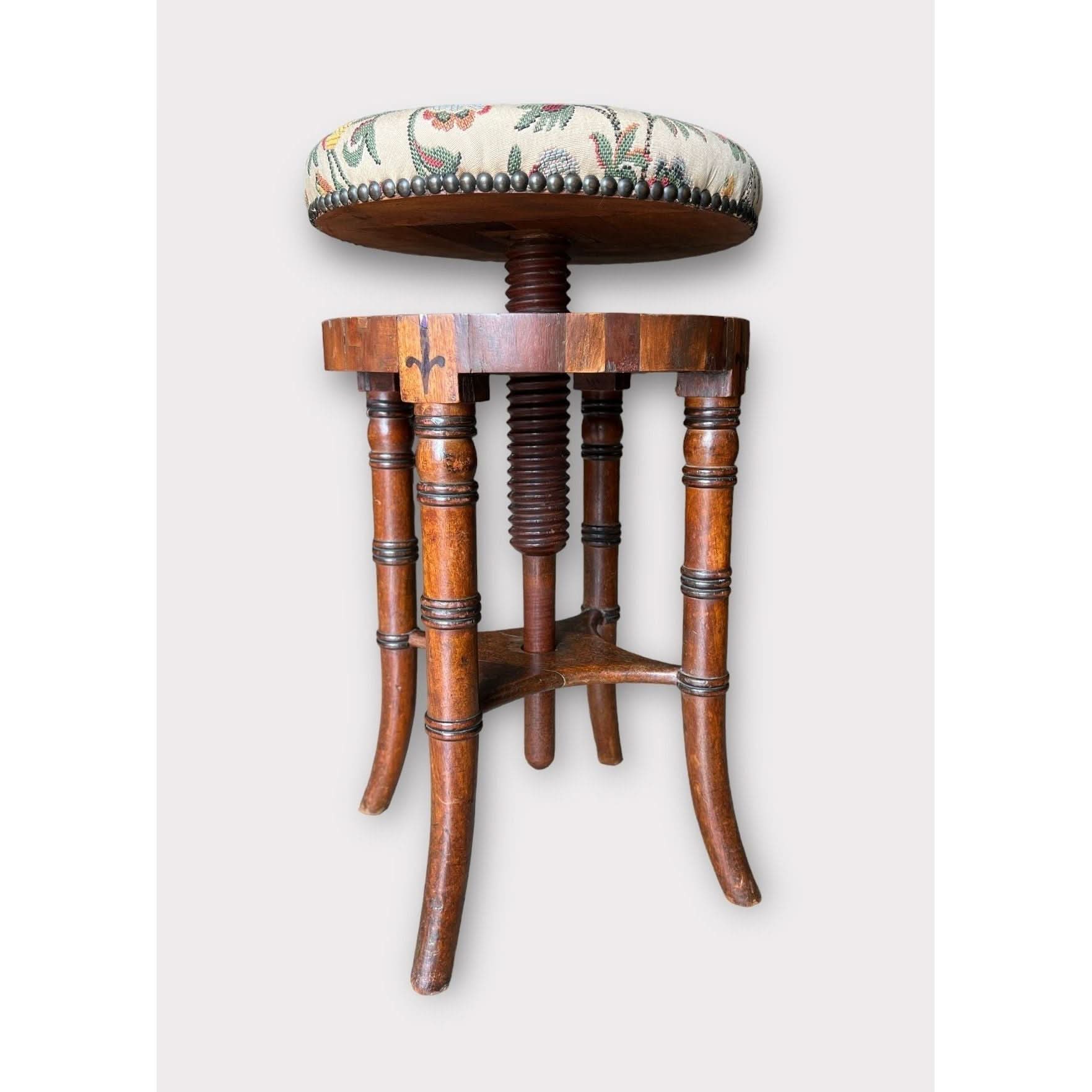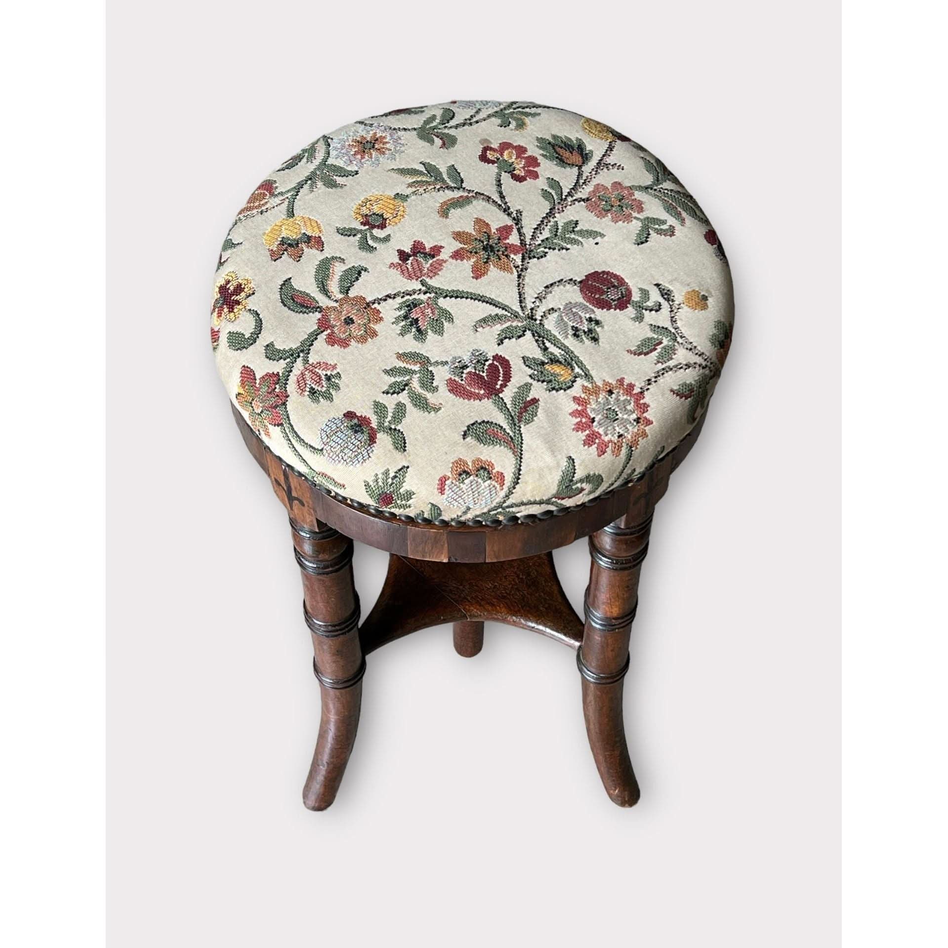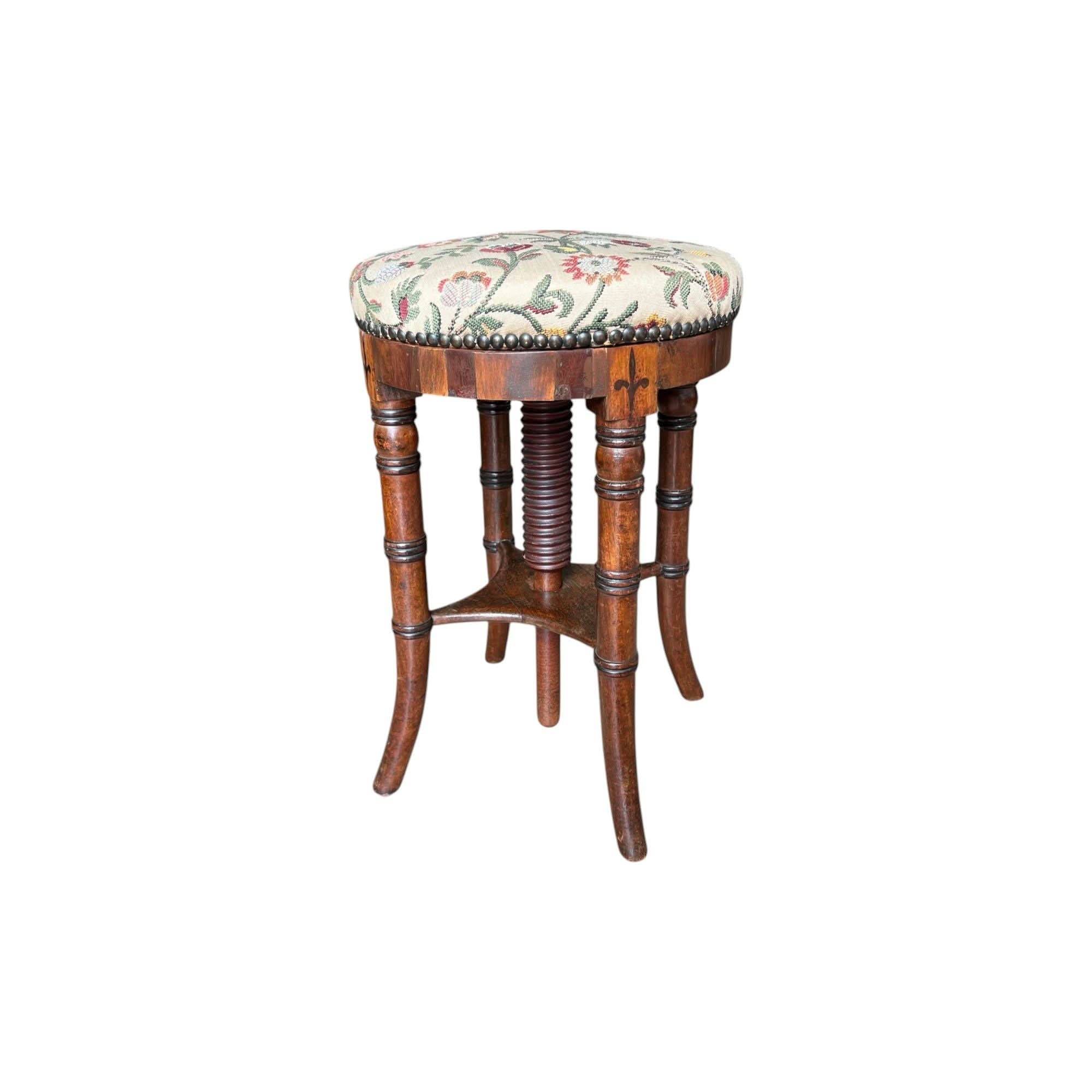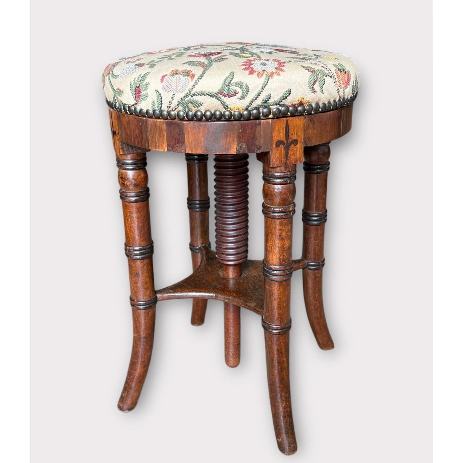 French piano stool, with four turned legs with rings to simulate, bamboo, the ends slightly splayed, a central stretcher supporting the wooden thread beneath the seat, the edge with inlaid 'fleur-de-lis' type motif in darker wood.