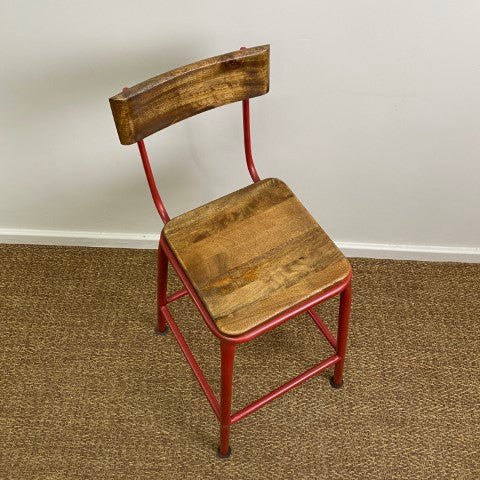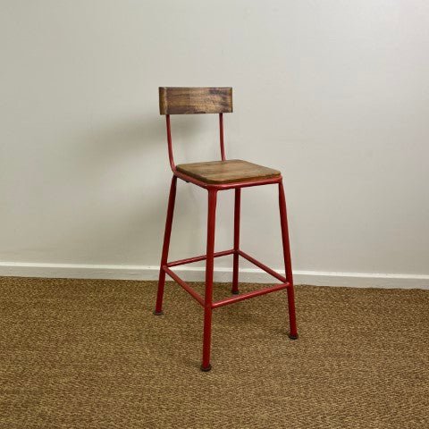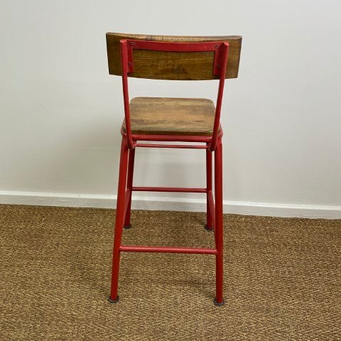 This red metal and timber barstool features a sturdy frame with a natural timber seat, combining industrial and rustic elements. Its vibrant red finish adds a bold accent to kitchens, bars, or dining areas.