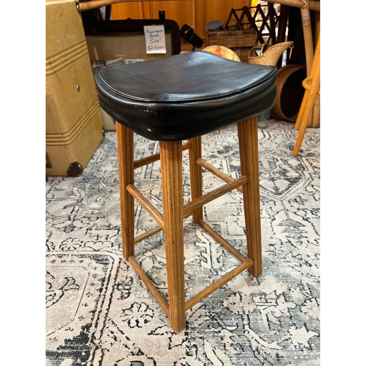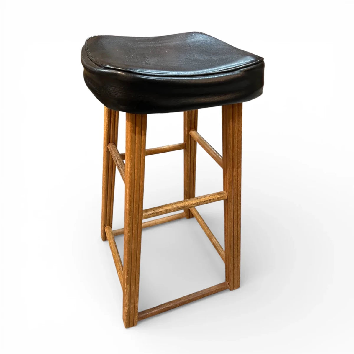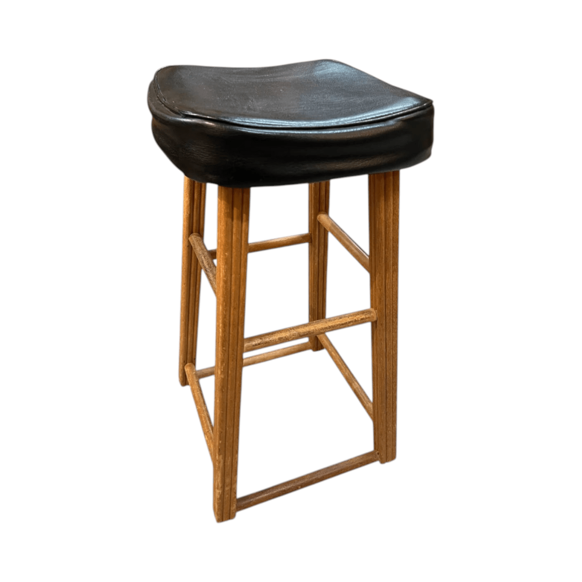 A great vintage timber stool featuring a solid warm-toned wooden frame and a classic black vinyl saddle seat. Simple, sturdy and full of mid-century character — perfect for a kitchen bench, bar area or workshop space.