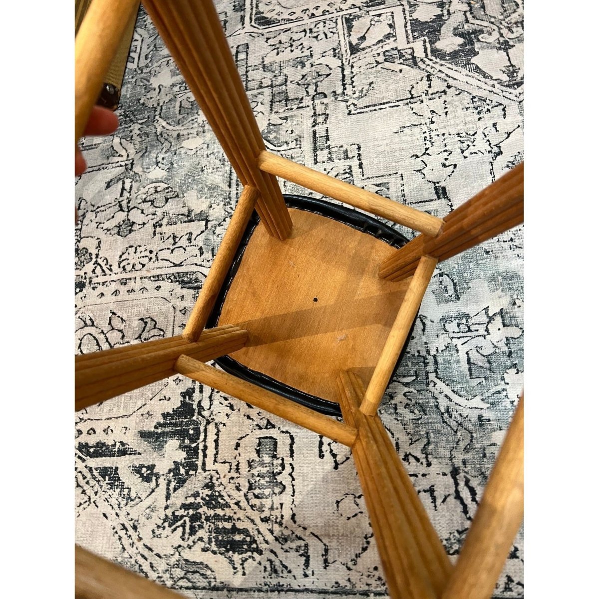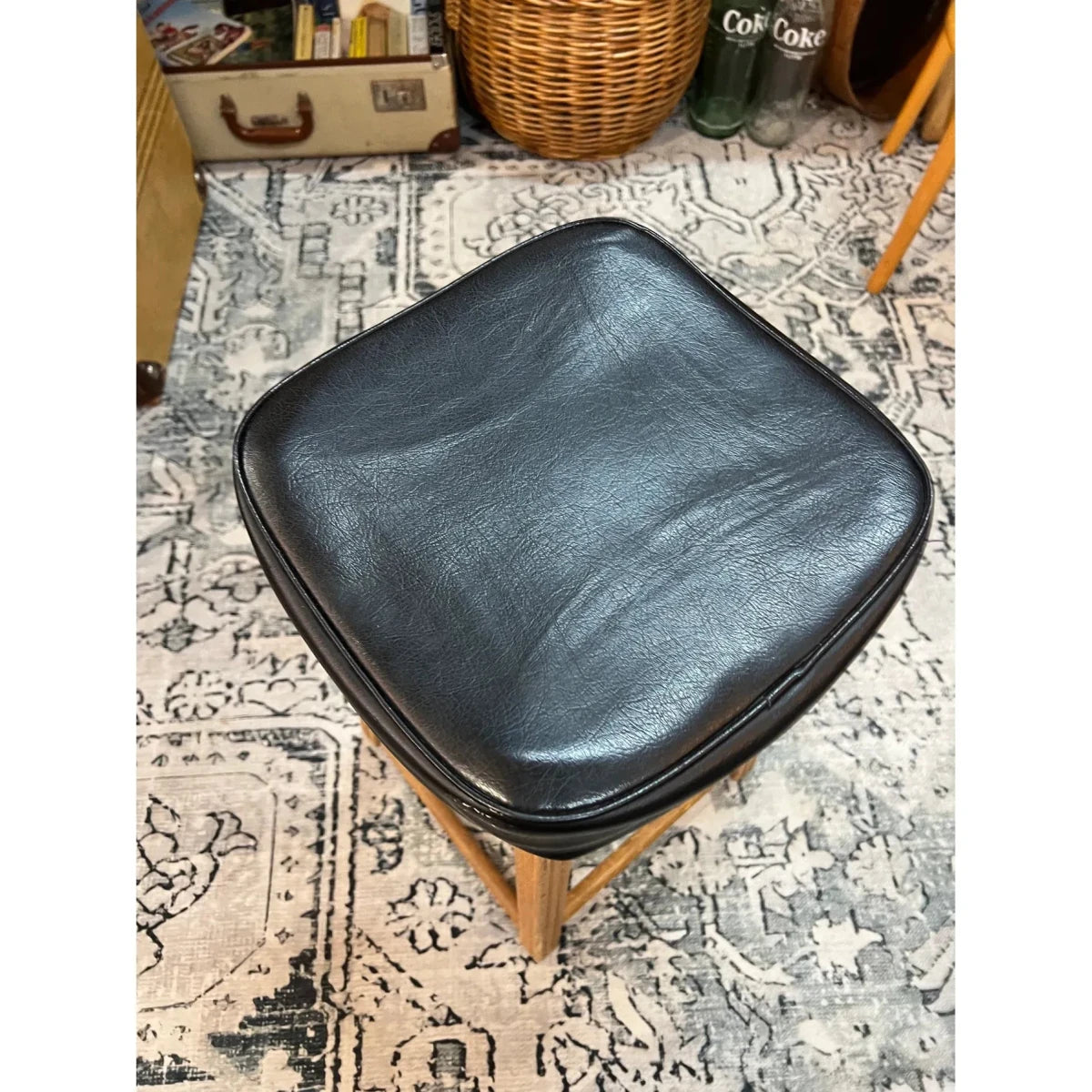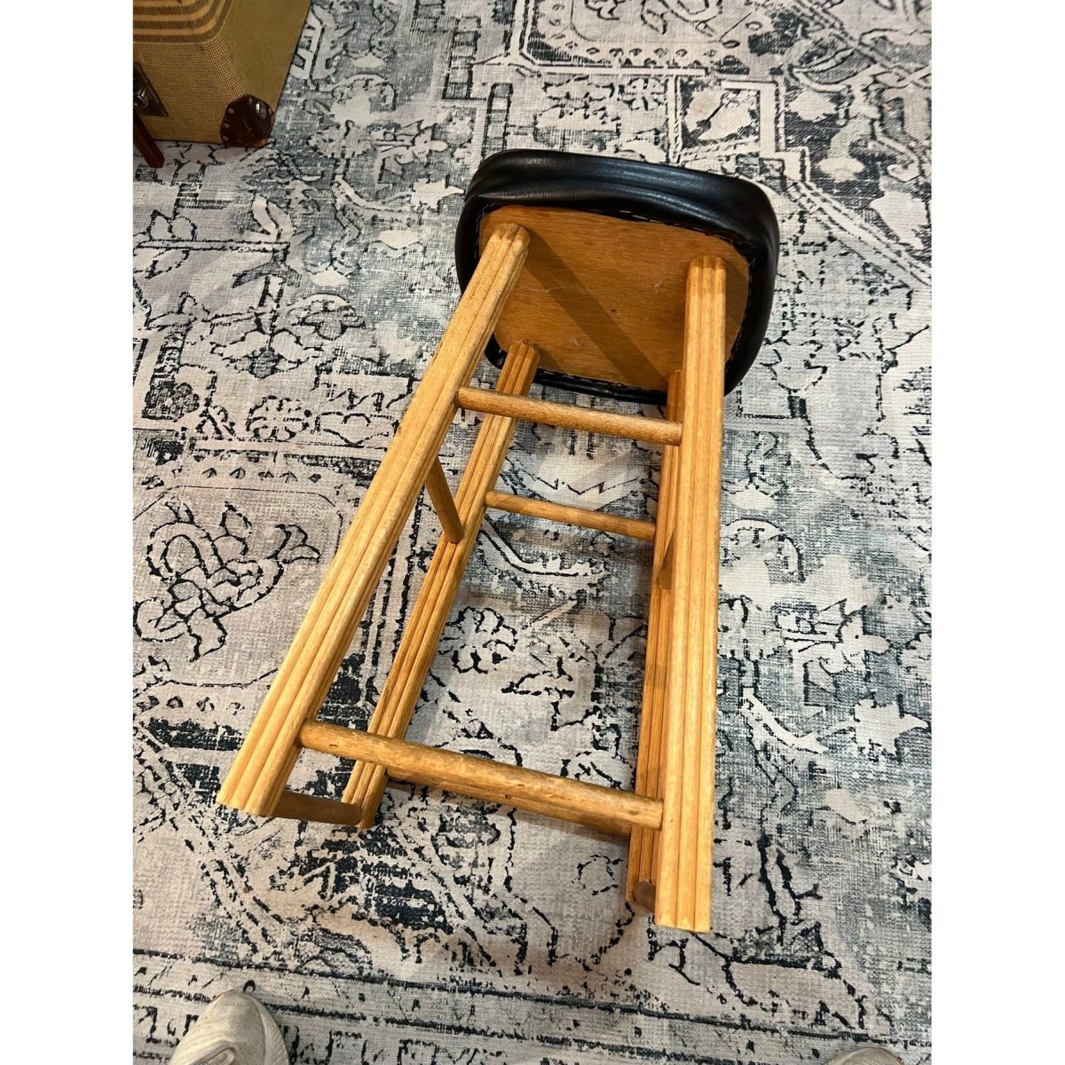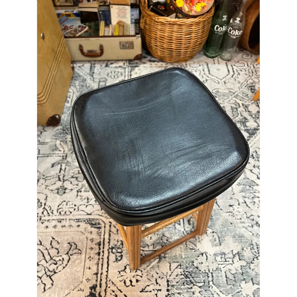 A great vintage timber stool featuring a solid warm-toned wooden frame and a classic black vinyl saddle seat. Simple, sturdy and full of mid-century character — perfect for a kitchen bench, bar area or workshop space.
