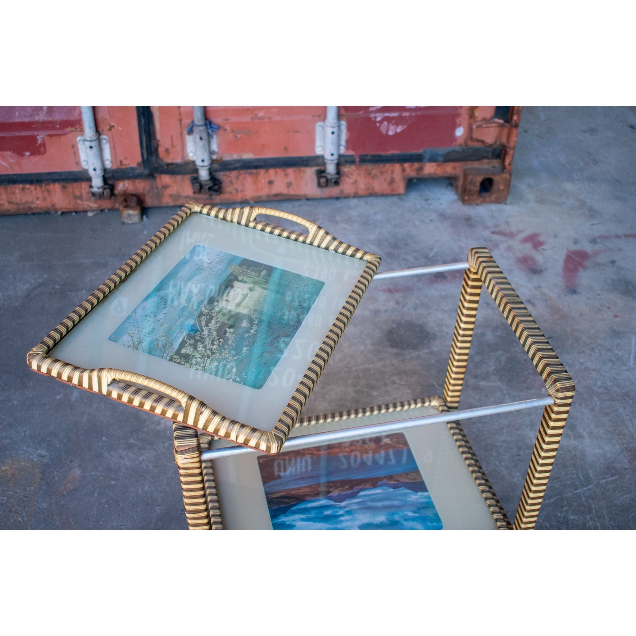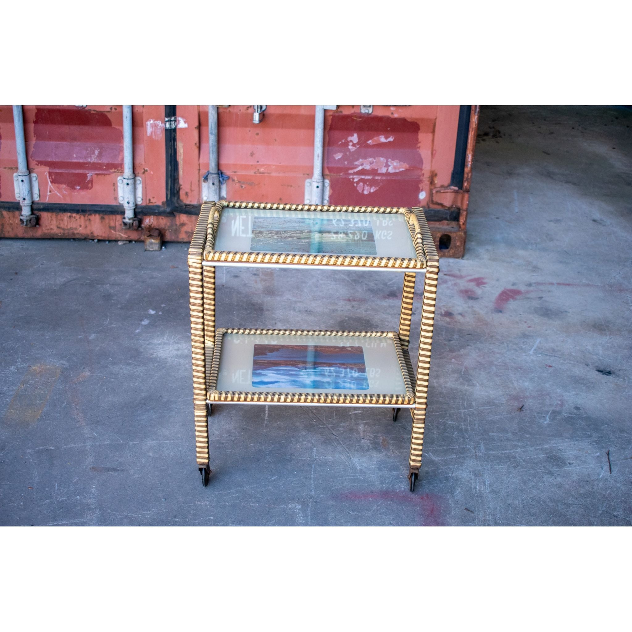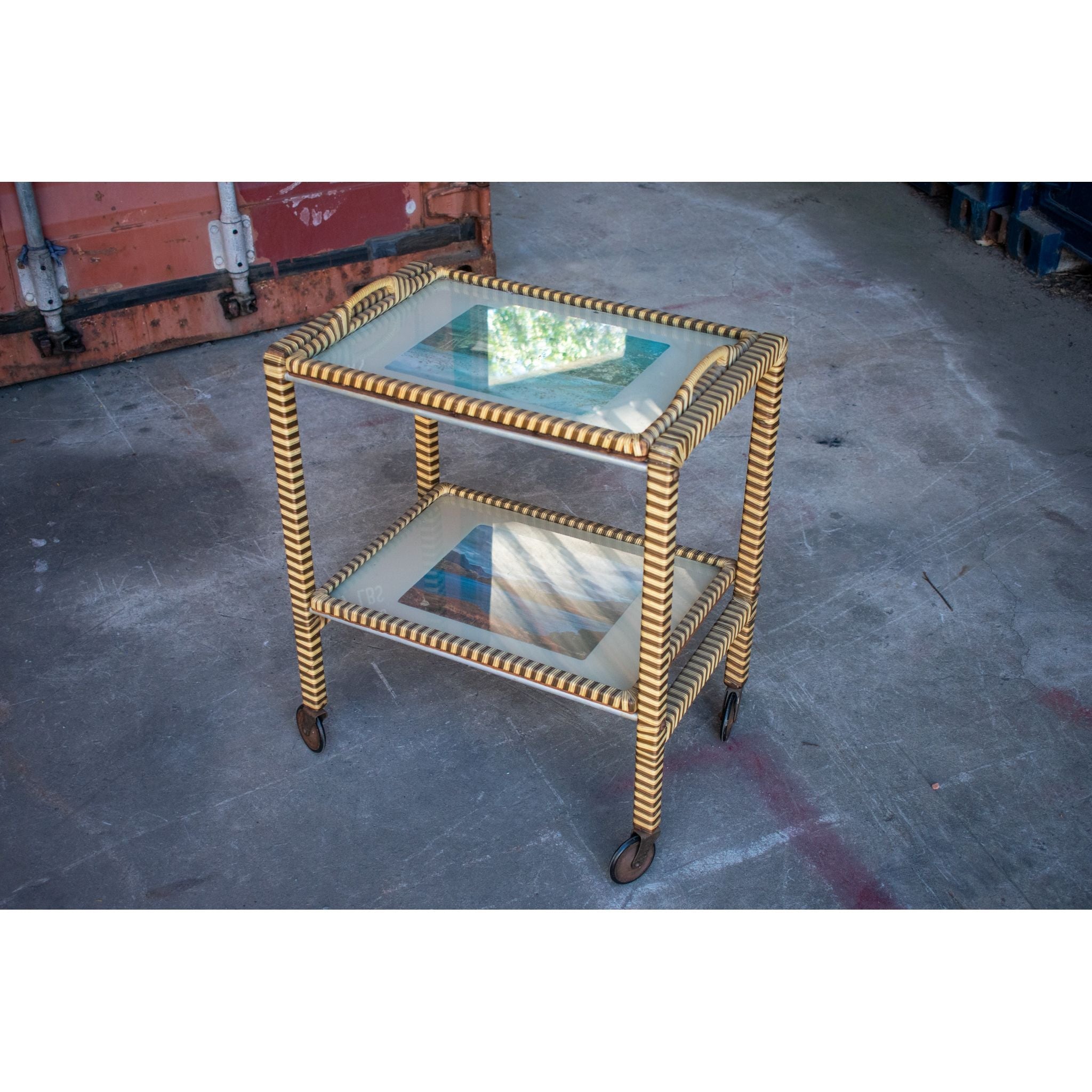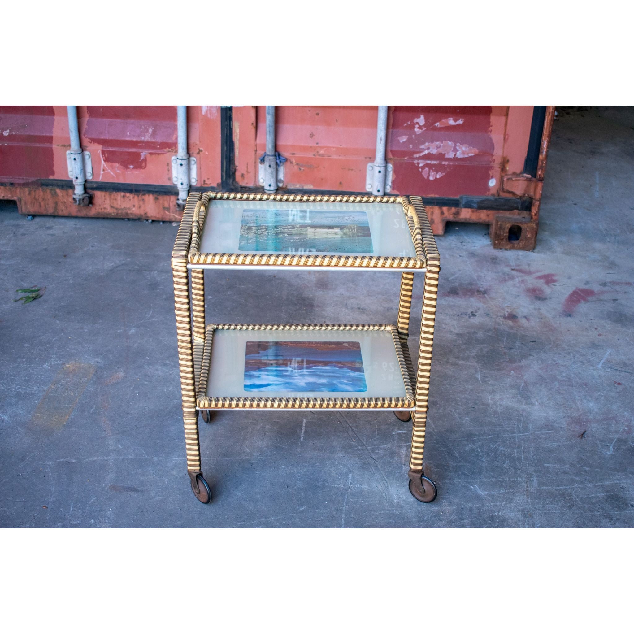 A cheerful mid-century rolling drinks trolley, English-made circa 1970s. The frame combines metal and timber with a playful black-and-gold striped finish. The top tier functions as a removable tray—perfect for serving or styling—and both levels feature glass panels with printed collage inlays.